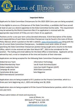 Lions of Illinois, Inc. State Secretary/Treasurer Position Applicants Needed