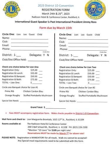 • Registration - The high level timeline and paper form are attached. You can also go to the District 1J website and register online. (district1jlions.org) All attendees must be registered, including those only attending Friday night. We have some fun times planned for all, and hope you join us to celebrate everyone's accomplishments this year. Deadline for convention registration with meals is Saturday, April 1st. (DGs, 1VDGs and 2VDGs should have received an email from your counterpart in 1J with this information and a special discount code.)