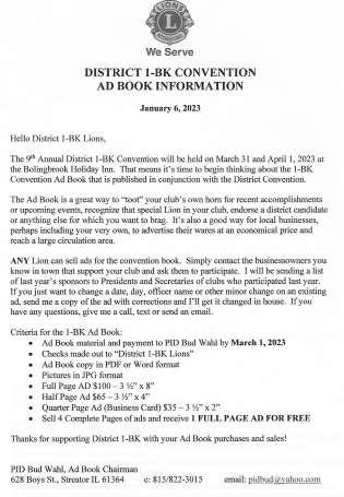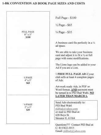 • Program Ads - If you are interested in placing an ad, information on sizes and pricing is attached. Contact PCC Jerome Perez at Lion_Jerry_Perez@hughes.net. Deadline for ad/page submissions is March 10th.