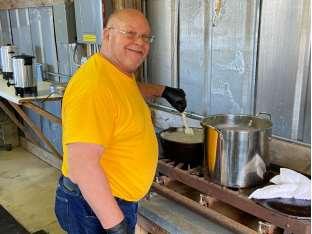 On Saturday September 3rd, the PoloLionsclub served biscuits and gravy, pork loin sandwiches, hamburgers, cheeseburgers, brats, hot dogs, cold drinks, coffee, chips and candy. In the pictures we have LionsmembersDougKnappstirring the gravy for the biscuits, Mike