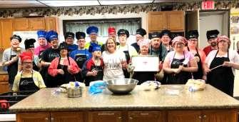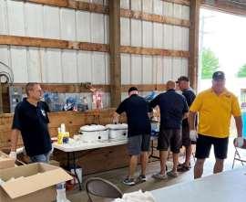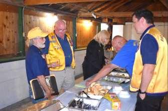 Several Lions gather at the serving table at the Southwest Region meeting which was hosted by Hinckley Lions Club. Shown on the far side of the table are (from left)