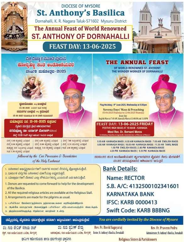 Dornahalli, Mysuru: The globally renowned St. Anthony's Basilica in Dornahalli is preparing to celebrate its Annual Feast of St. Anthony, the WonderWorker,onFriday,June13, 2025, with immense devotion and spiritualsplendour.