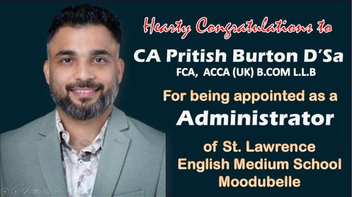 Congratulations to my friend CA Pritish Burton D'Sa on his appointment as the Administrator of St. Lawrence English Medium School,Moodubelle!