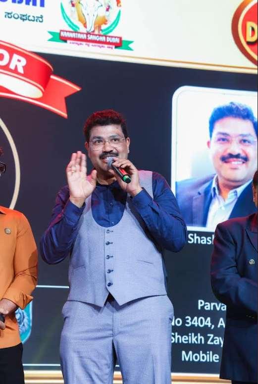 SaionPropertiesMDPraveenKumar Amarnath, Acme MD Harish Sherigar and Sandalwood celebrity actor, dancer Prithvi Ambar and other dignitaries along with Karnataka Sangha Dubai President Shashidhar Nagarajappa, Vice President Daya Kirodian, General Secretary Manohar Hegde, Joint Secretary Mallikarjuna Gowda,