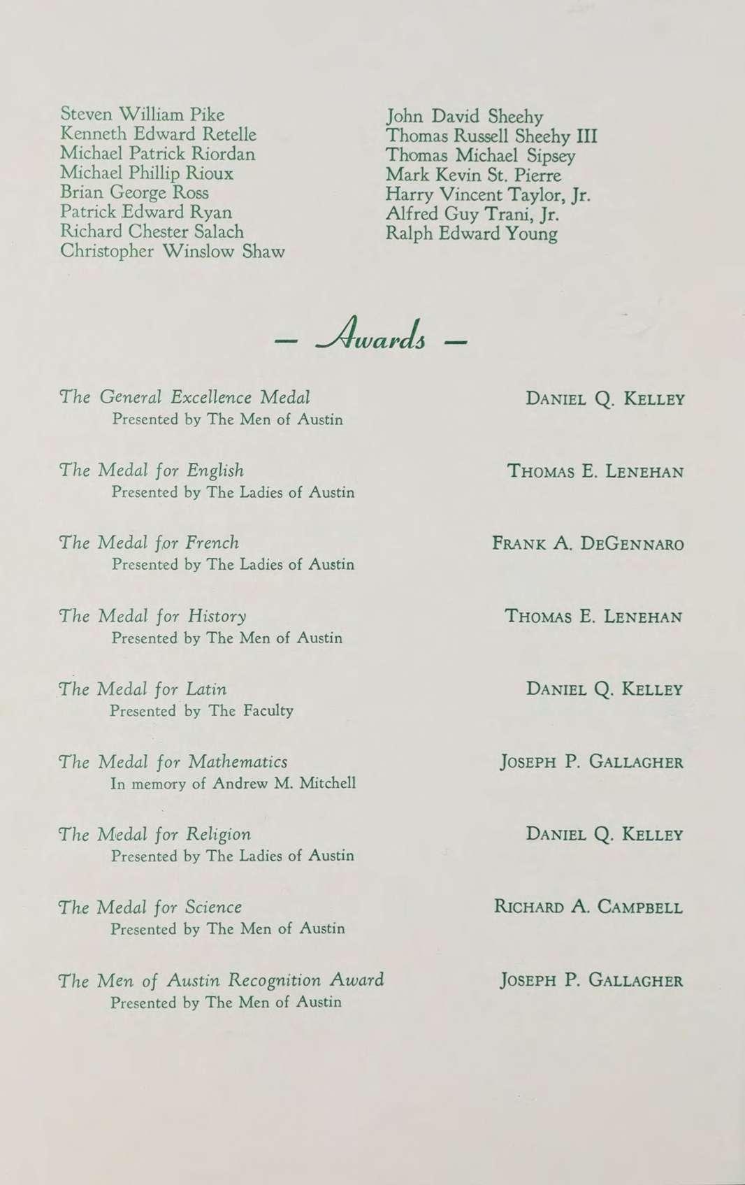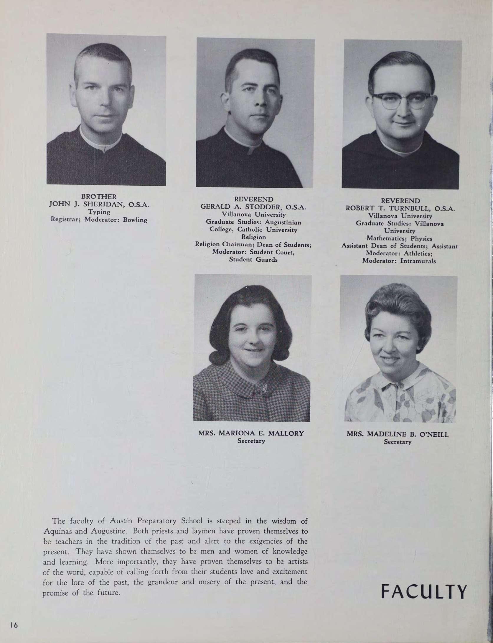 The faculty of Austin Preparatory School is steeped in the wisdom of Aquinas and Augustine. Both priests and laymen have proven themselves to be teachers in the tradition of the past and alert to the exigencies of the present. They have shown themselves to be men and women of knowledge and learning. More importantly, they have proven themselves to be artists of the word, capable of calling forth from their students love and excitement for the lore of the past, the grandeur and misery of the present, and the promise of the future.