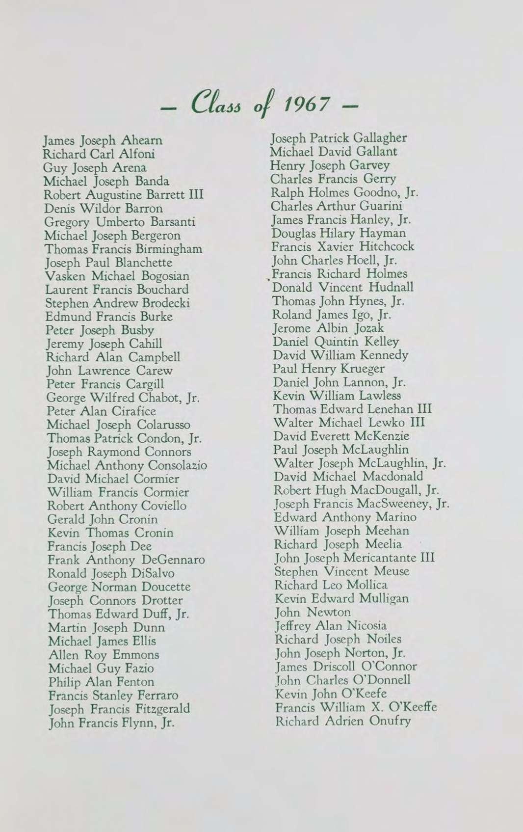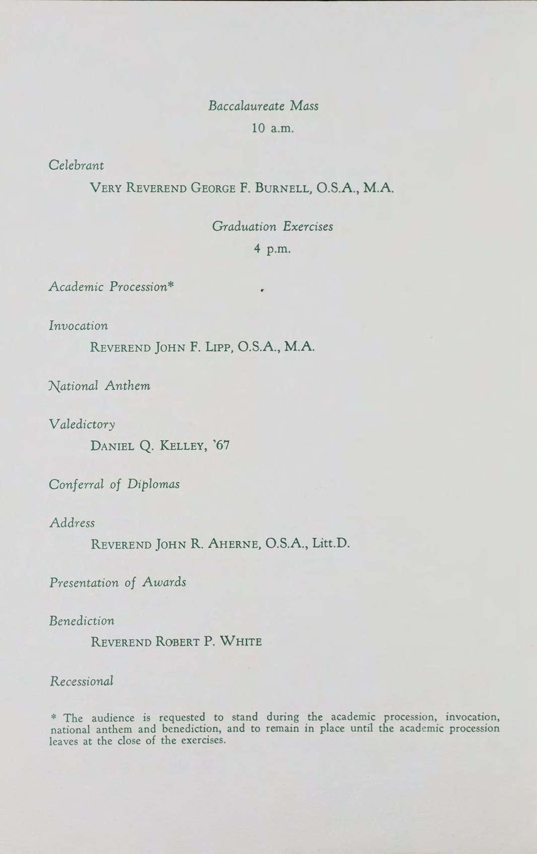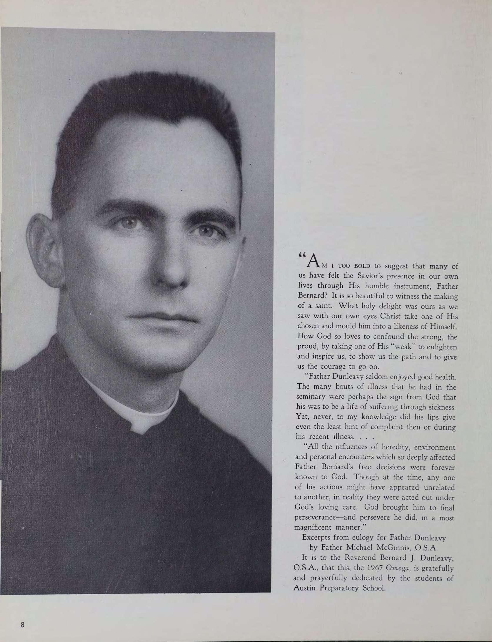 Excerpts from eulogy for Father Dunleavy by Father Michael McGinnis, O.S.A. It is to the Reverend Bernard J. Dunleavy, O.S.A., that this, the 1967 Omega, is gratefully and prayerfully dedicated by the students of Austin Preparatory School.