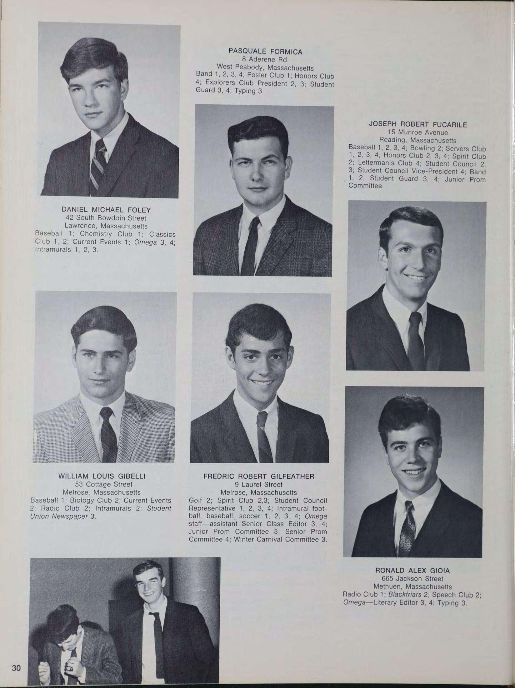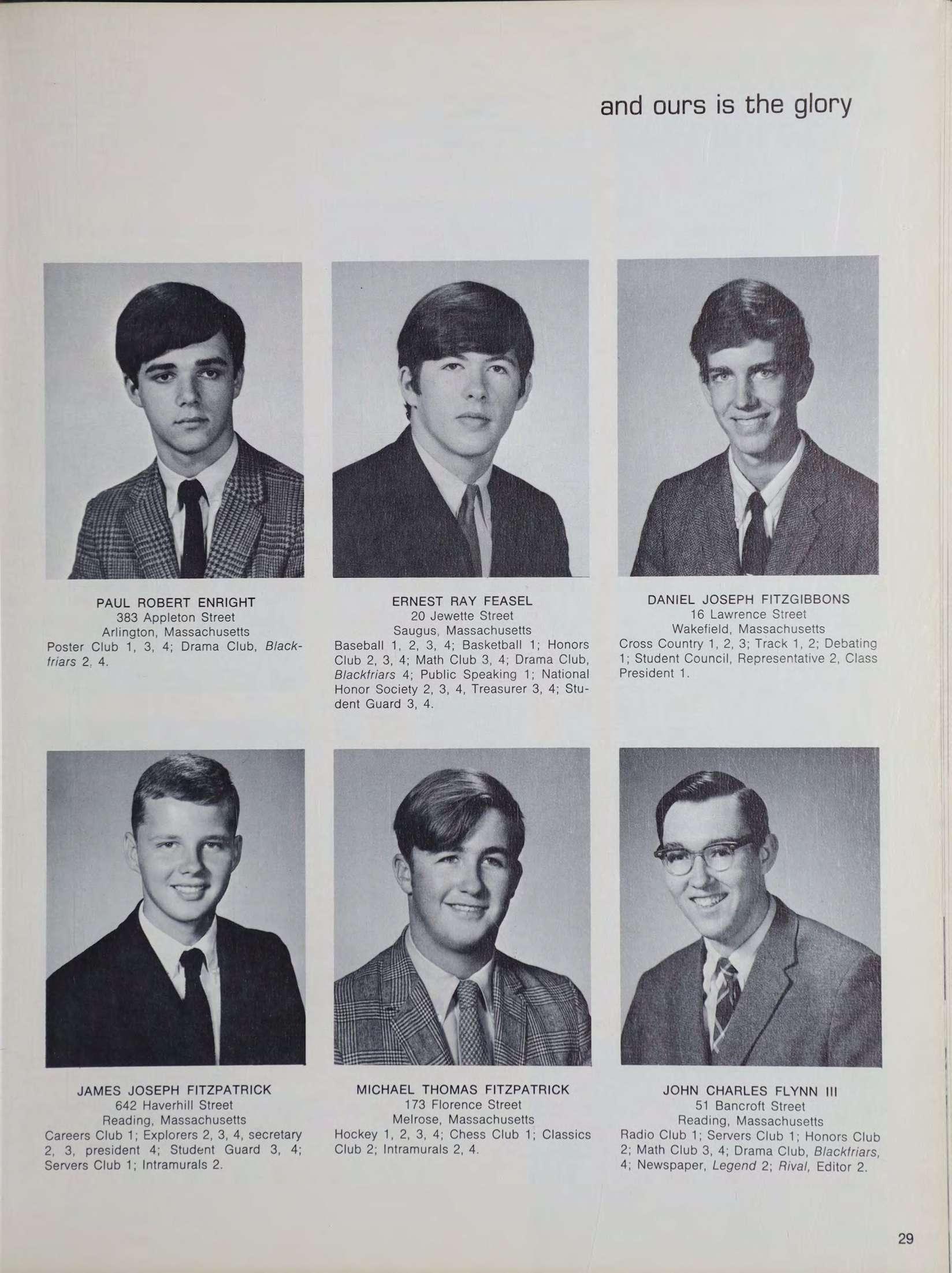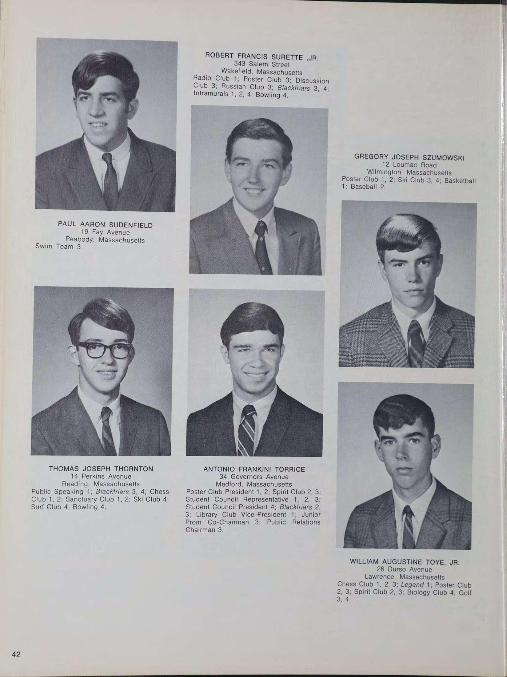 FRANKINI TORRICE 14 Perkins Avenue 34 Governors Avenue Reading, Massachusetts Medford, Massachusetts Public Speaking 1; Blackfriars 3, 4; Chess Poster Club President 1, 2; Spirit Club 2, 3; Club 1, 2; Sanctuary Club 1, 2; Ski Club 4; Student Council Representative 1, 2, S: Surf Club 4; Bowling 4. Student Council President 4; Blackfriars 2, 3; Library Club Vice-President 1; Junior Prom Co-Chairman 3; Public Relations Chairman 3.