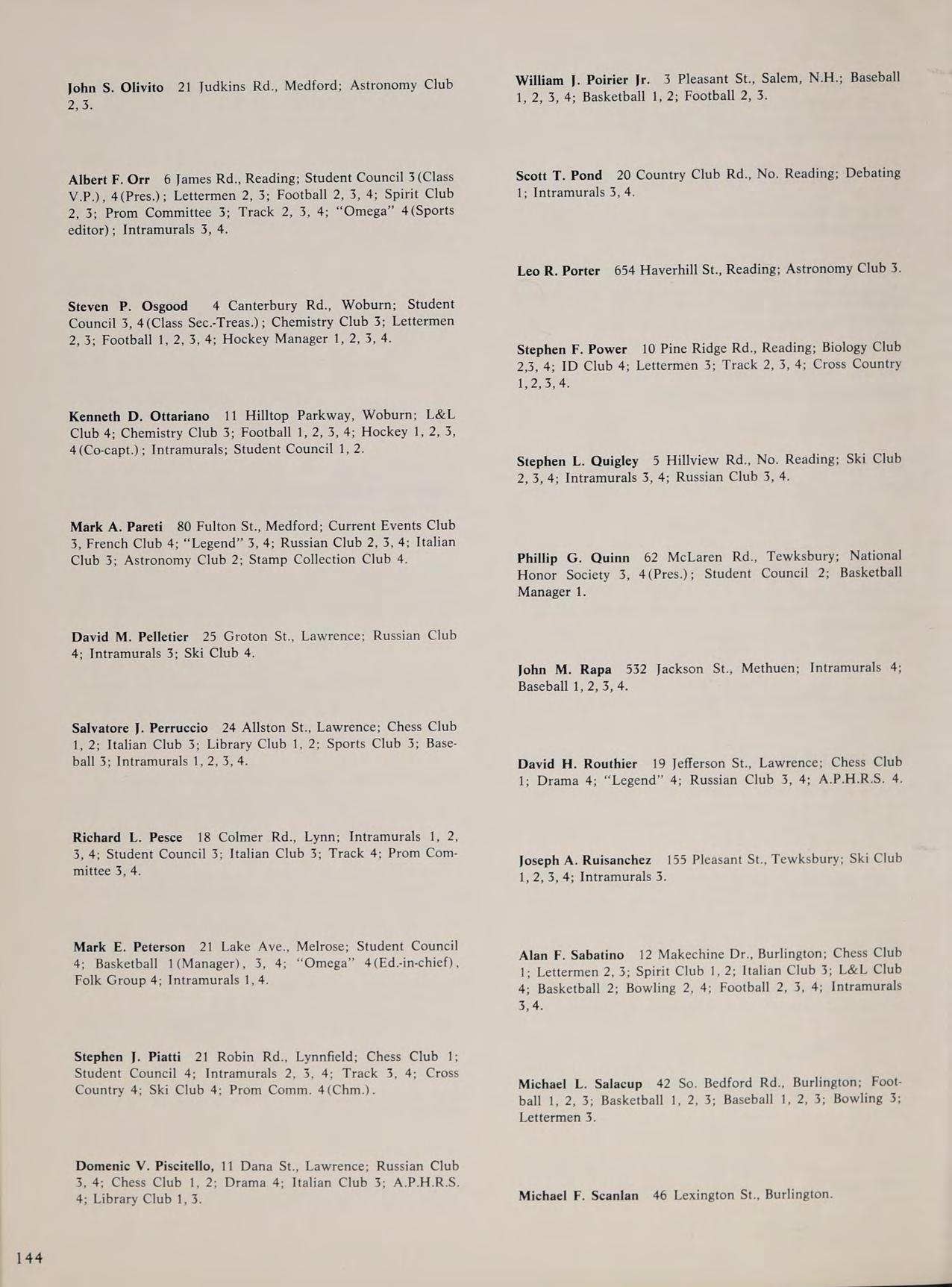 Stephen J. Piatti 21 Robin Rd., Lynnfield; Chess Club 1; Student Council 4; Intramurals 2, 3, 4; Track 3, 4; Cross Country 4; Ski Club 4; Prom Comm. 4(Chm.).