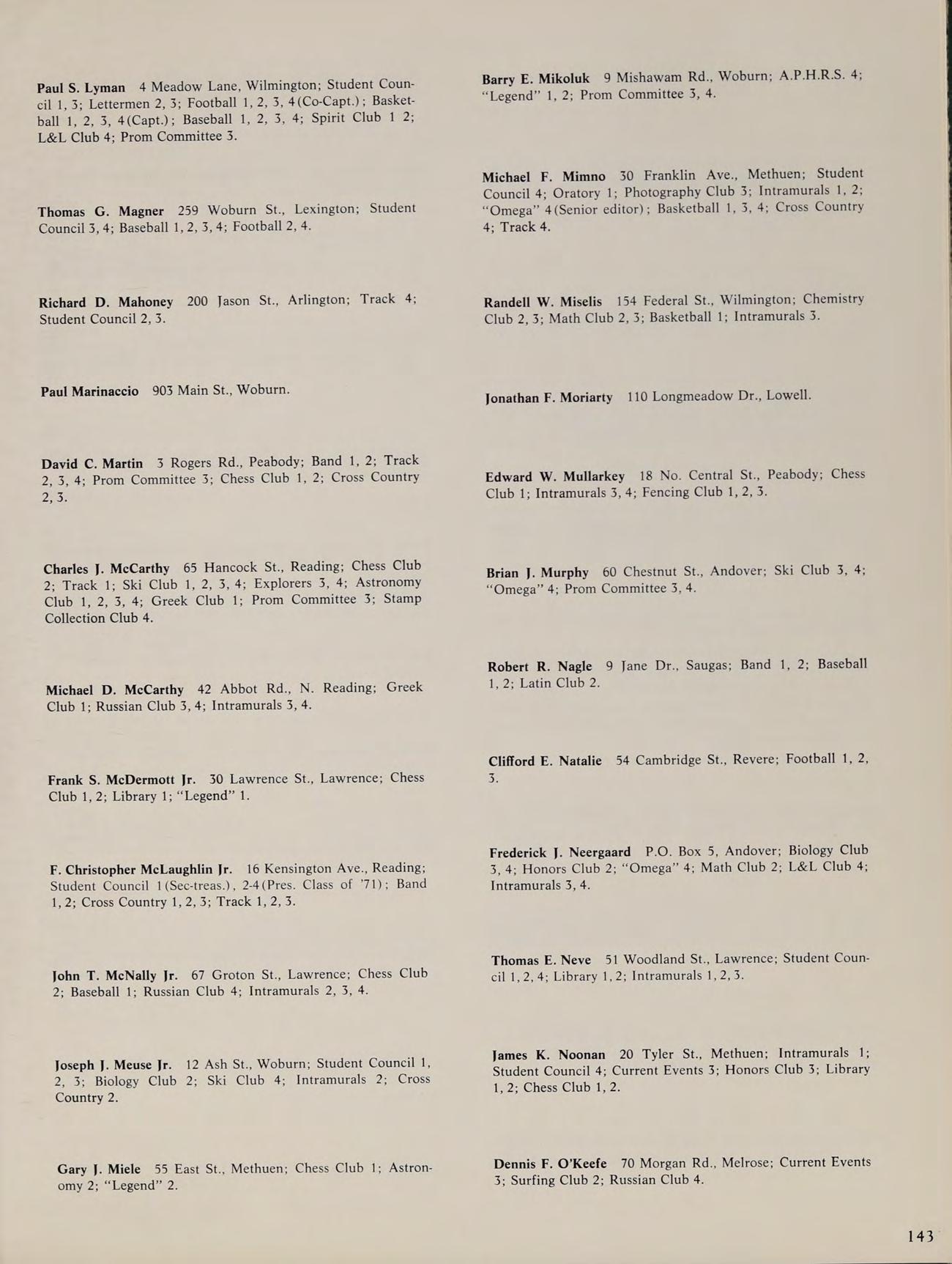 Michael J. White 3 Park Dr., North Reading; National Honor Society 2, 3, 4; Student Council 4; Lettermen 3, 4; Math Club 2, 3, 4; “Omega” 4; Honors Club 2, 3, 4; Explorers 3, 4; Spanish Club 3; Cross Country 1, 2, 3, 4; Track 1, 2, 3, 4; Folk Group 4.