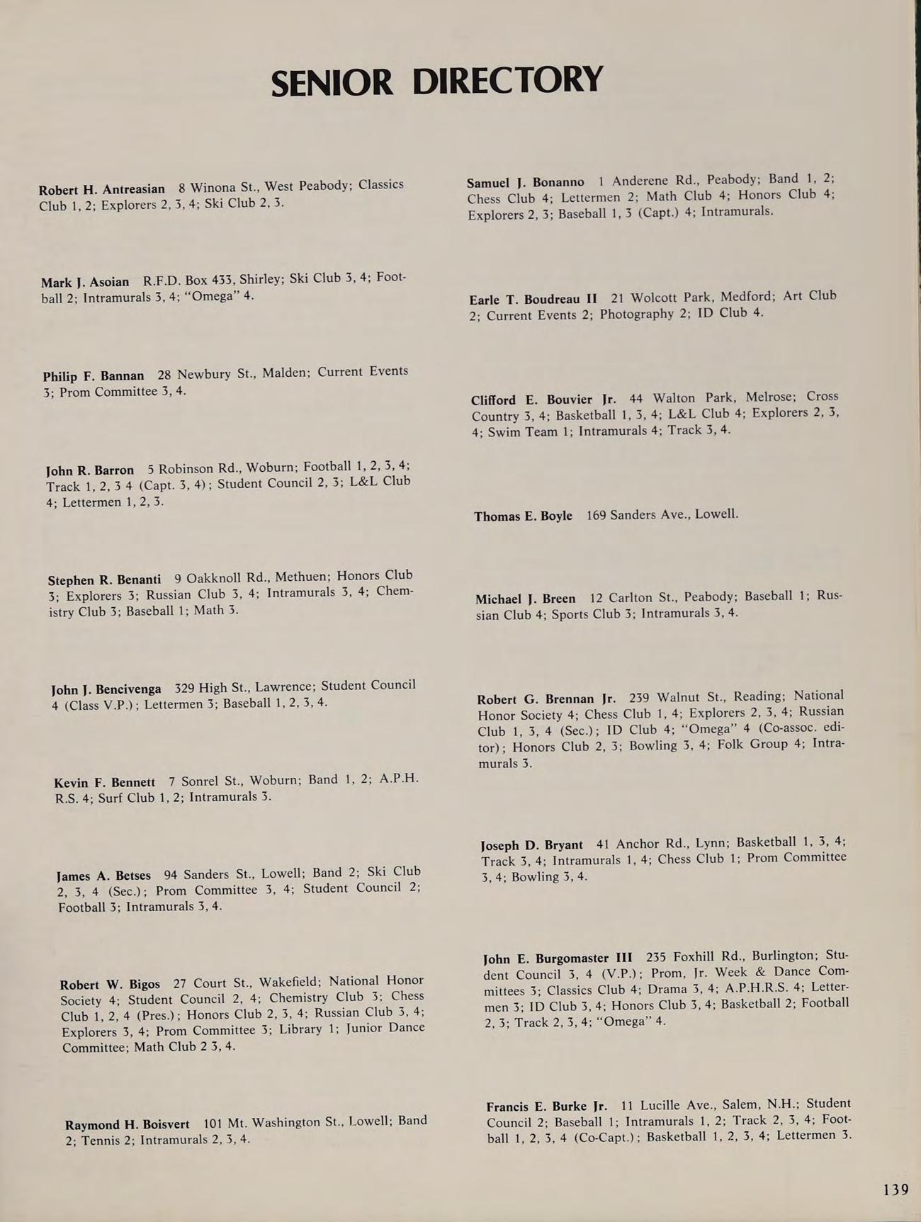 David B. Sidon 15 Chochrane Cir., Methuen; Biology Club 2; Chemistry Club 3; Chess Club 2; “Legend” 1, 2; Russian 3, 4; Intramurals 3, 4.