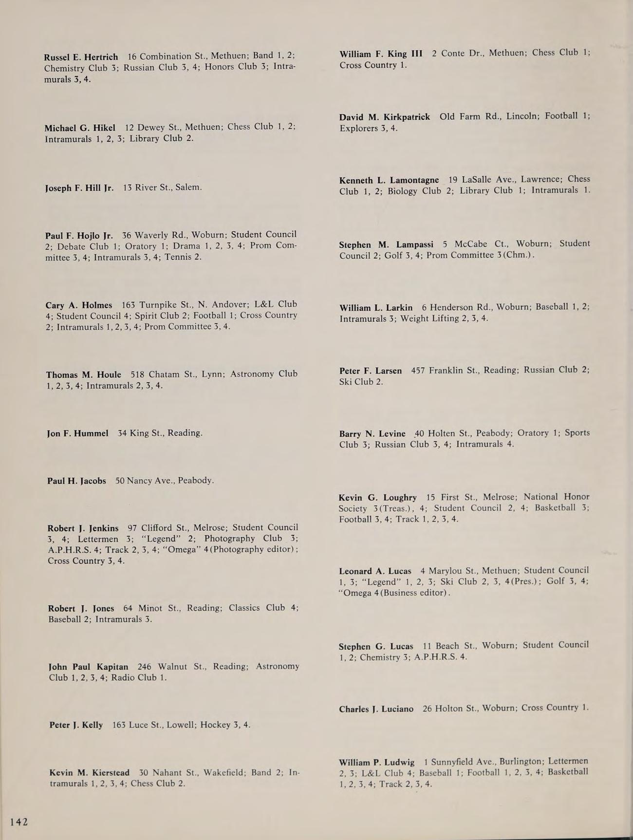 Charles T. Trocki 56 Border Rd., Reading; Biology Club 2, 3(Pres.); Photography 3; Explorers 2, 3, 4; ID Club 4; Folk Group 4; “Omega” 4(Photography Ed.).