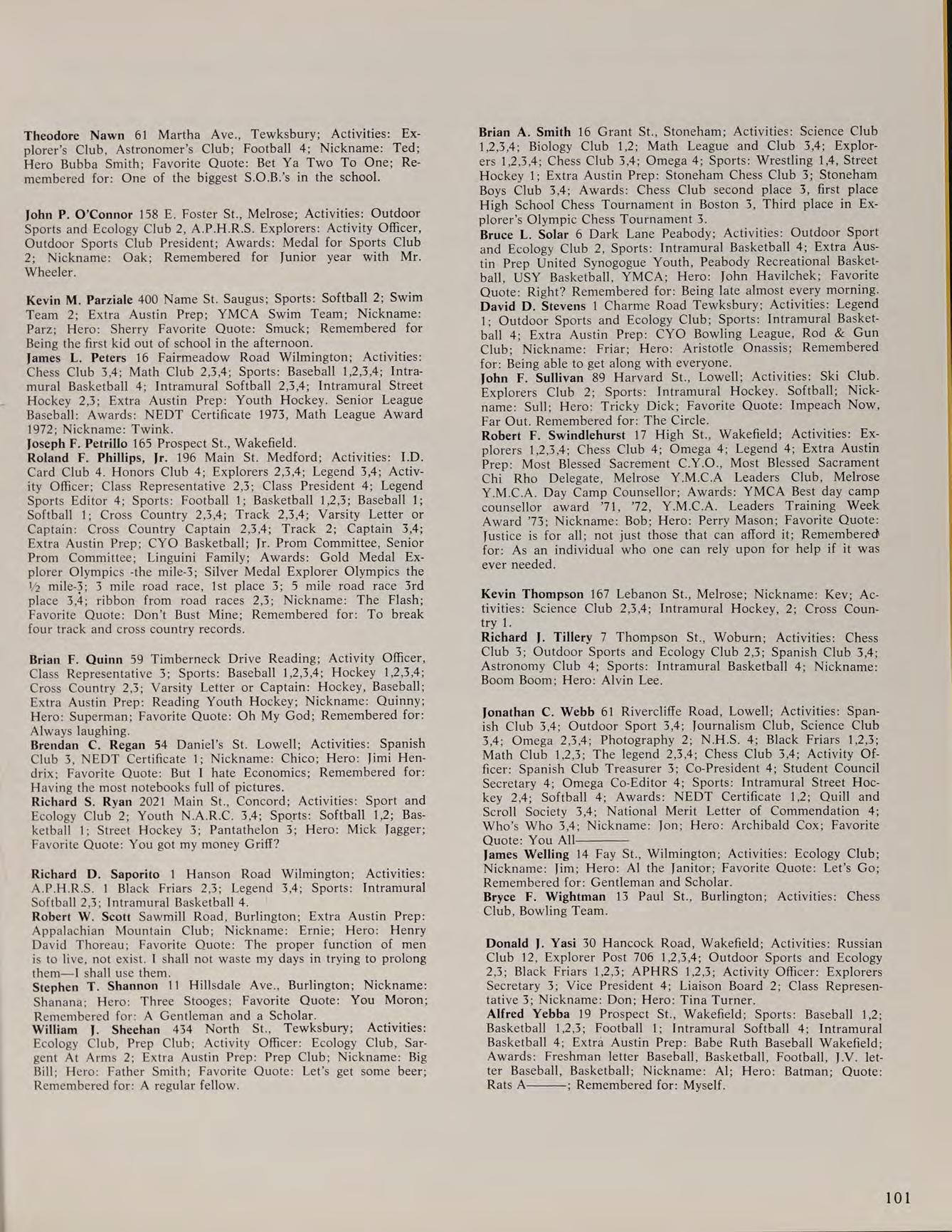 Brian A. Smith 16 Grant St., Stoneham; Activities: Science Club 1,2,3,4; Biology Club 1,2; Math League and Club 3,4; Explorers 1,2,3,4; Chess Club 3,4; Omega 4; Sports: Wrestling 1,4, Street Hockey 1; Extra Austin Prep: Stoneham Chess Club 3; Stoneham Boys Club 3,4; Awards: Chess Club second place 3, first place High School Chess Tournament in Boston 3, Third place in Explorer’s Olympic Chess Tournament 3.