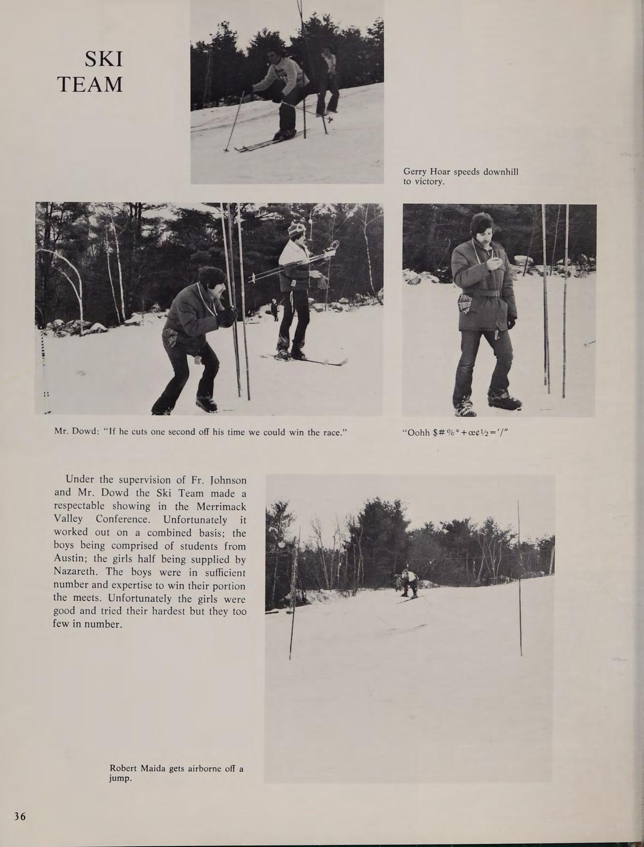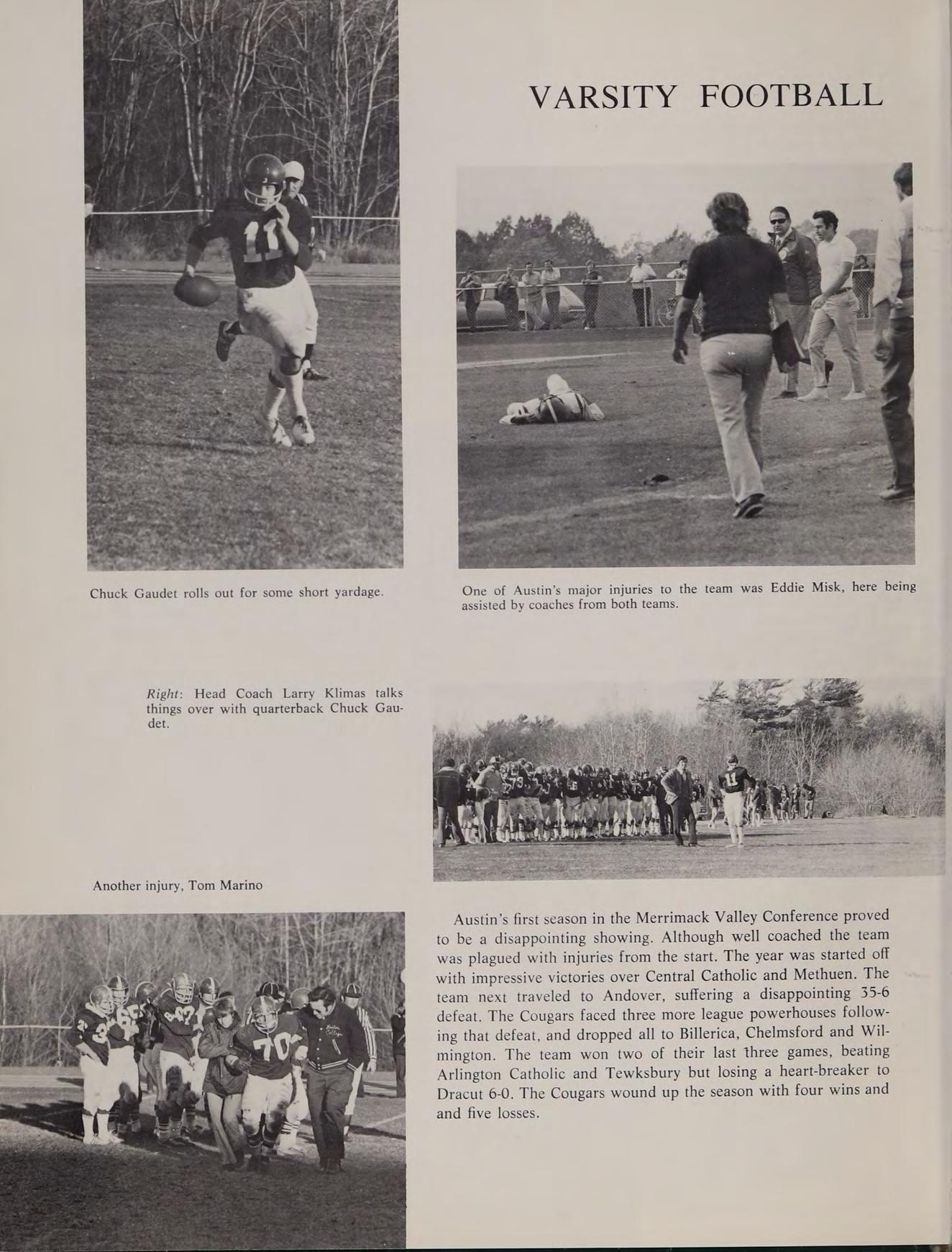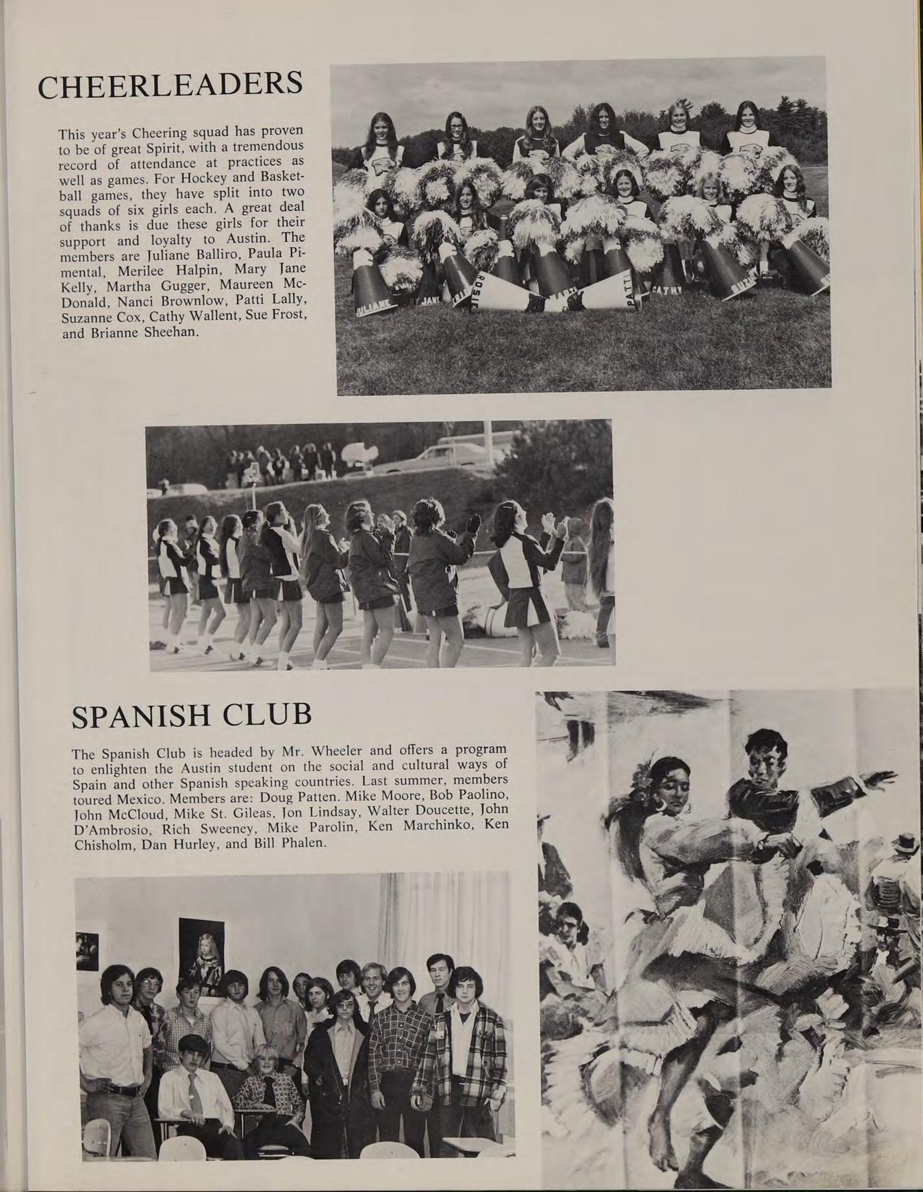 This year’s Cheering squad has proven to be of great Spirit, with a tremendous record of attendance at practices as well as games. For Hockey and Basketball games, they have split into two squads of six girls each. A great deal of thanks is due these girls for their support and loyalty to Austin. The members are Juliane Balliro, Paula Pimental, Merilee Halpin, Mary Jane Kelly, Martha Gugger, Maureen McDonald, Nanci Brownlow, Patti Lally, Suzanne Cox, Cathy Wallent, Sue Frost, and Brianne Sheehan.