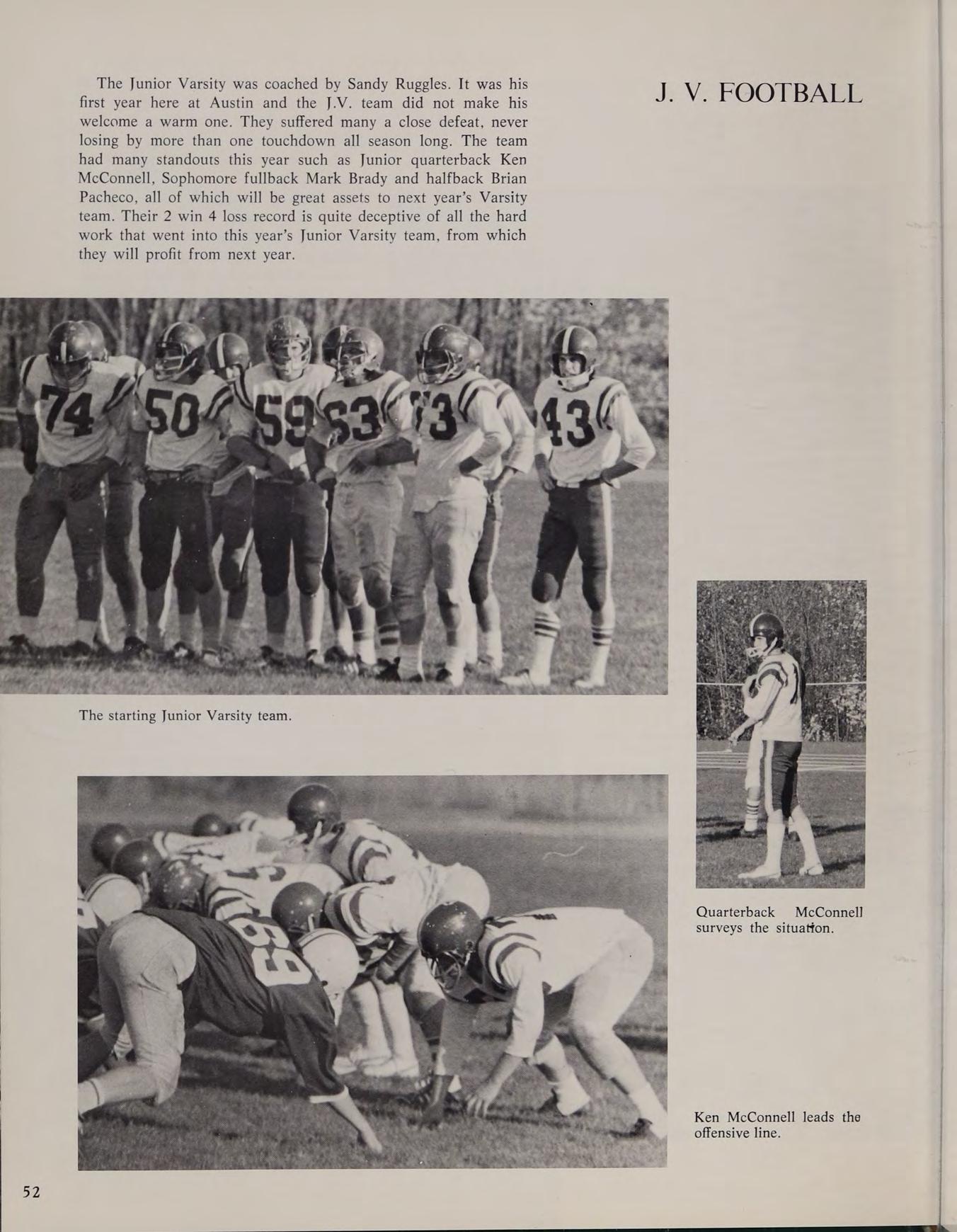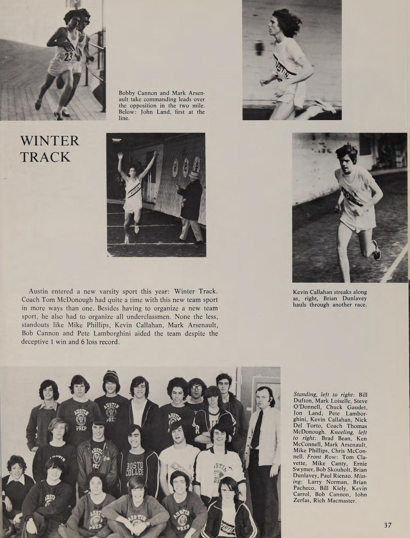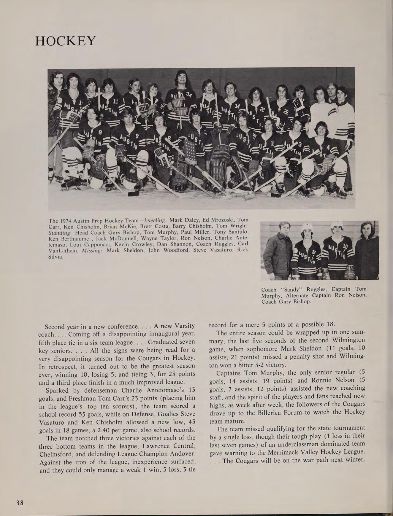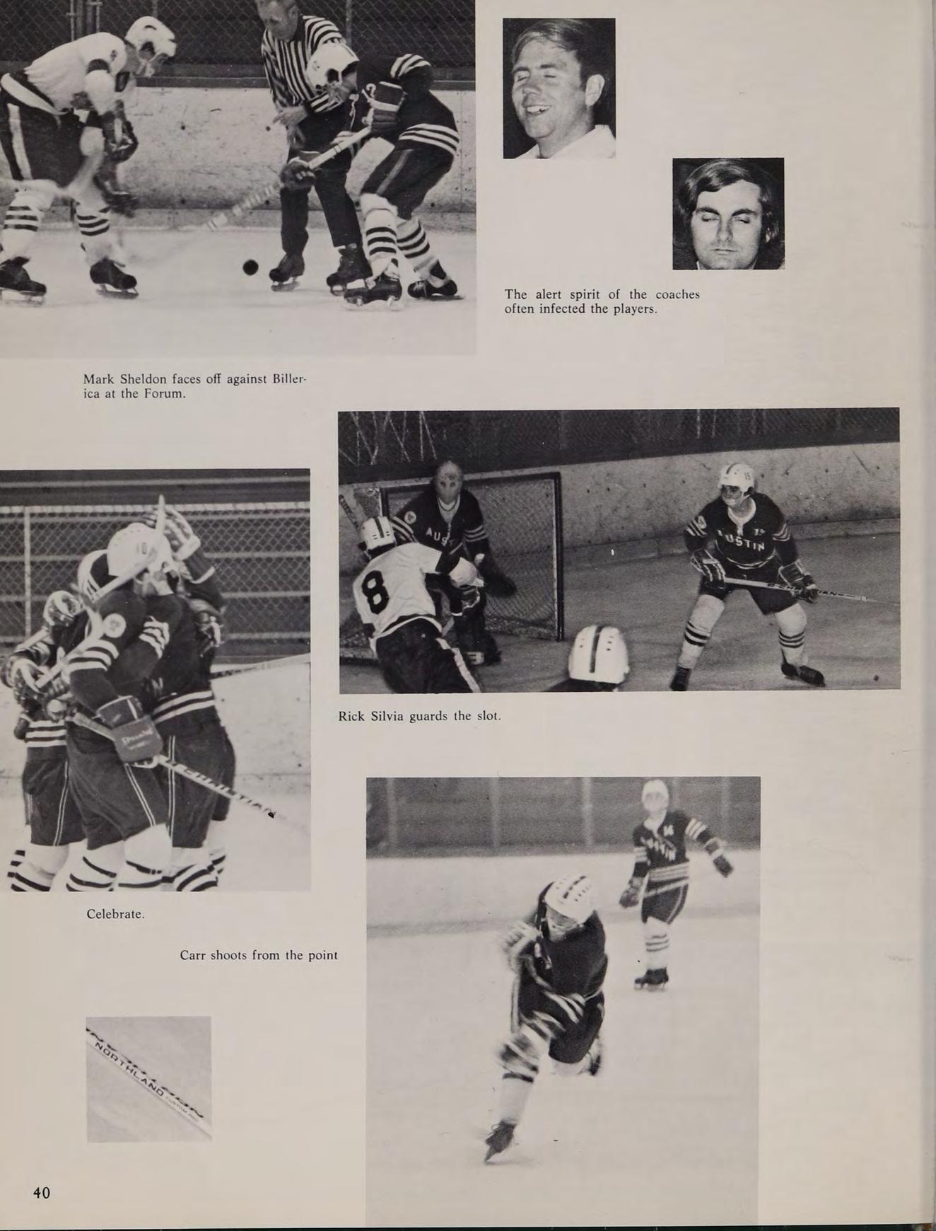 This year’s Cheering squad has proven to be of great Spirit, with a tremendous record of attendance at practices as well as games. For Hockey and Basketball games, they have split into two squads of six girls each. A great deal of thanks is due these girls for their support and loyalty to Austin. The members are Juliane Balliro, Paula Pimental, Merilee Halpin, Mary Jane Kelly, Martha Gugger, Maureen McDonald, Nanci Brownlow, Patti Lally, Suzanne Cox, Cathy Wallent, Sue Frost, and Brianne Sheehan.
