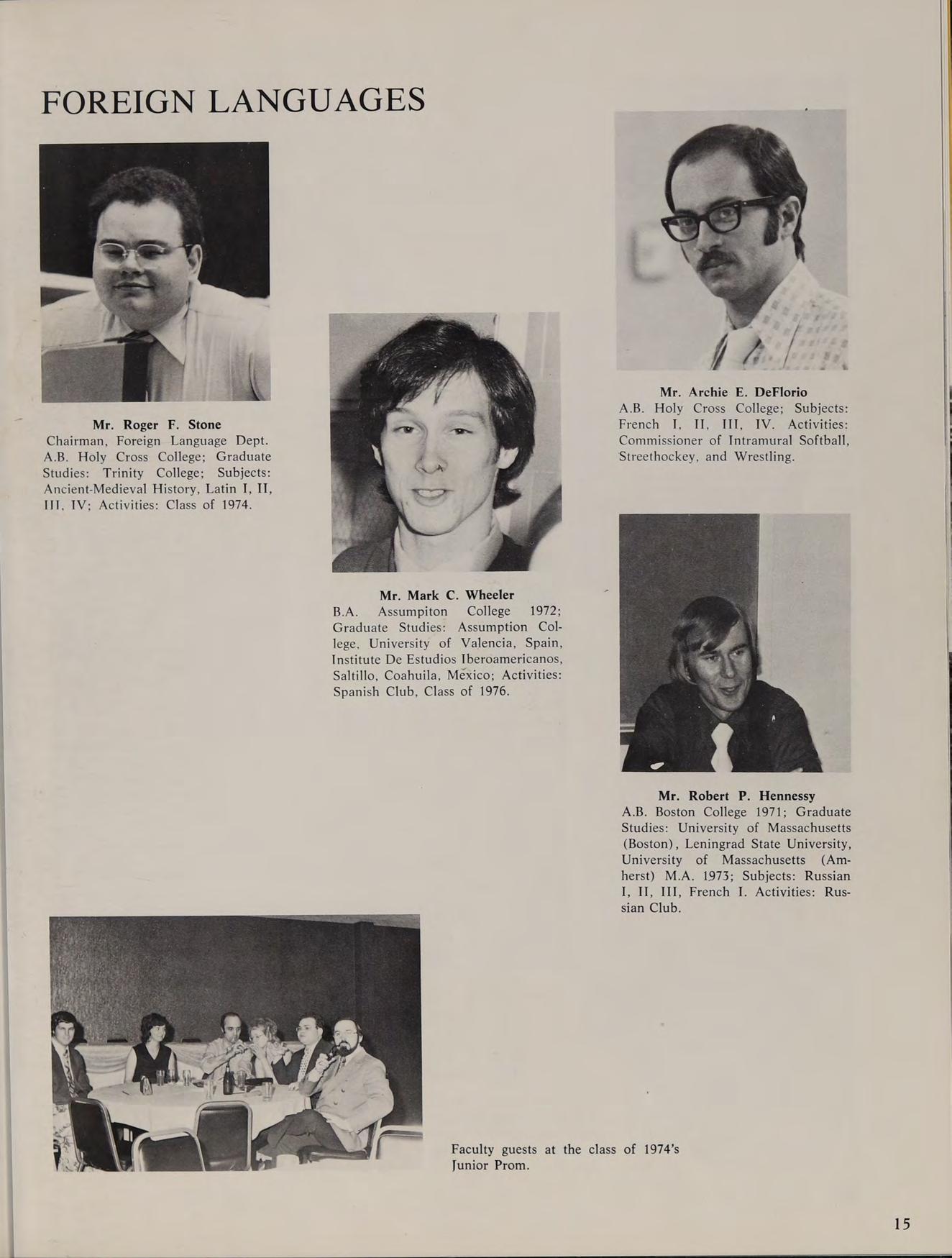 Mr. Robert P. Hennessy A.B. Boston College 1971; Graduate Studies: University of Massachusetts (Boston), Leningrad State University, University of Massachusetts (Amherst) M.A. 1973; Subjects: Russian I, II, IJ, French I. Activities: Russian Club.