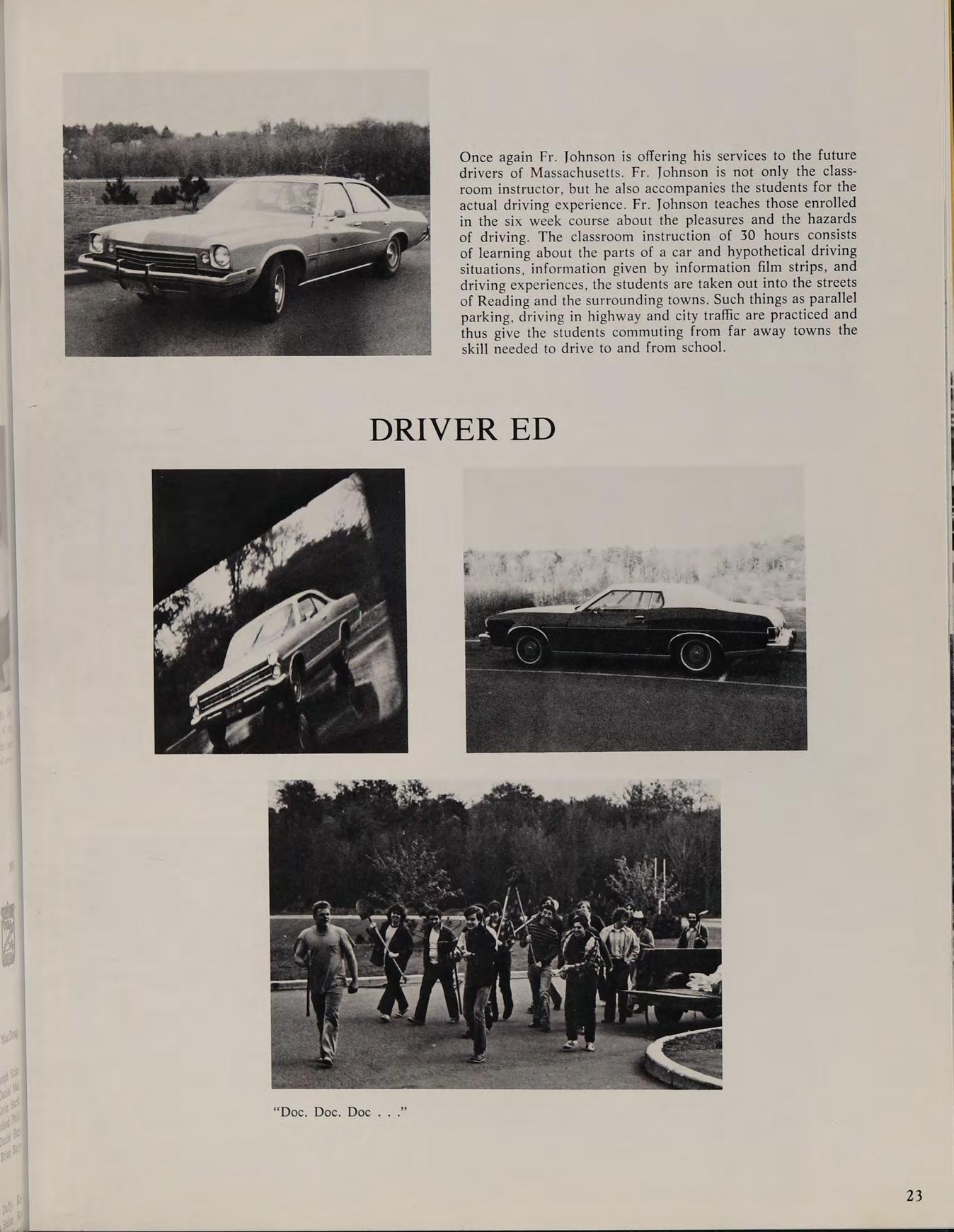 Once again Fr. Johnson is offering his services to the future drivers of Massachusetts. Fr. Johnson is not only the classroom instructor, but he also accompanies the students for the actual driving experience. Fr. Johnson teaches those enrolled in the six week course about the pleasures and the hazards of driving. The classroom instruction of 30 hours consists of learning about the parts of a car and hypothetical driving situations, information given by information film strips, and driving experiences, the students are taken out into the streets of Reading and the surrounding towns. Such things as parallel parking, driving in highway and city traffic are practiced and thus give the students commuting from far away towns the skill needed to drive to and from school.