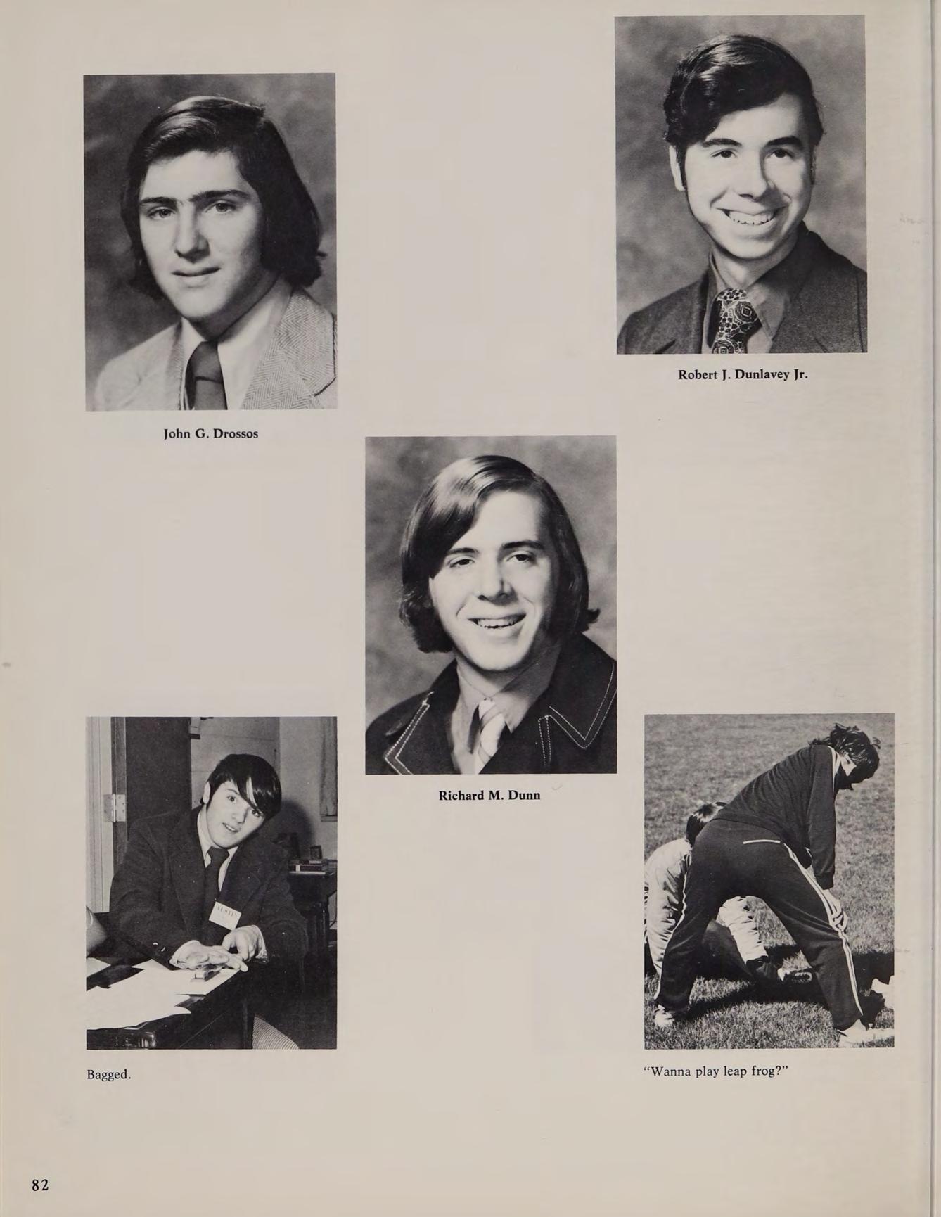 David D. Stevens Charme Road Tewksbury; Activities: Legend 1; Outdoor Sports and Ecology Club; Sports: Intramural Basketball 4; Extra Austin Prep: CYO Bowling League, Rod & Gun Club; Nickname: Friar; Hero: Aristotle Onassis; Remembered for: Being able to get along with everyone.