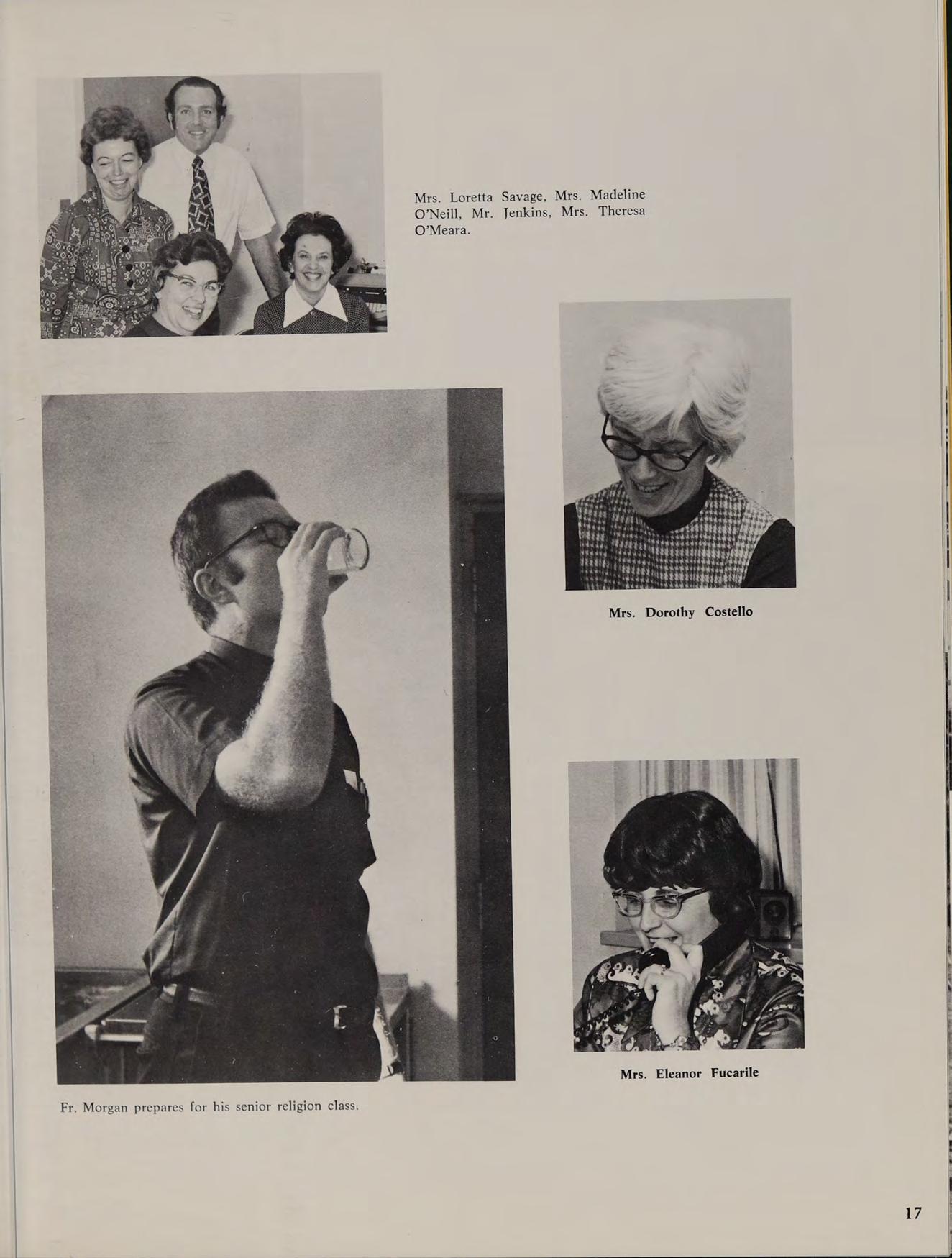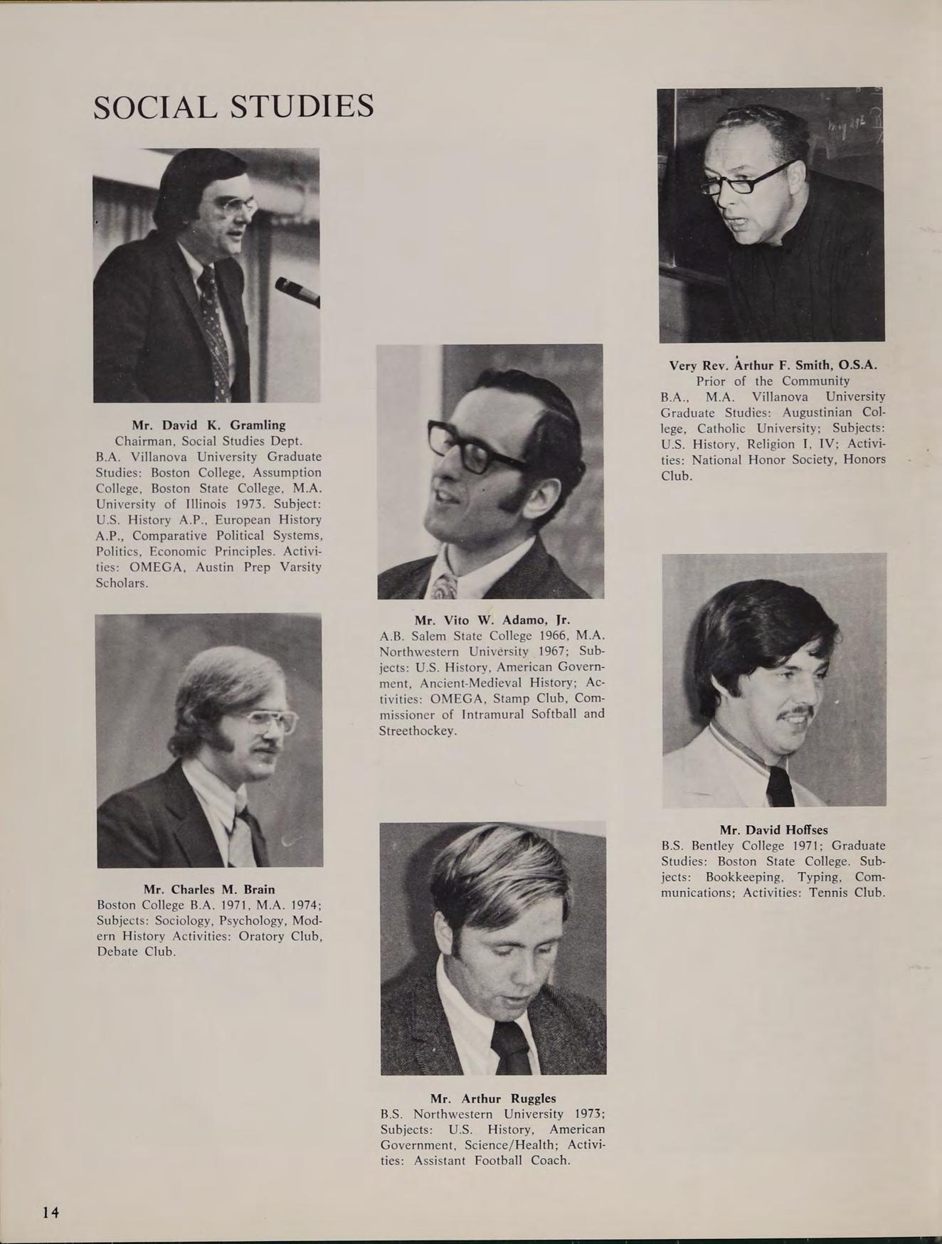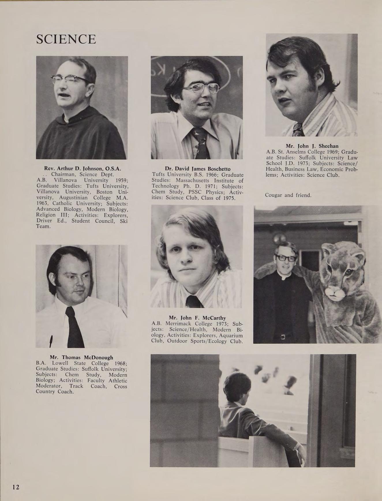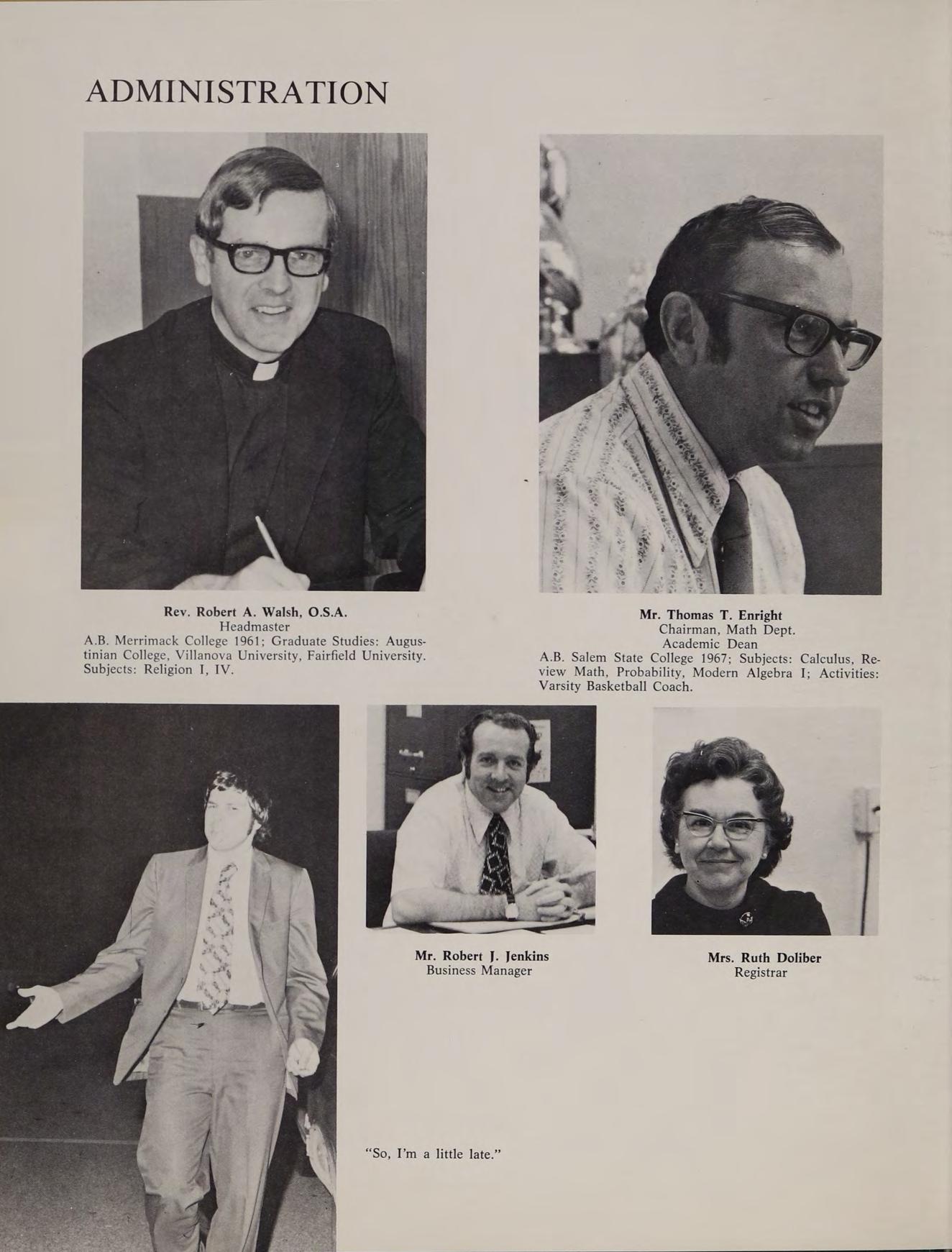 A.B. Villanova University 1959; Graduate Studies: Tufts University, Villanova University, Boston University, Augustinian College M.A. 1963, Catholic University; Subjects: Advanced Biology, Modern Biology, Religion III; Activities: Explorers, Driver Ed., Student Council, Ski Team.
