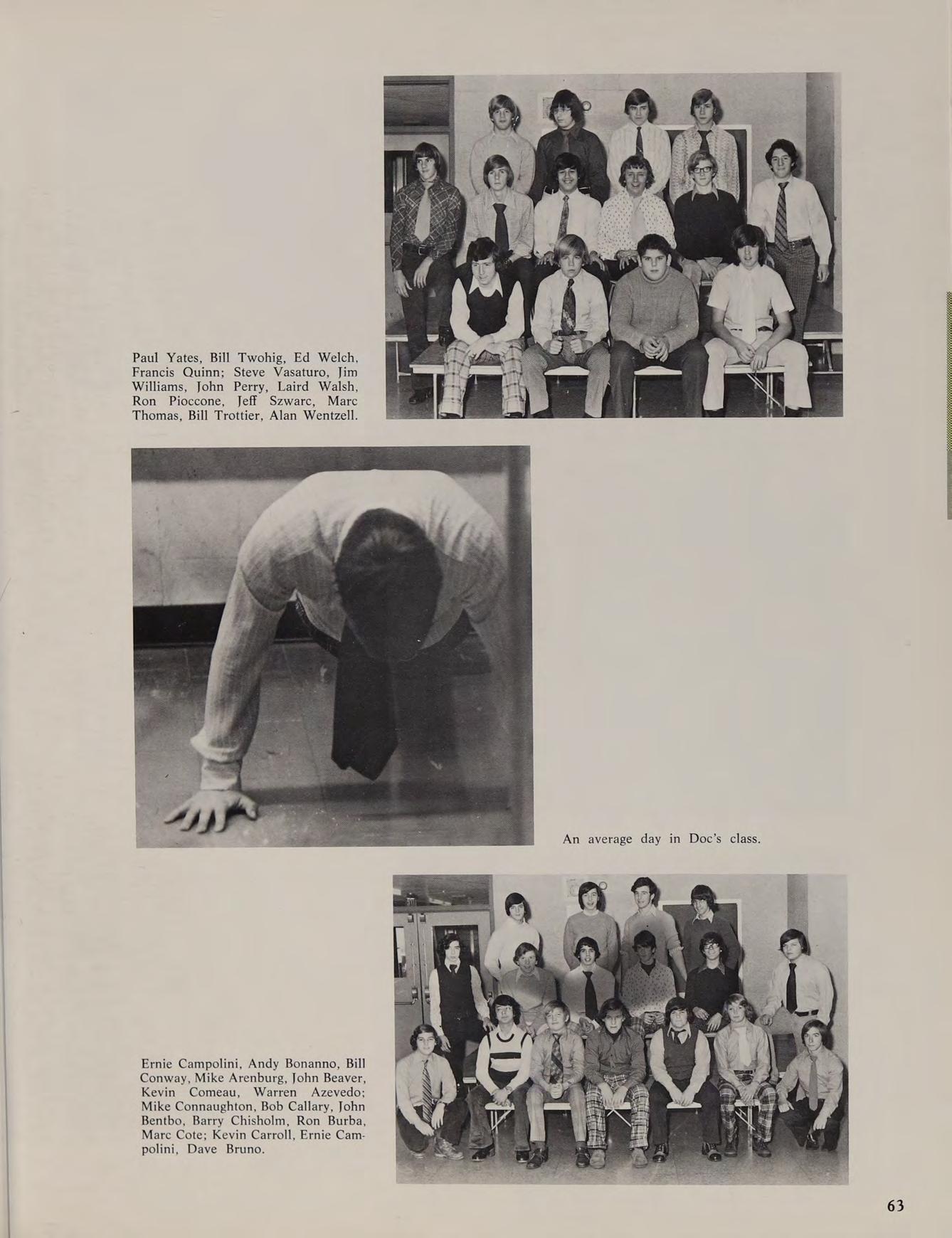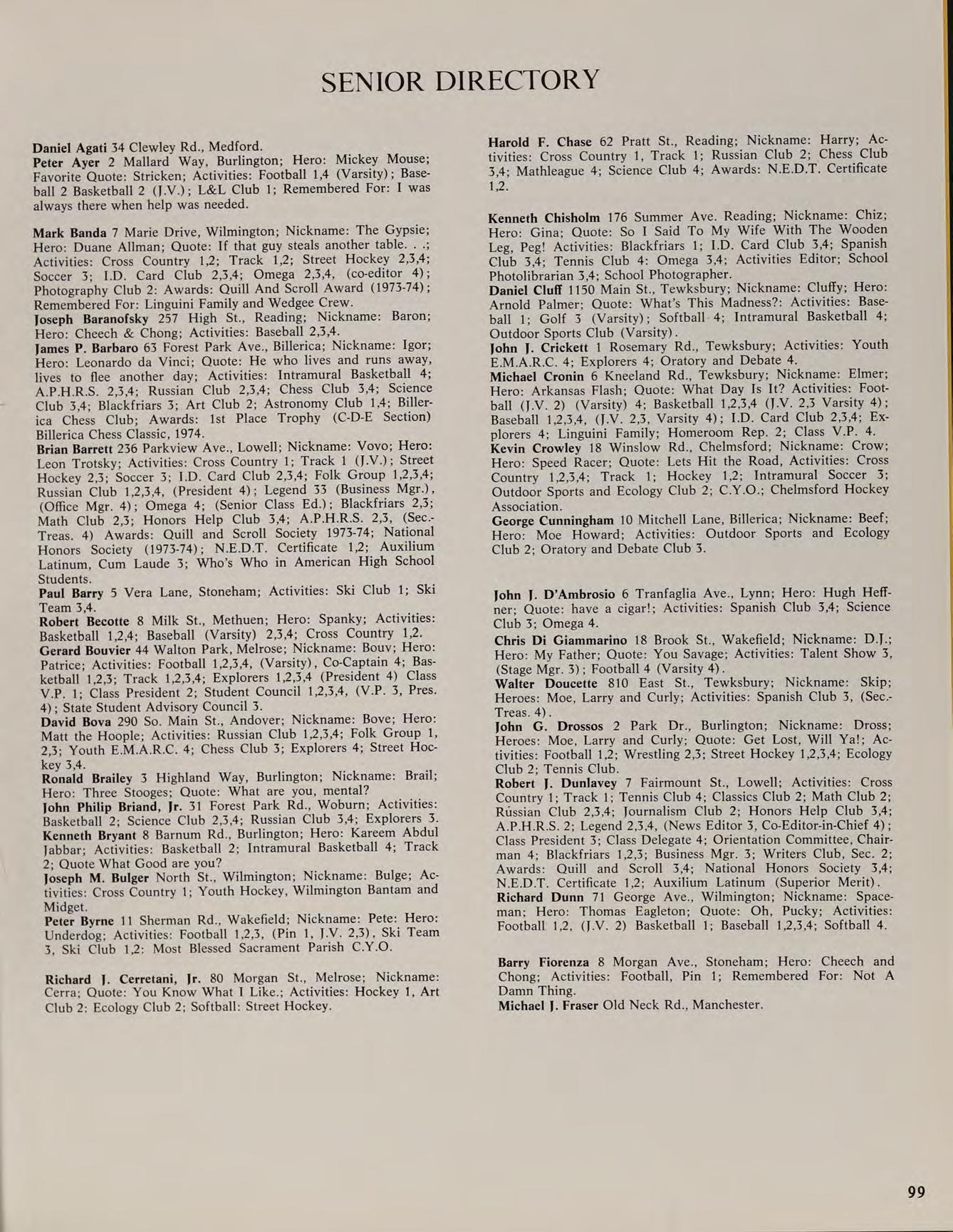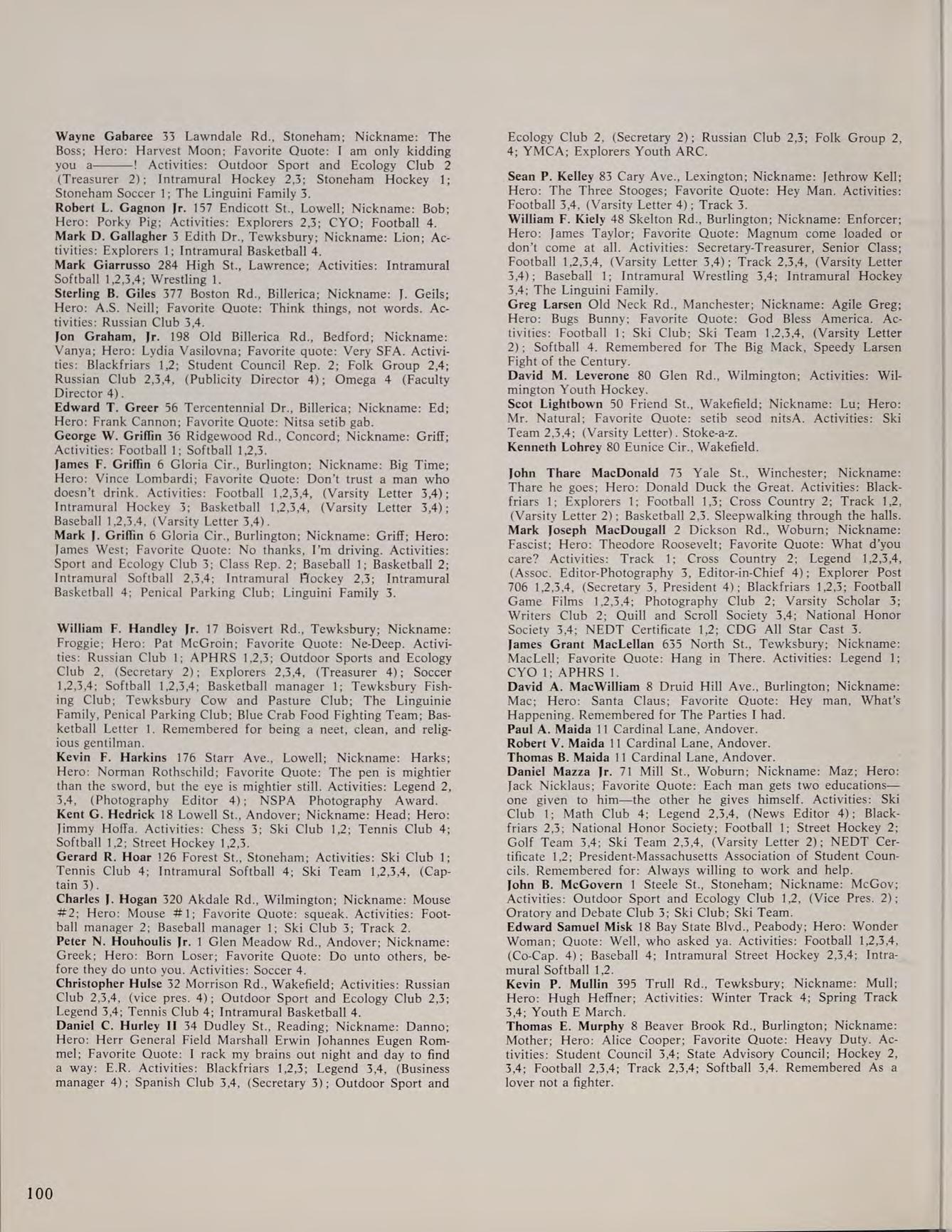 Kevin F. Harkins 176 Starr Ave., Lowell; Nickname: Harks; Hero: Norman Rothschild; Favorite Quote: The pen is mightier than the sword, but the eye is mightier still. Activities: Legend 2, 3,4, (Photography Editor 4); NSPA Photography Award. Kent G. Hedrick 18 Lowell St., Andover; Nickname: Head; Hero: Jimmy Hoffa. Activities: Chess 3; Ski Club 1,2; Tennis Club 4; Softball 1,2; Street Hockey 1,2,3. Gerard R. Hoar 126 Forest St., Stoneham; Activities: Ski Club 1; Tennis Club 4; Intramural Softball 4; Ski Team 1,2,3,4, (Captain 3).