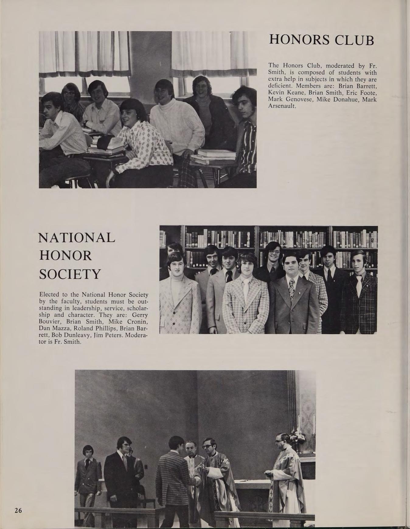 Elected to the National Honor Society by the faculty, students must be outstanding in leadership, service, scholarship and character. They are: Gerry Bouvier, Brian Smith, Mike Cronin, Dan Mazza, Roland Phillips, Brian Barrett, Bob Dunleavy, Jim Peters. Moderator is Fr. Smith.