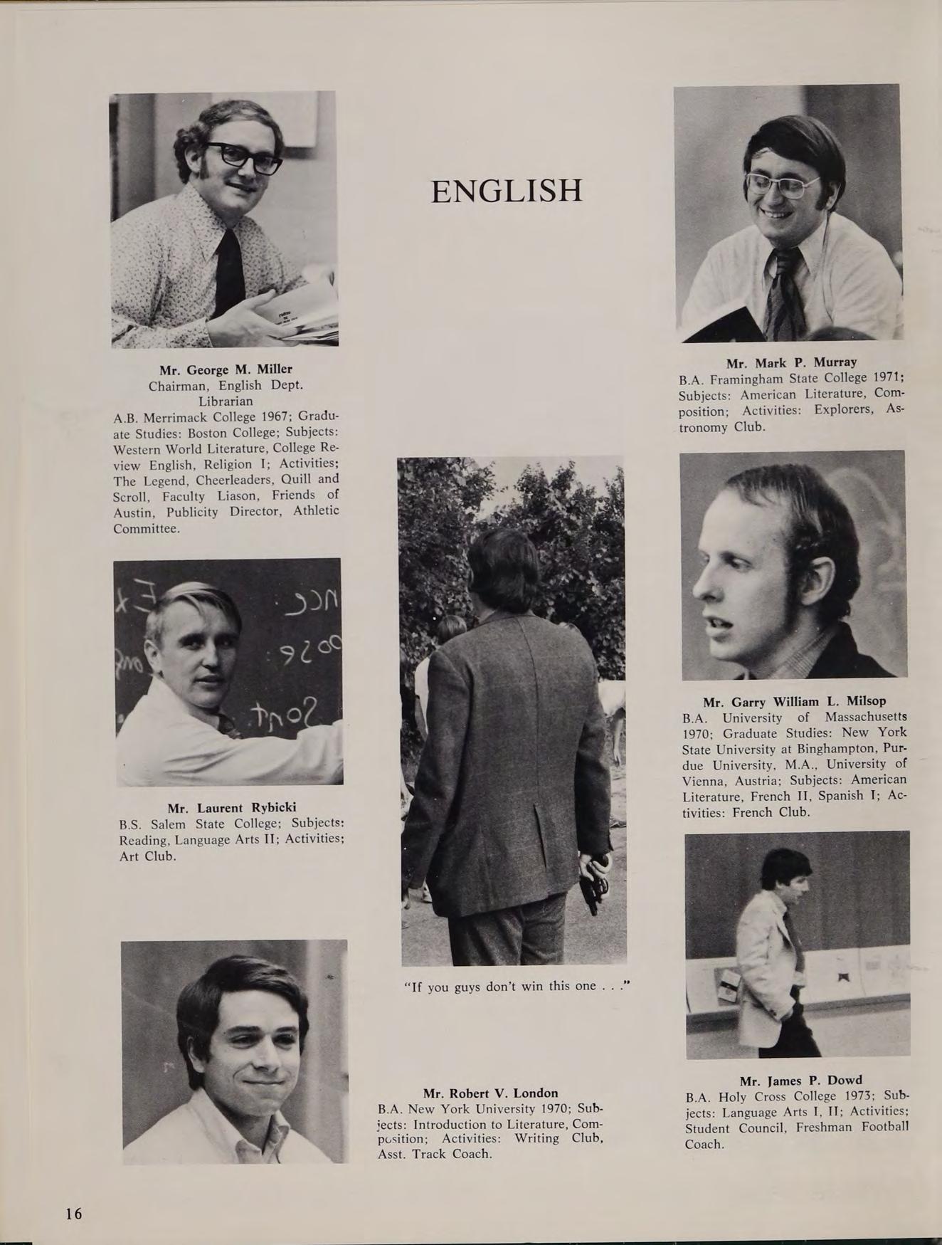 A.B. Salem State College 1966, M.A. Northwestern University 1967; Subjects: U.S. History, American Government, Ancient-Medieval History; Activities: OMEGA, Stamp Club, Commissioner of Intramural Softball and Streethockey.
