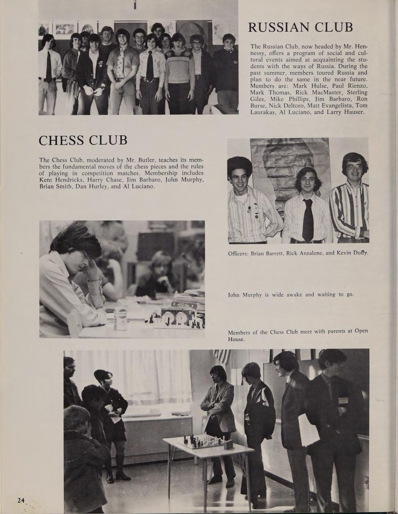 The Chess Club, moderated by Mr. Butler, teaches its members the fundamental moves of the chess pieces and the rules of playing in competition matches. Membership includes Kent Hendricks, Harry Chase, Jim Barbaro, John Murphy, Brian Smith, Dan Hurley, and Al Luciano.