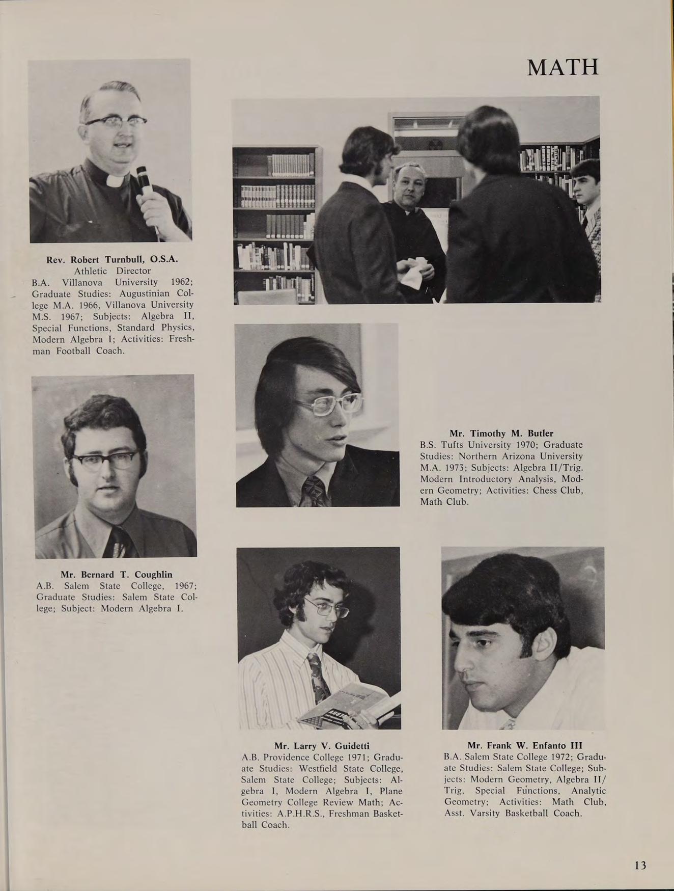 B.A. Salem State College 1972; Graduate Studies: Westfield State College, ate Studies: Salem State College; SubSalem State College; Subjects: Al- jects: Modern Geometry, Algebra IT/ gebra I, Modern Algebra I, Plane Trig, Special Functions, Analytic Geometry College Review Math; Ac- Geometry; Activities: Math Club, tivities: A.P.H.R.S., Freshman Basket- Asst. Varsity Basketball Coach. ball Coach.