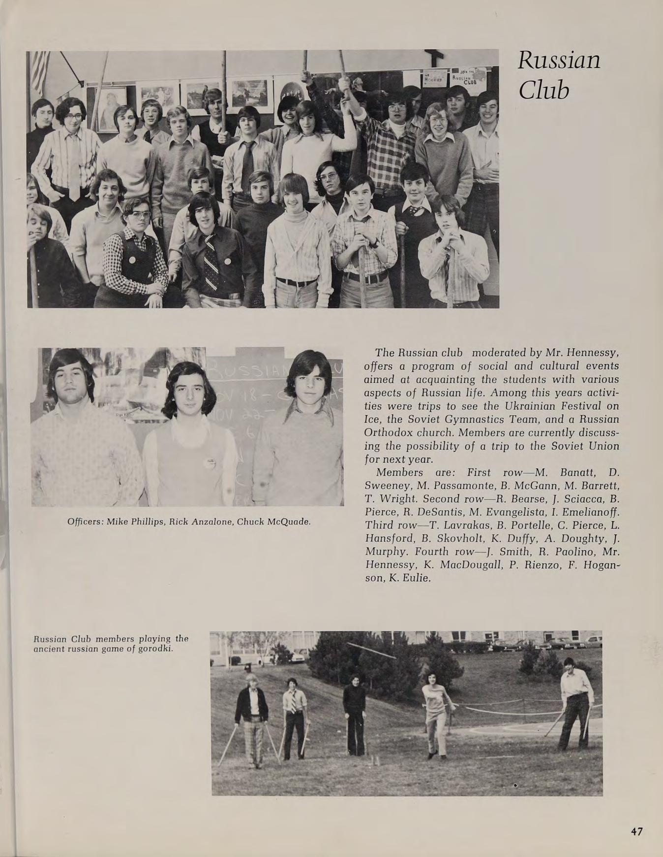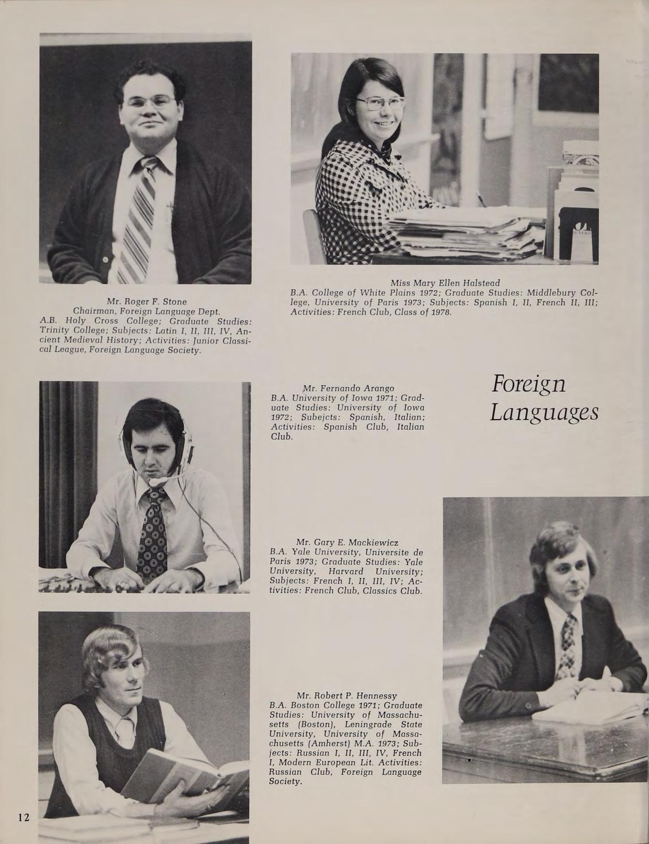B.A. Boston College 1971; Graduate Studies: University of Massachusetts (Boston), Leningrade State University, University of Massachusetts (Amherst) M.A. 1973; Subjects: Russian I, II, III, IV, French I, Modern European Lit. Activities: Russian Club, Foreign Language Society.
