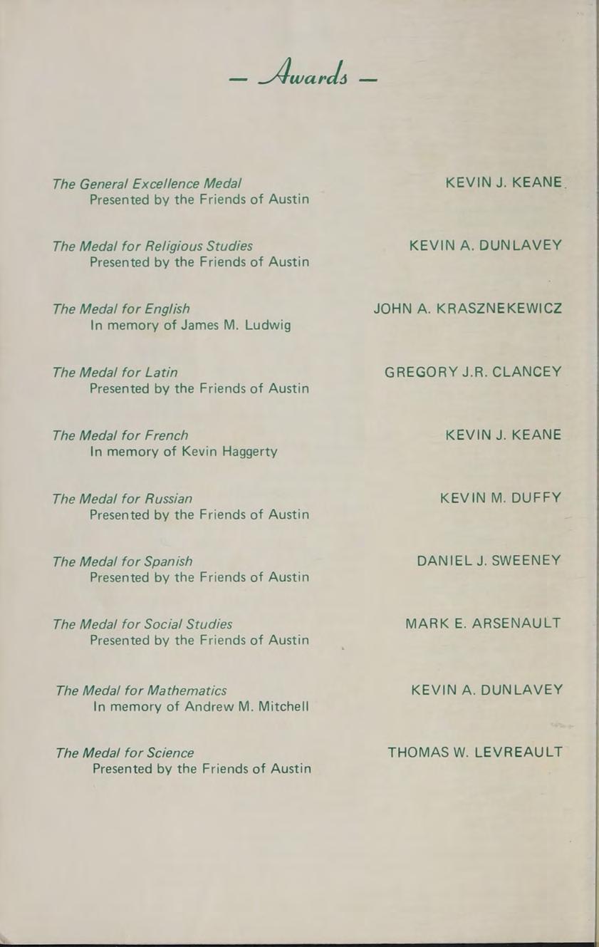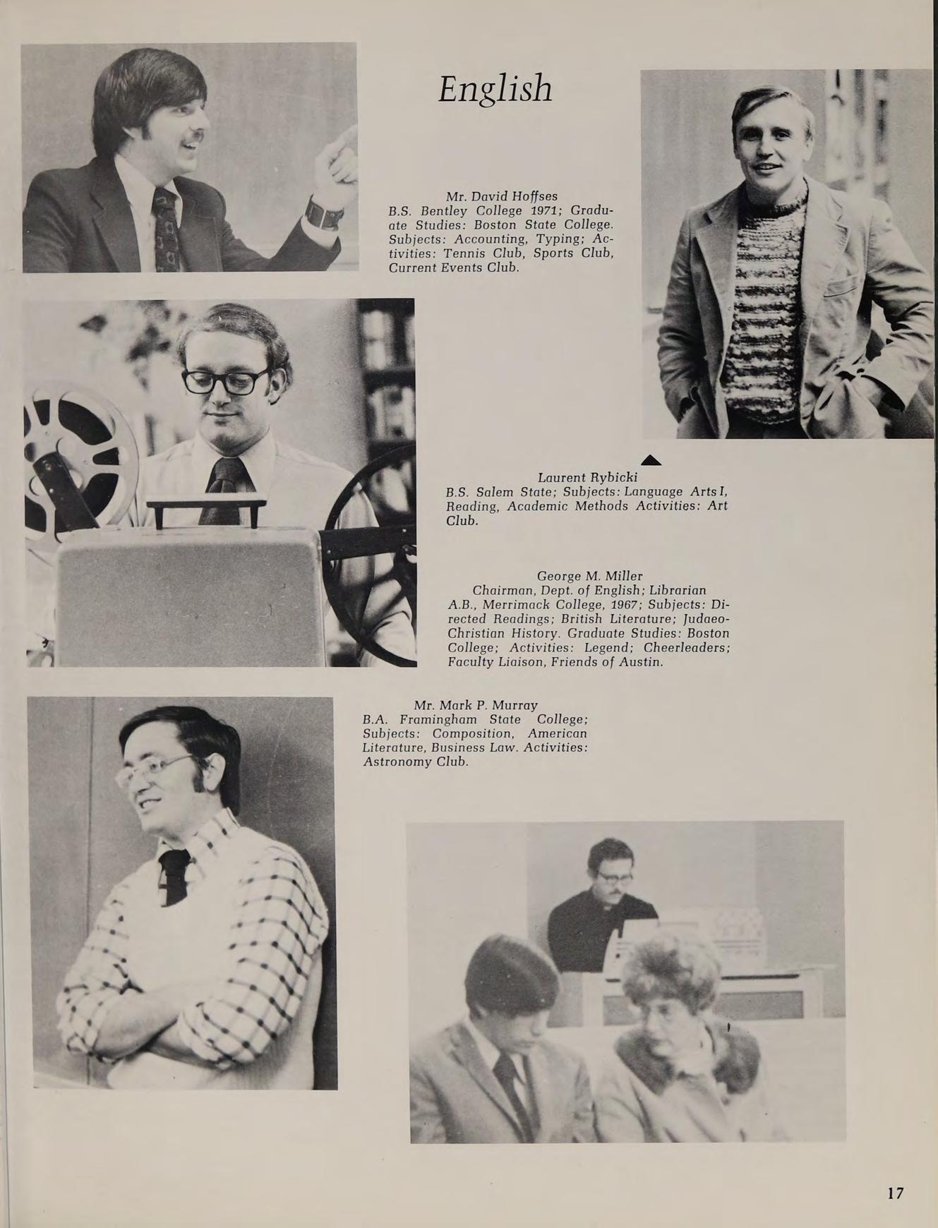 A.B., Merrimack College, 1967; Subjects: Directed Readings; British Literature; JudaeoChristian History. Graduate Studies: Boston College; Activities: Legend; Cheerleaders; Faculty Liaison, Friends of Austin.