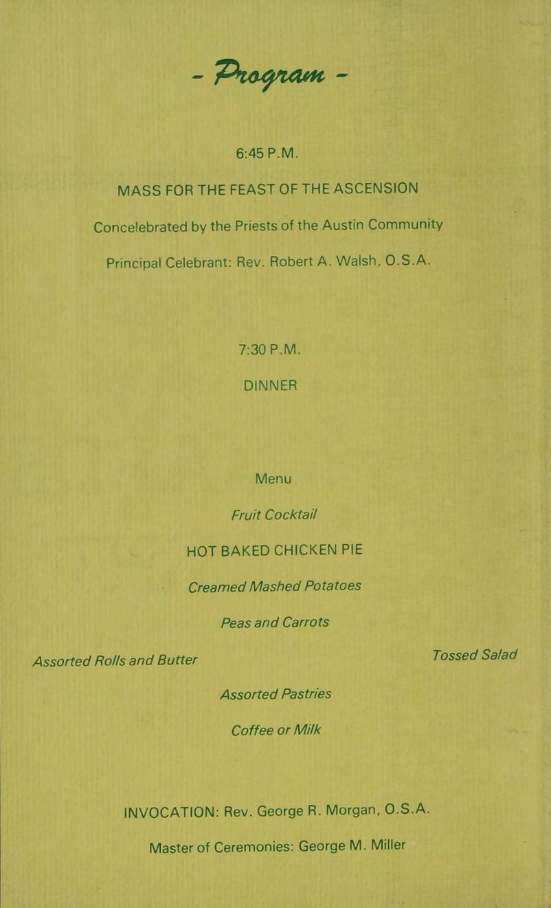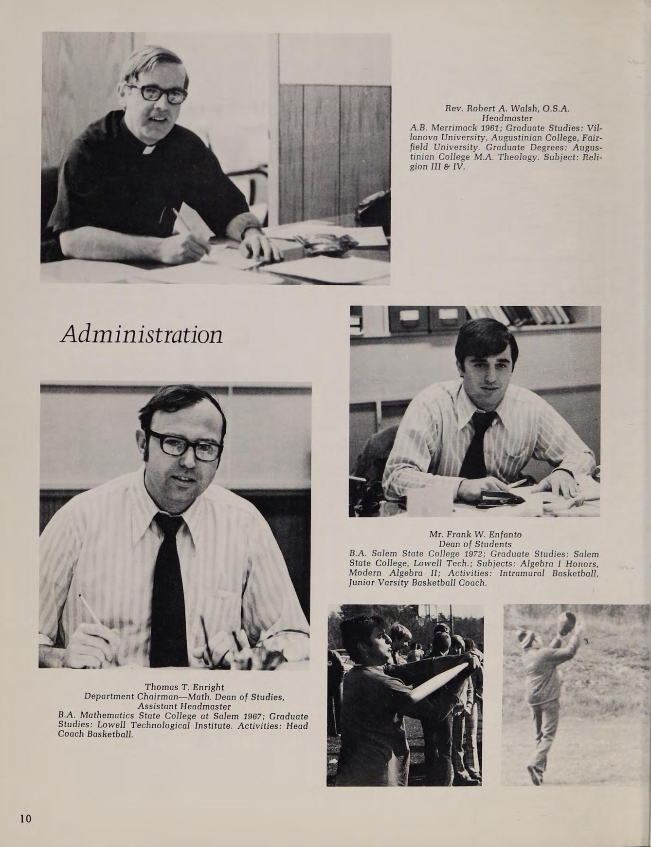 A.B. Merrimack 1961; Graduate Studies: Villanova University, Augustinian College, Fairfield University. Graduate Degrees: Augustinian College M.A. Theology. Subject: Reli- gion III & IV.