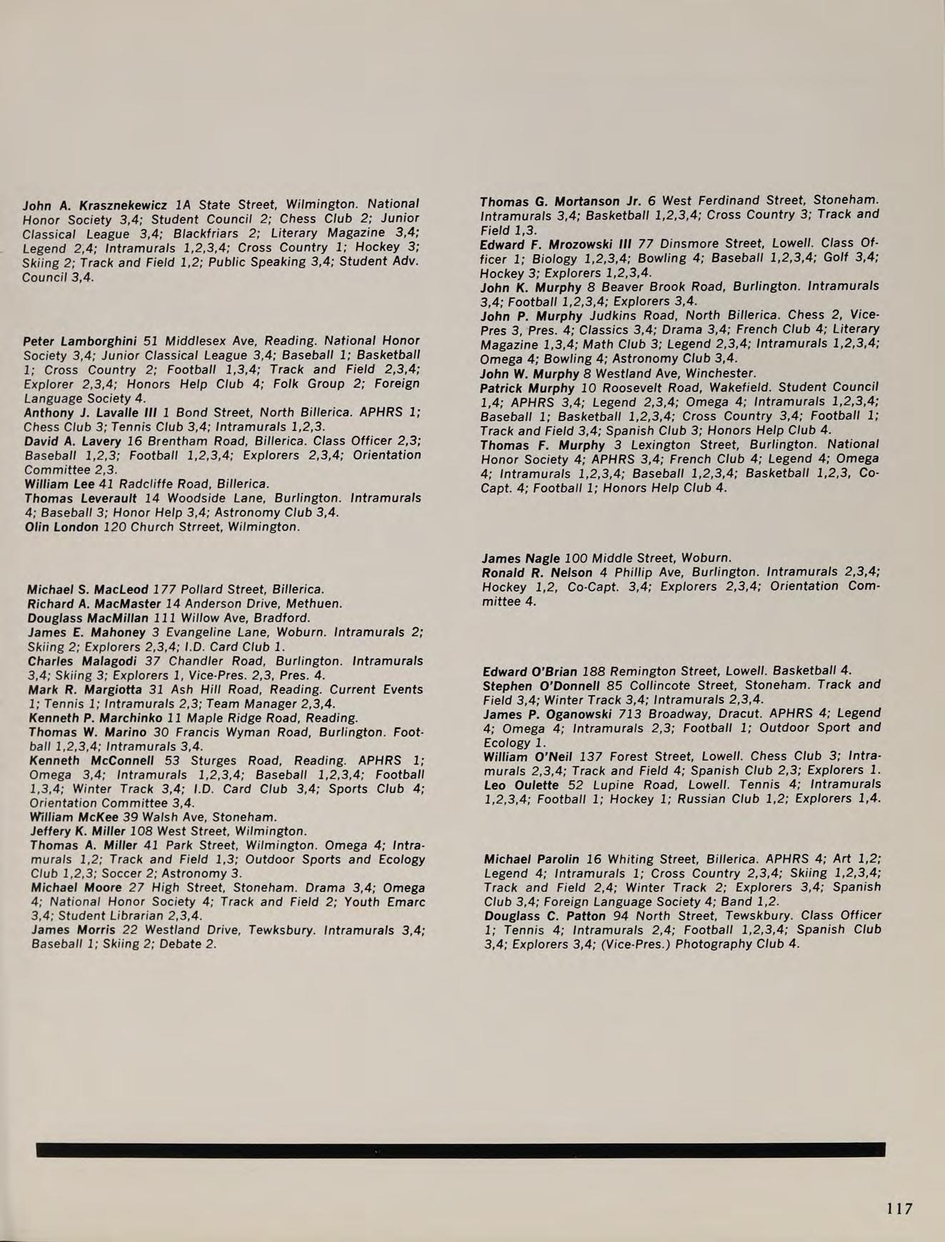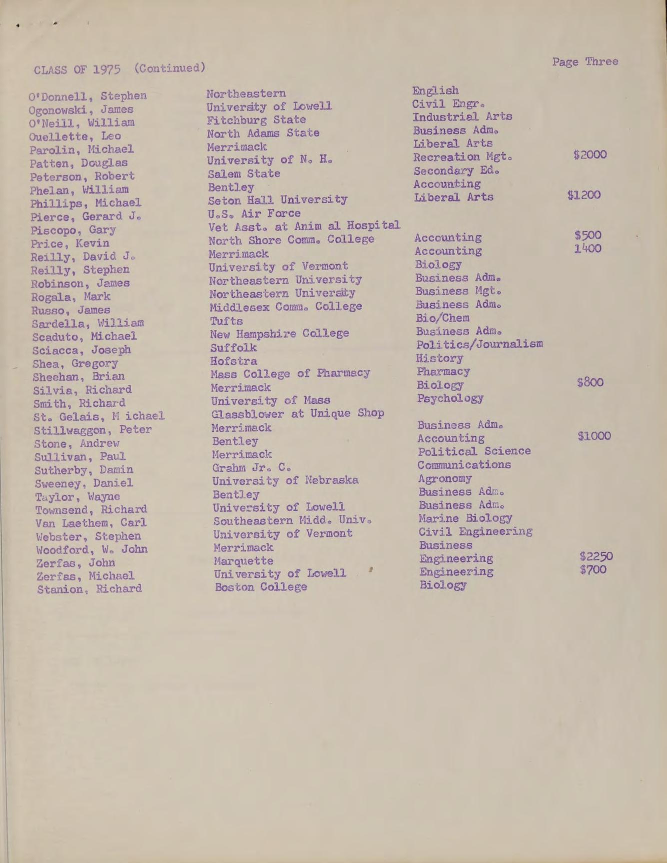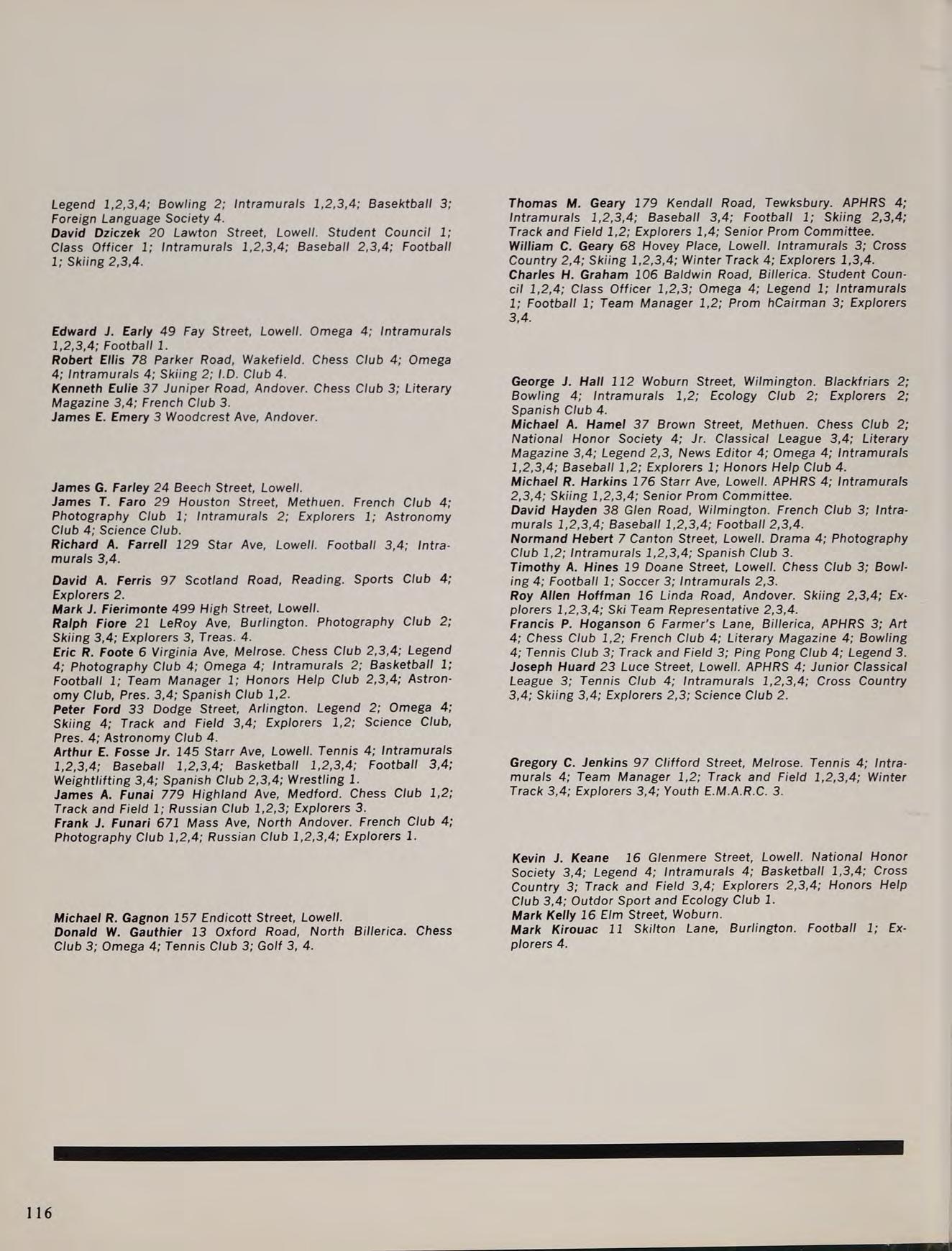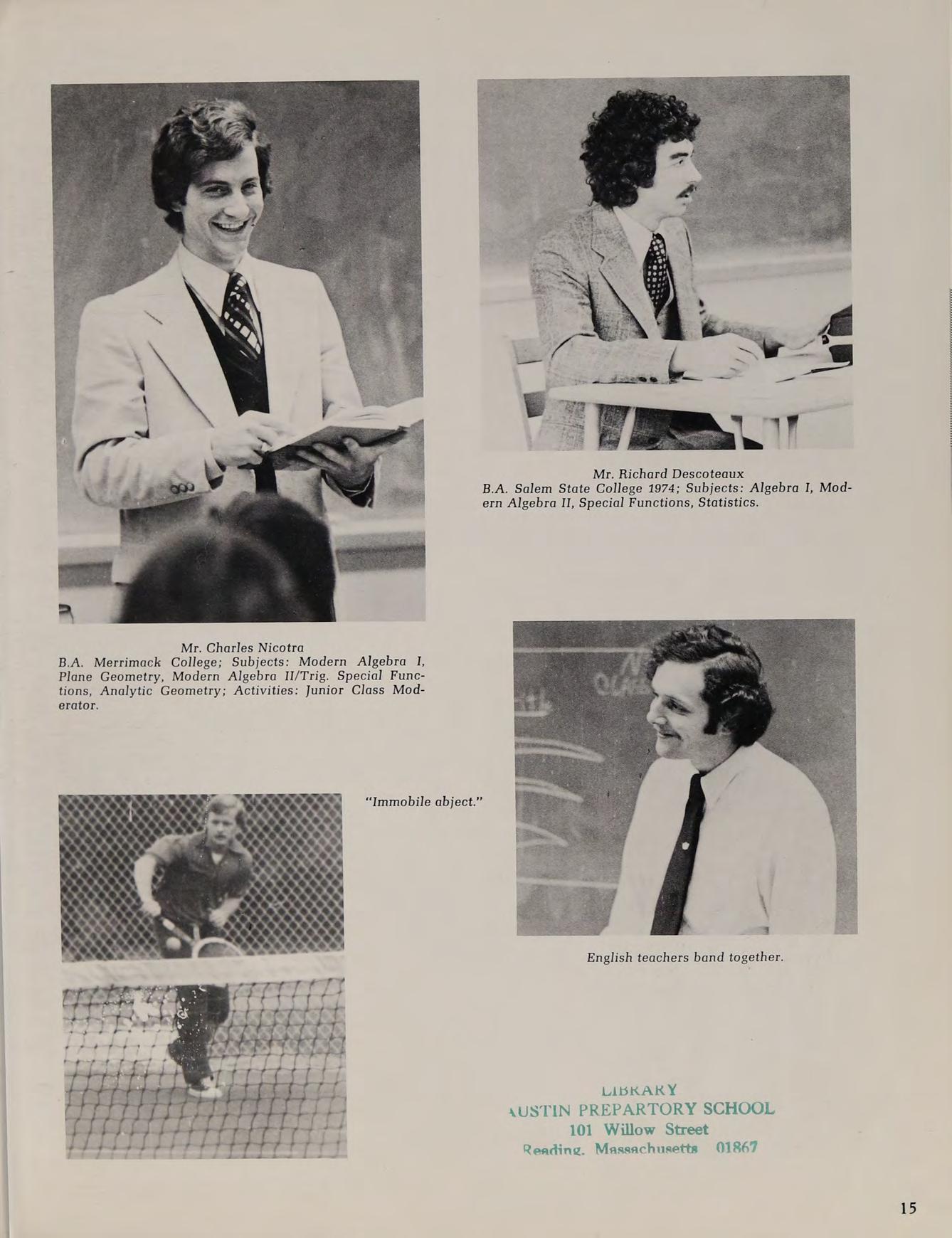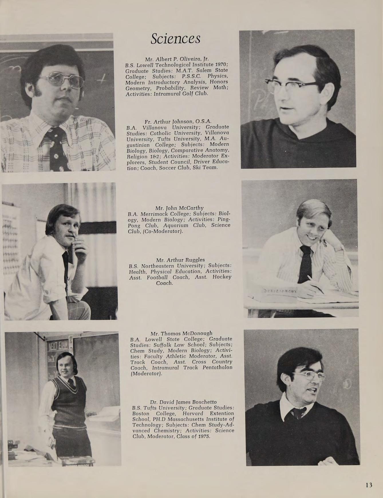 B.S. Lowell Technological Institute 1970; Graduate Studies: M.A.T. Salem State College; Subjects: P.S.S.C. Physics, Modern Introductory Analysis, Honors Geometry, Probability, Review Math; Activities: Intramural Golf Club.