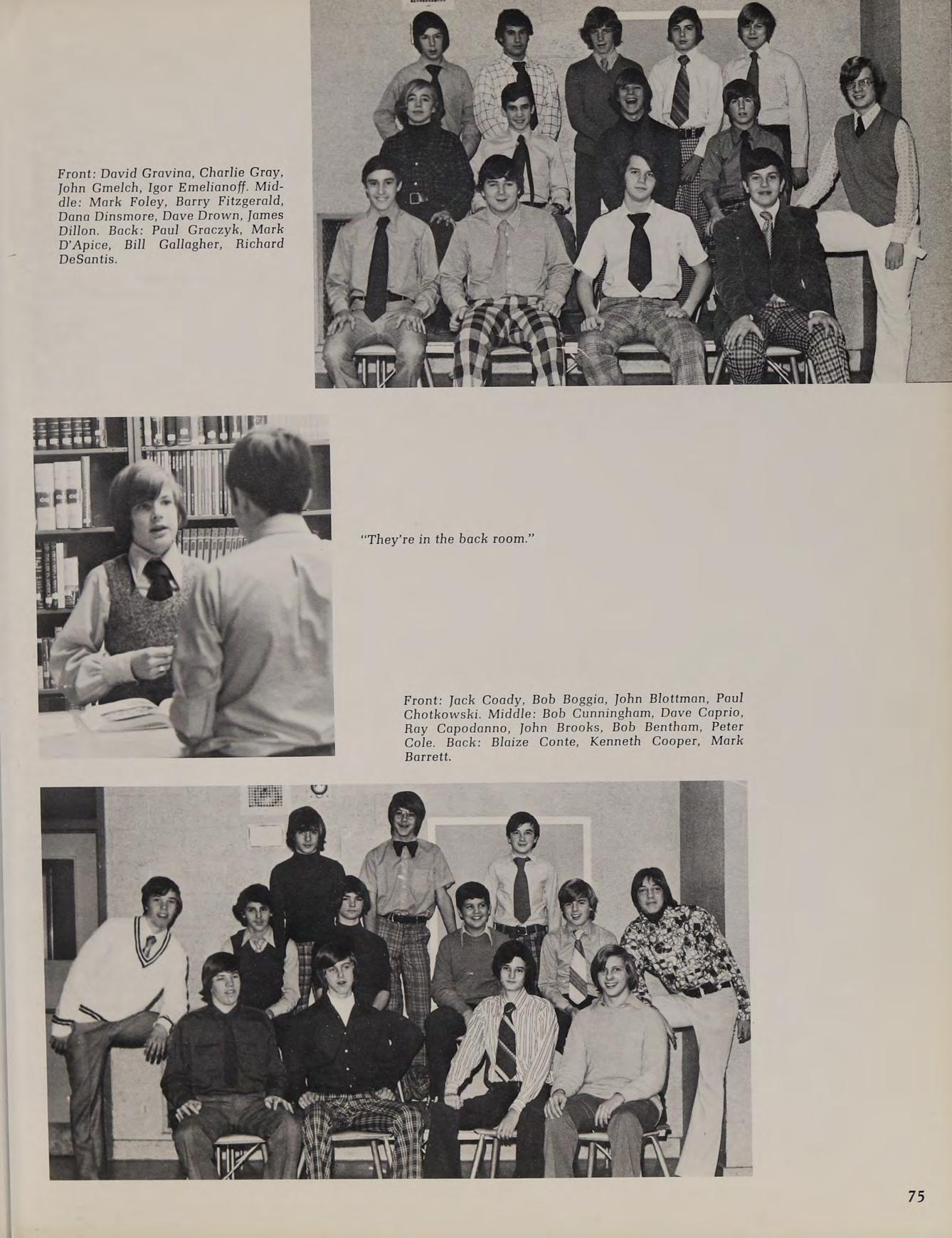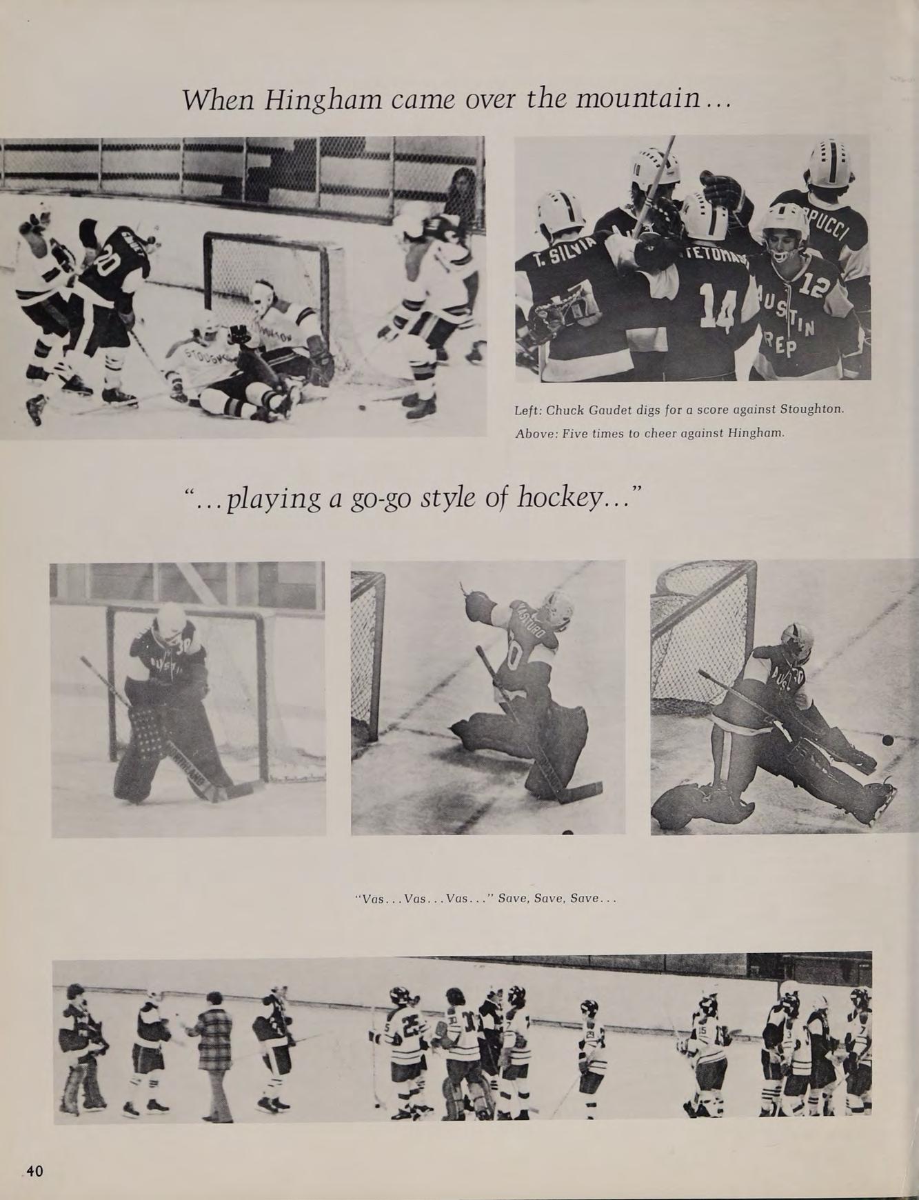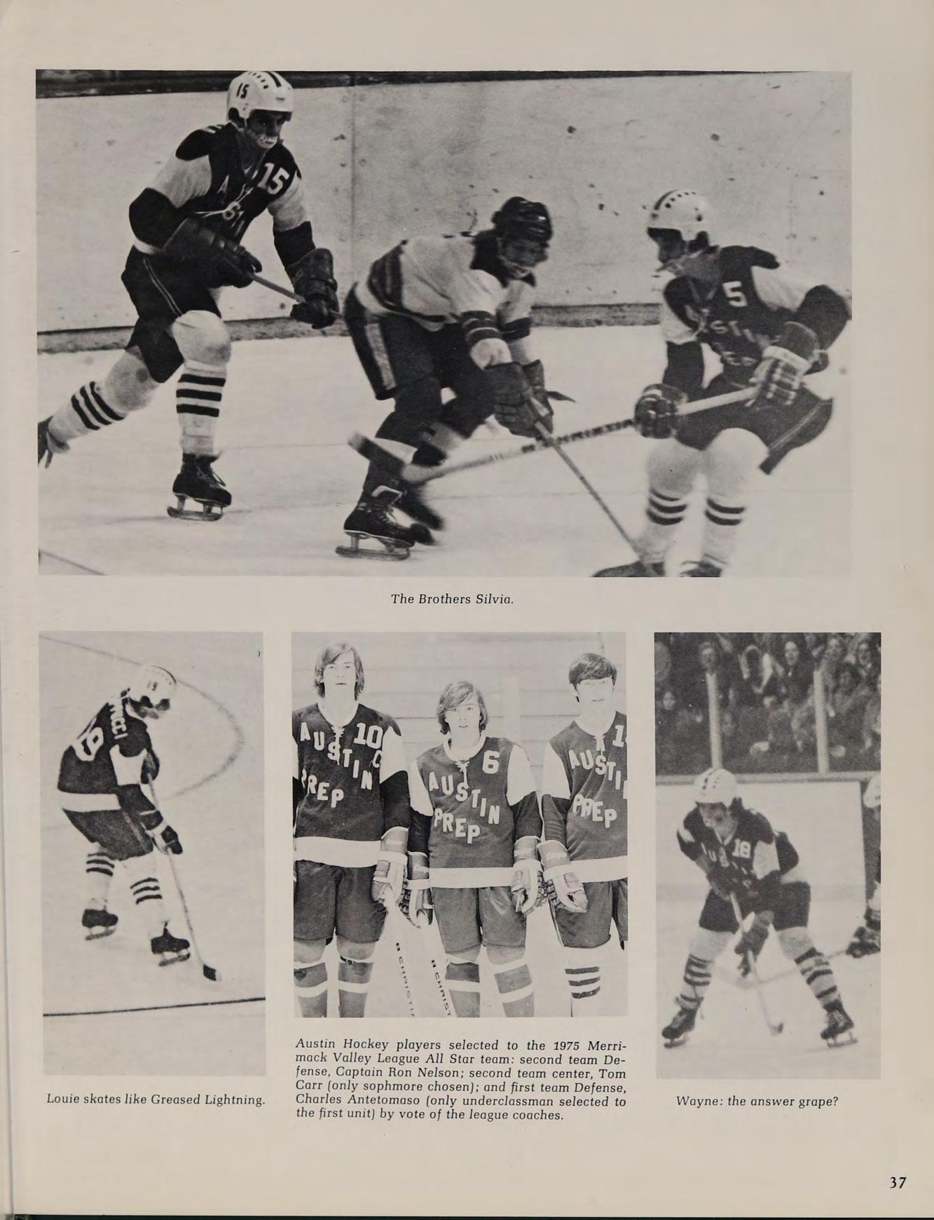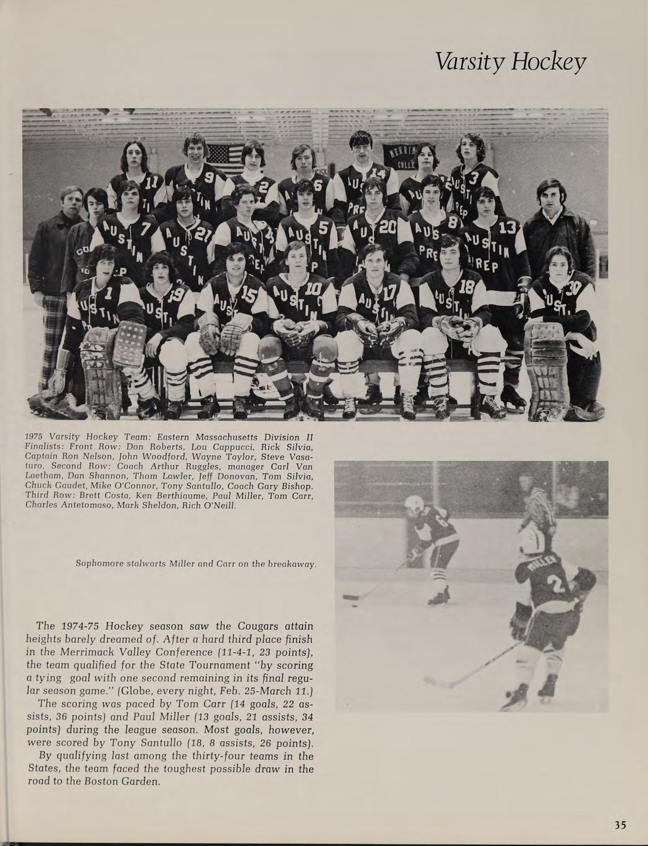 1975 Varsity Hockey Team: Eastern Massachusetts Division II Finalists: Front Row: Don Roberts, Lou Cappucci, Rick Silvia, Captain Ron Nelson, John Woodford, Wayne Taylor, Steve Vasaturo. Second Row: Coach Arthur Ruggles, manager Carl Van Laetham, Dan Shannon, Thom Lawler, Jeff Donovan, Tom Silvia, Chuck Gaudet, Mike O’Connor, Tony Santullo, Coach Gary Bishop. Third Row: Brett Costa, Ken Berthiaume, Paul Miller, Tom Carr, Charles Antetomaso, Mark Sheldon, Rich O'Neill.