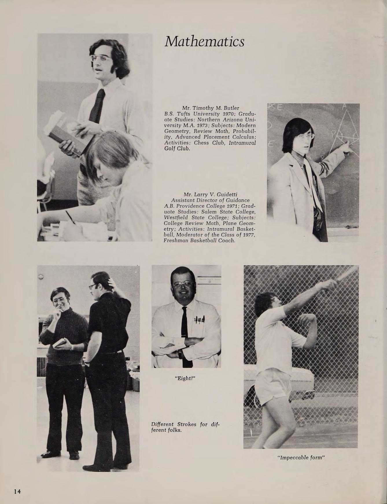 B.S. Tufts University 1970; Graduate Studies: Northern Arizona University M.A. 1973; Subjects: Modern Geometry, Review Math, Probability, Advanced Placement Calculus; Activities: Chess Club, Intramural Golf Club.