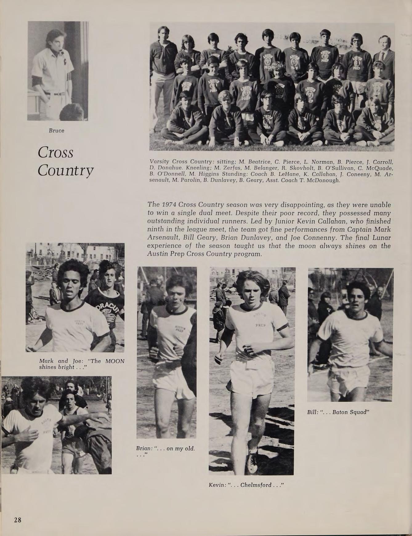 The 1974 Cross Country season was very disappointing, as they were unable to win a single dual meet. Despite their poor record, they possessed many outstanding individual runners. Led by Junior Kevin Callahan, who finished ninth in the league meet, the team got fine performances from Captain Mark Arsenault, Bill Geary, Brian Dunlavey, and Joe Connenny. The final Lunar experience of the season taught us that the moon always shines on the Austin Prep Cross Country program.