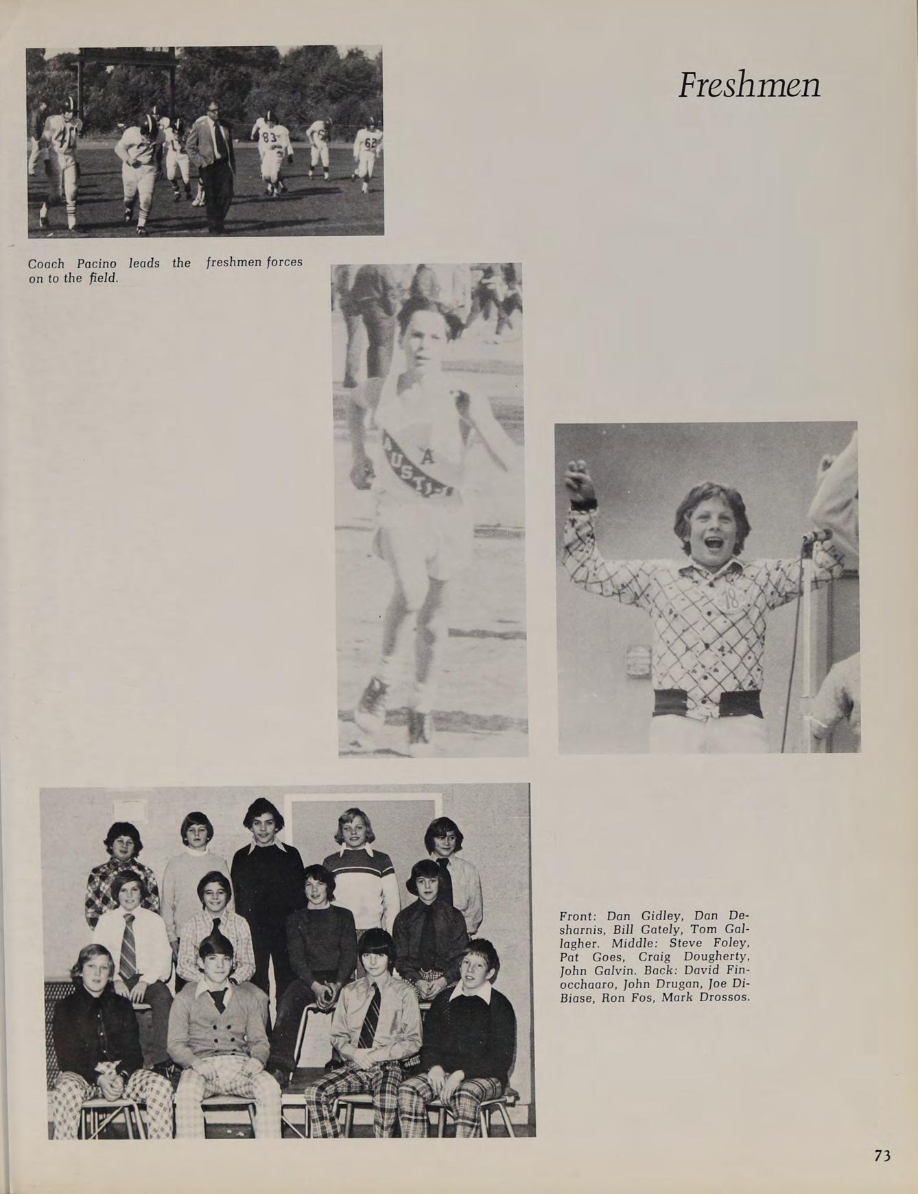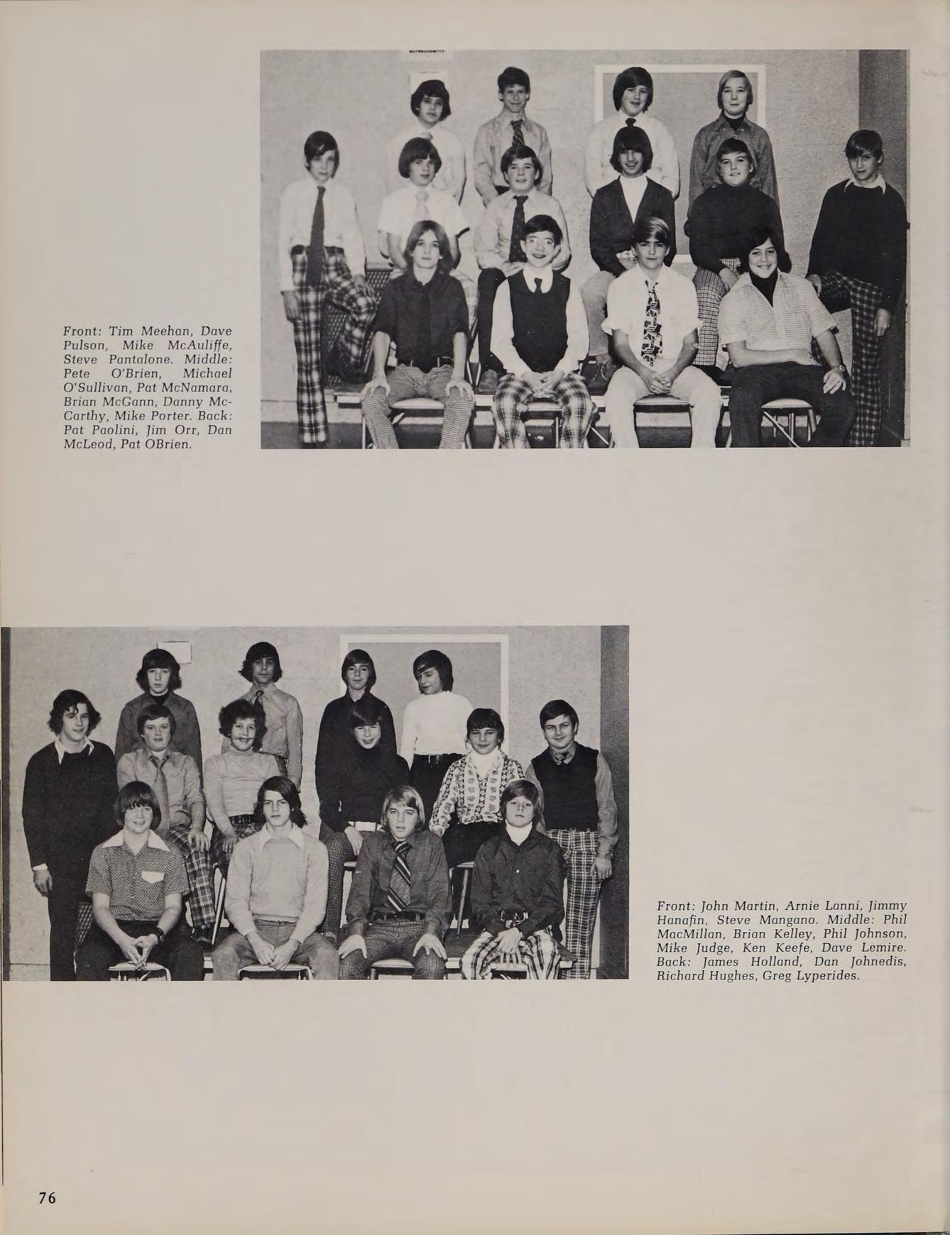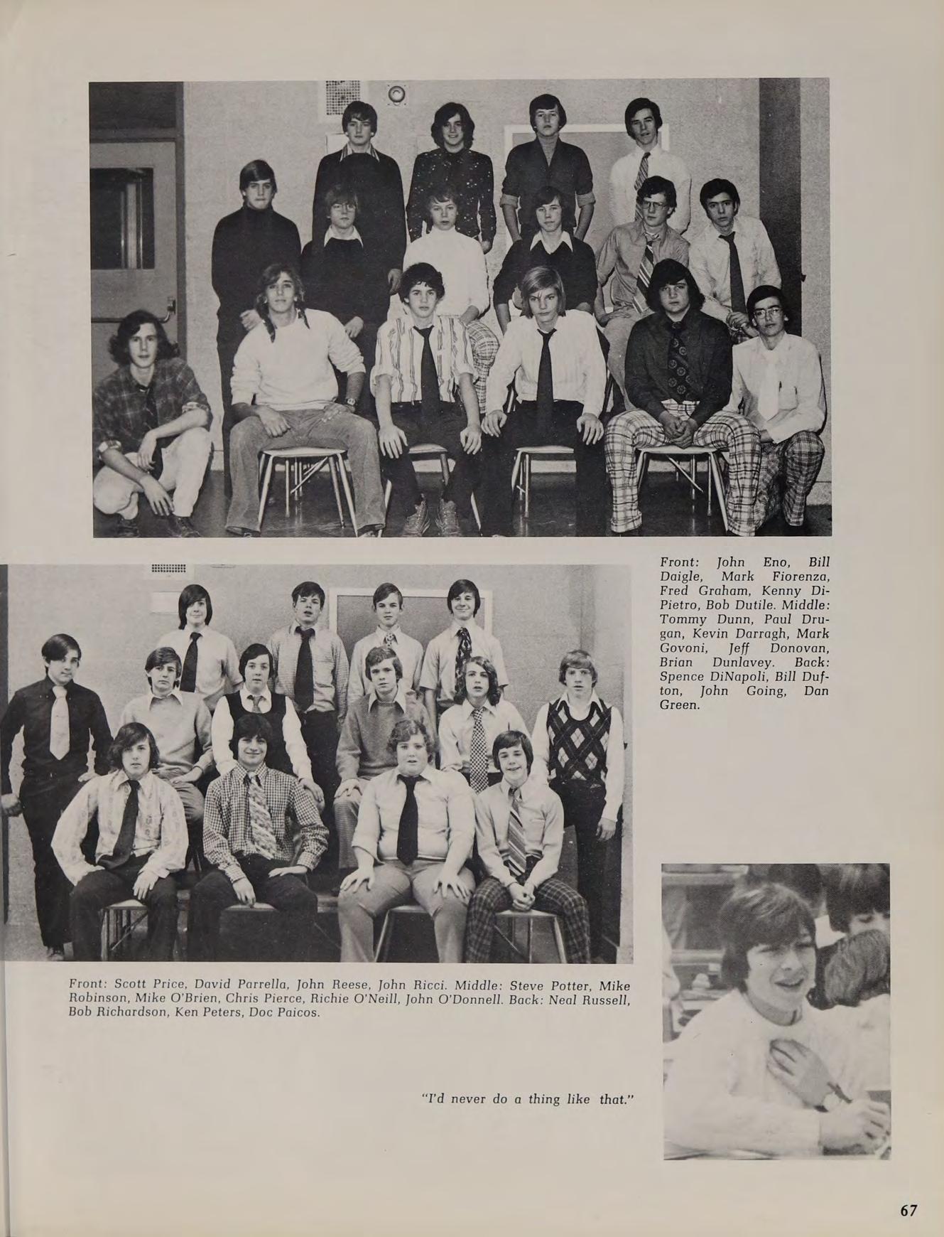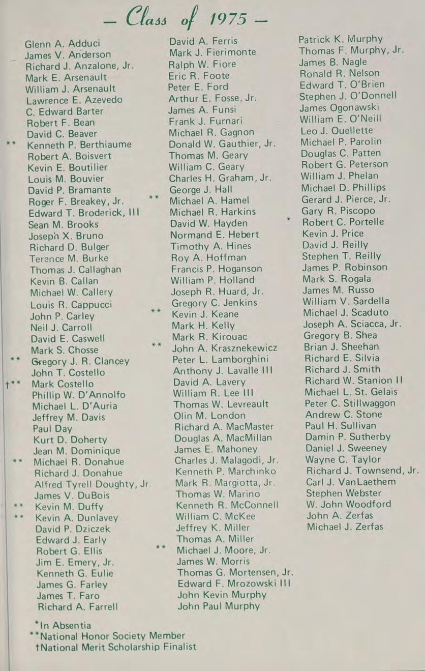 1975 Varsity Winter Track Team: front row: B. Trainor, C. Pierce, S. Thompson, T. O’Brien, J. Glocking, M. Beatrice, J. DiBiase, P. Graczik, J. Winnett. second row: J. Galvin, P. Rienzo, M. Govoni, J. Ricci, T. Dunn, L. MacLean, R. Bearse, W. Pierce, J. Bentubo, D. Adamy, R. Kowalchik. third row: Coach Lehane, J. Wells, E. Swymer, T. Hines, P. Genovese, M. Phillips, S. O’Donnell, P. Lambroghini, M. Loiselle, K. McConnell, M. Donahue, B. Sheehan, B. Conte, W. Gallagher, Coach McDonough back row: J. Smith, K. Callahan, W. Geary, B. Dunlavey, J. Coneeny, J. Land, D. Kelly, G. Jenkins, D. Martin.