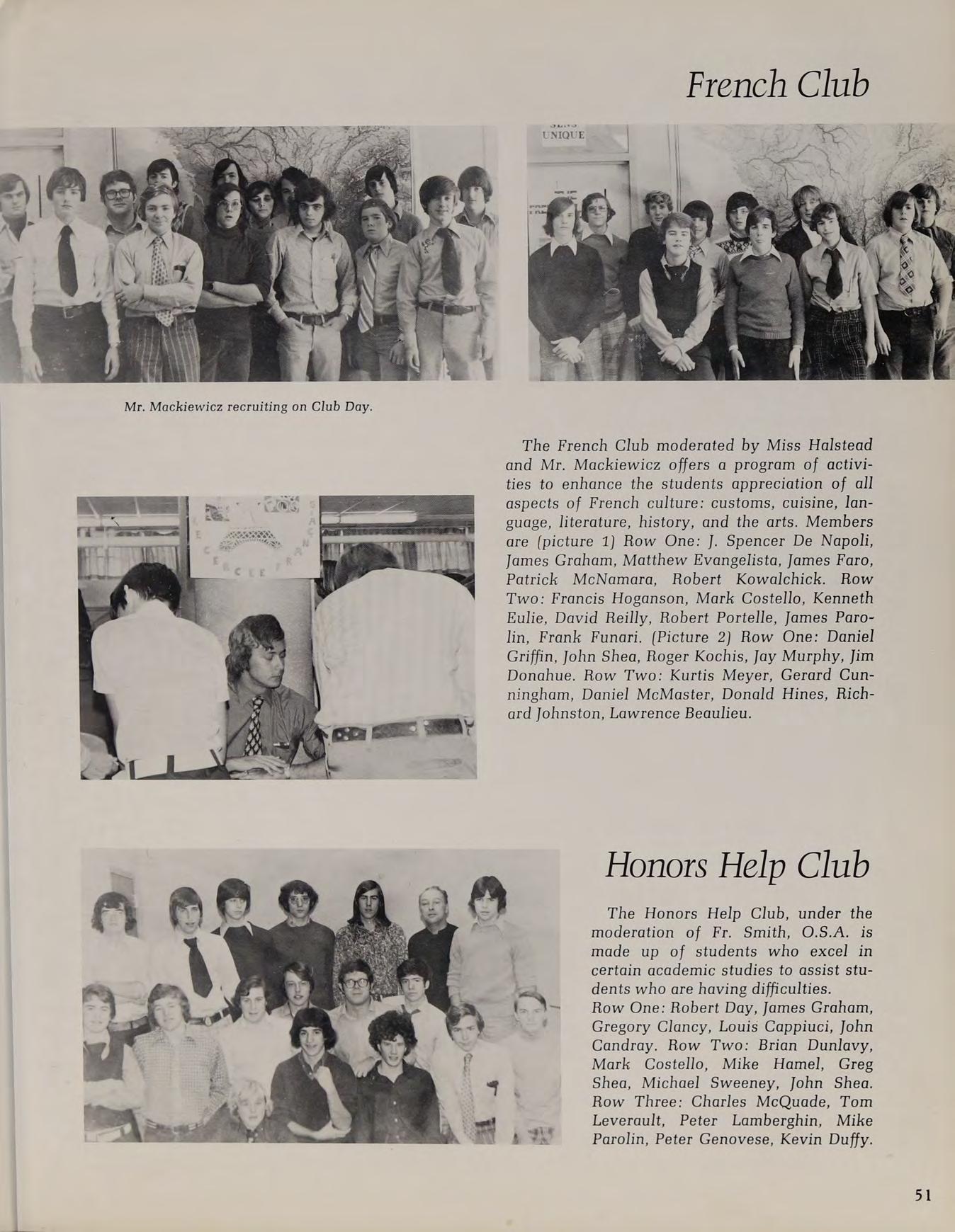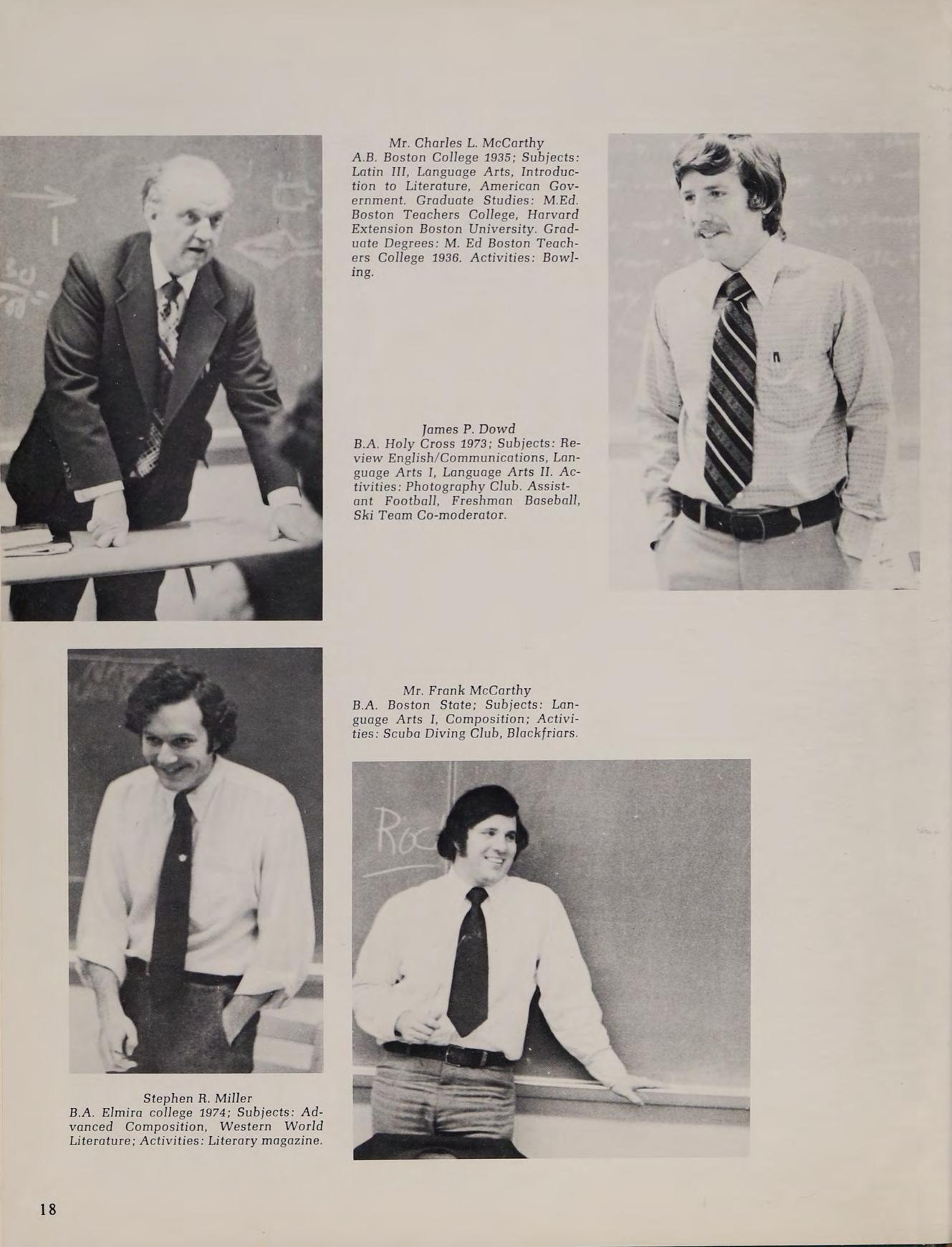B.A. Holy Cross 1973; Subjects: Review English/Communications, Language Arts I, Language Arts II. Activities: Photography Club. Assistant Football, Freshman Baseball, Ski Team Co-moderator.