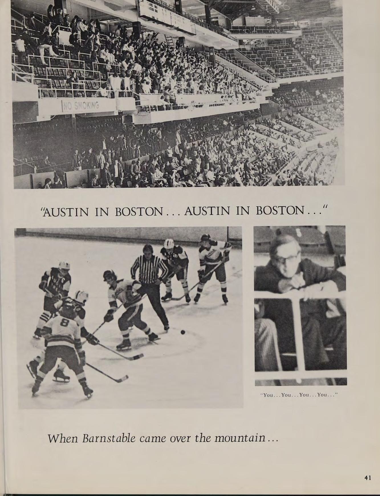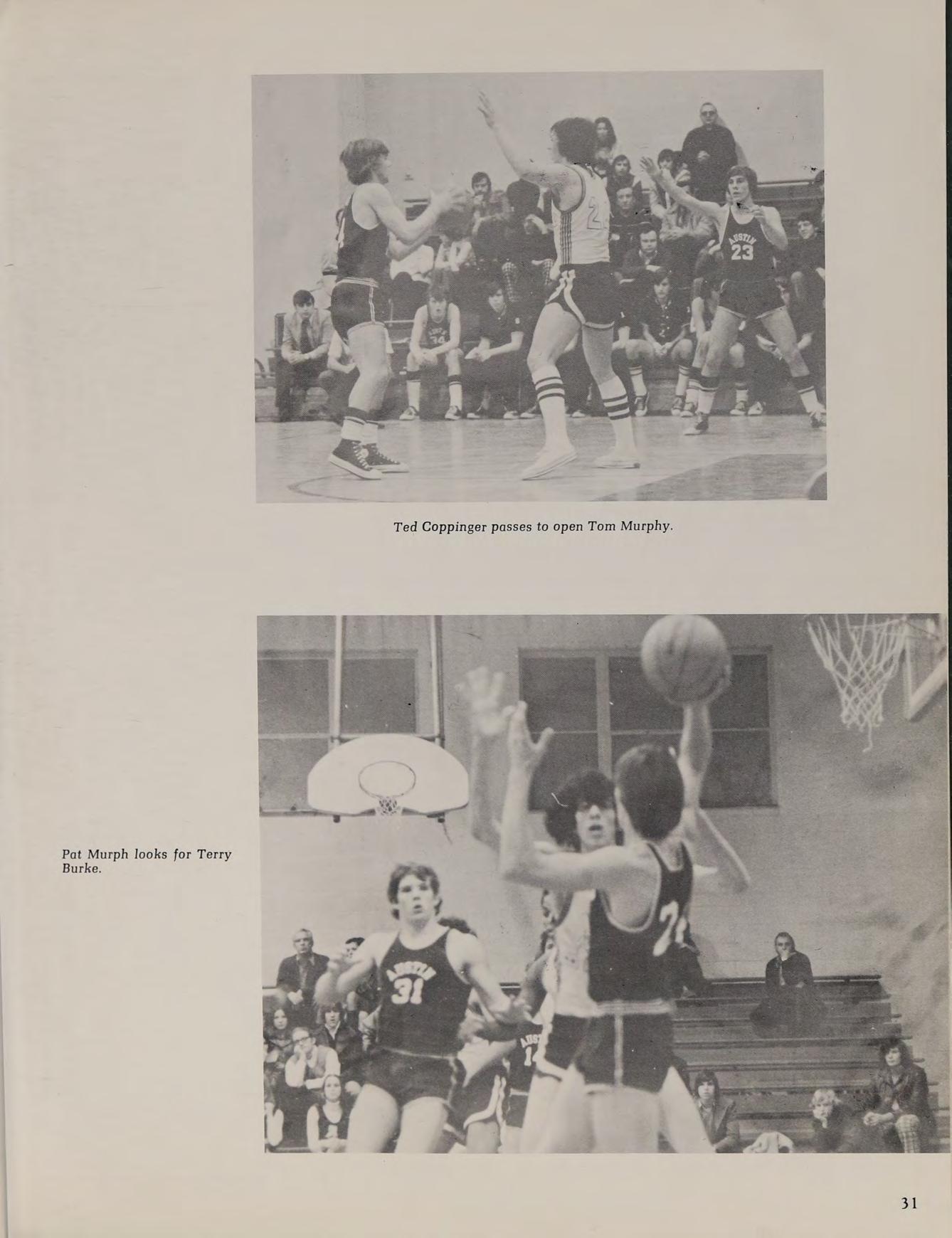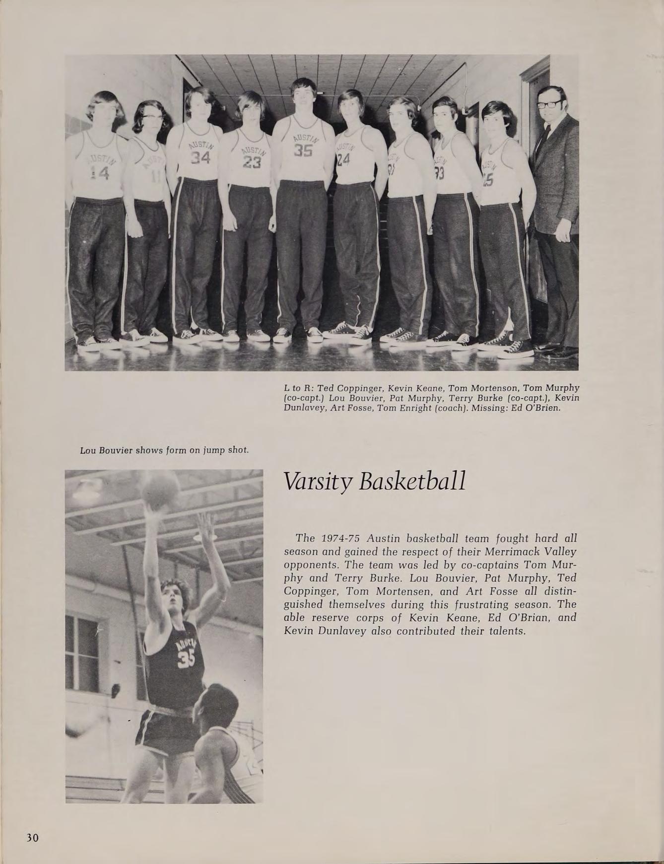 The 1974-75 Austin basketball team fought hard all season and gained the respect of their Merrimack Valley opponents. The team was led by co-captains Tom Murphy and Terry Burke. Lou Bouvier, Pat Murphy, Ted Coppinger, Tom Mortensen, and Art Fosse all distinguished themselves during this frustrating season. The able reserve corps of Kevin Keane, Ed O’Brian, and Kevin Dunlavey also contributed their talents.