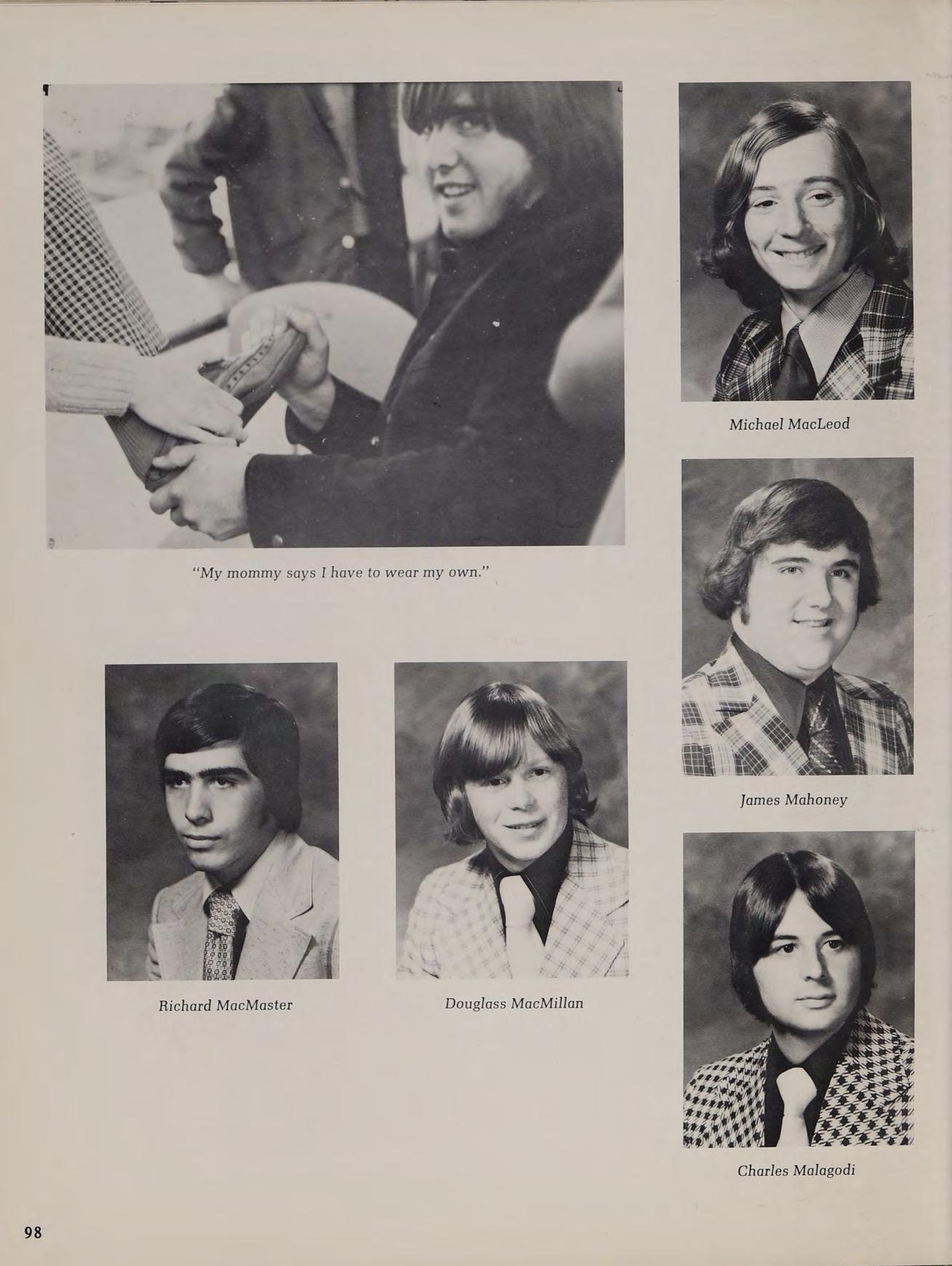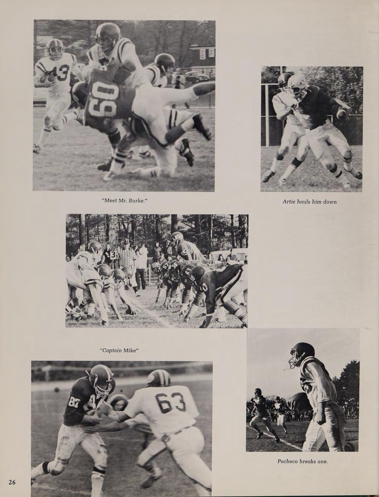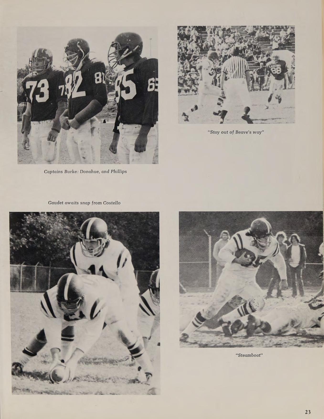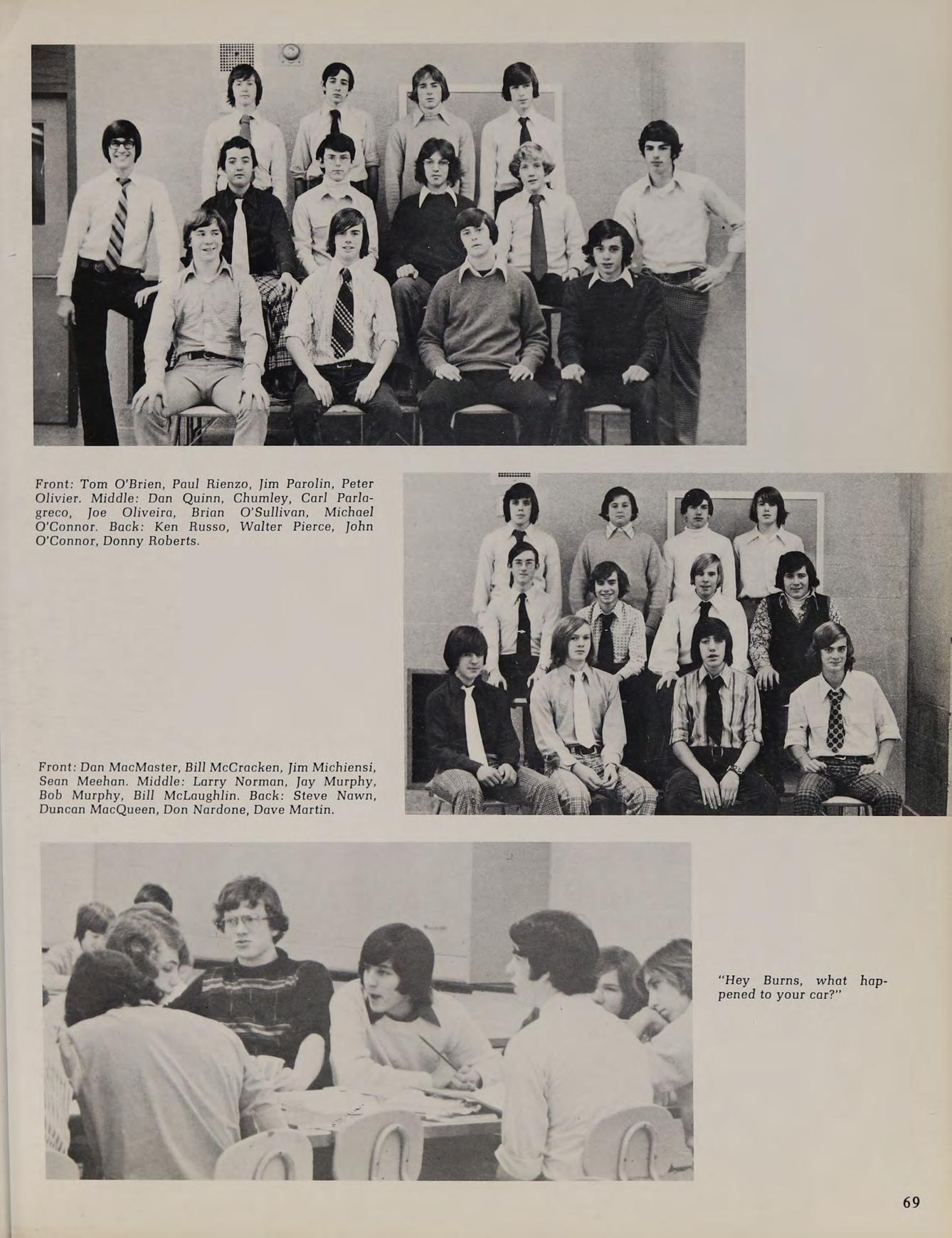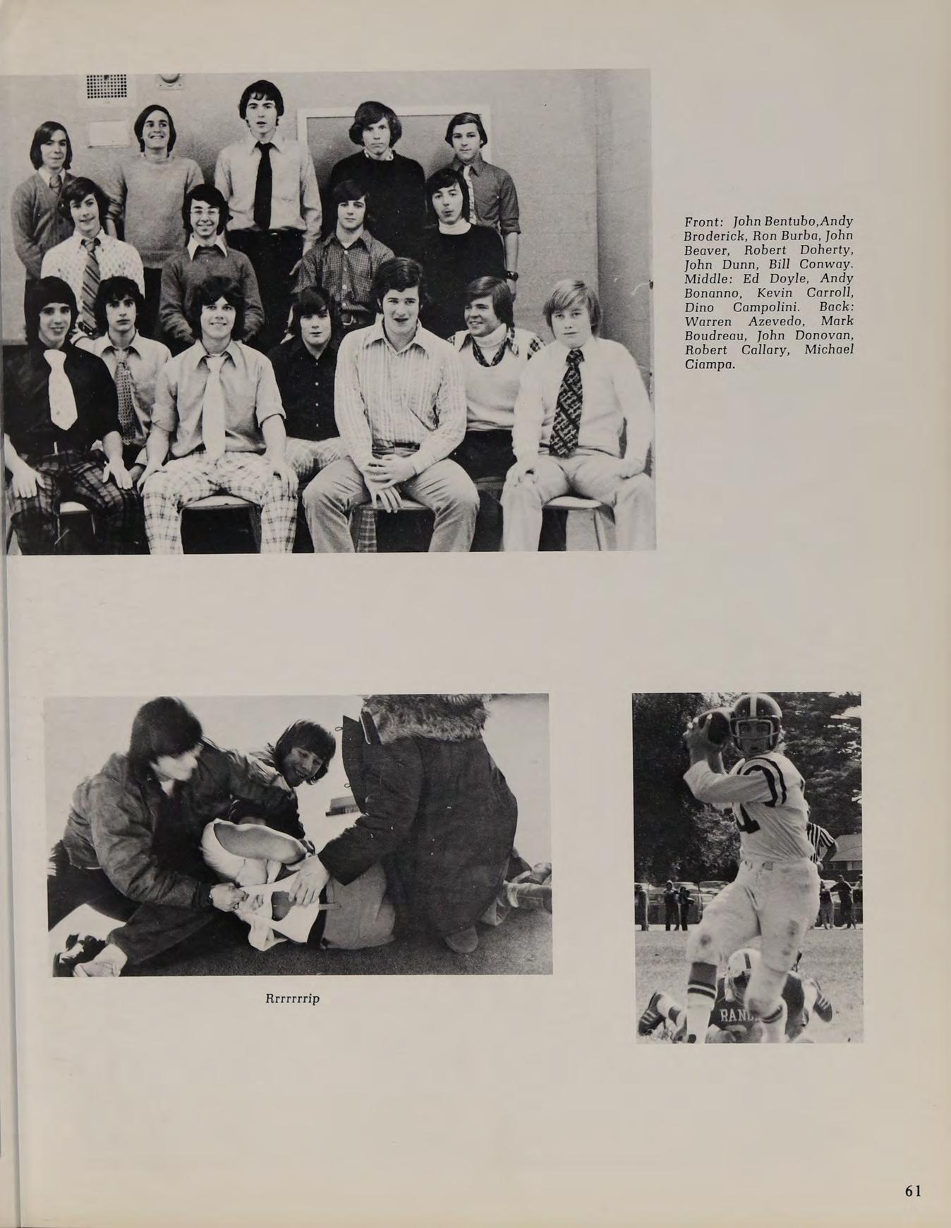 Varsity Football Team: Sitting left to right; S. Burke, W. Twohig, B. Sheehan, J. Perry, B. Pacheco, K. Price, L. Govoni. Kneeling left to right; J. Murphy, J. Beaver, D. Bruno, K. Carrol, T. Marino, D. Hayden, E. Doyle, D. Lavery, D. Beaver, J. Donovan. First row standing from left to right; P. Pacos (trainer), P. Teague, K. Hurley, M. Govoni, A. Fosse, B. Haynes, D. Kelly, D. Patten, J. Dubois, M. Costello, M. Phillips, (Captain), J. Finacharo, E. Daley, R. Farrell, T. Burke, (Captain), R. Smith, M. Donahue, (Captain), J. Land, P. Lamboghini, C. Bruce, (Manager). Back row standing; L. Cumerford, R. Gavin, R. Gagnon, T. Callaghan, M. Loiselle, Z. Mierzwa, M. Clarke, C. Gaudet, K. McConnell, N. Deltorto.