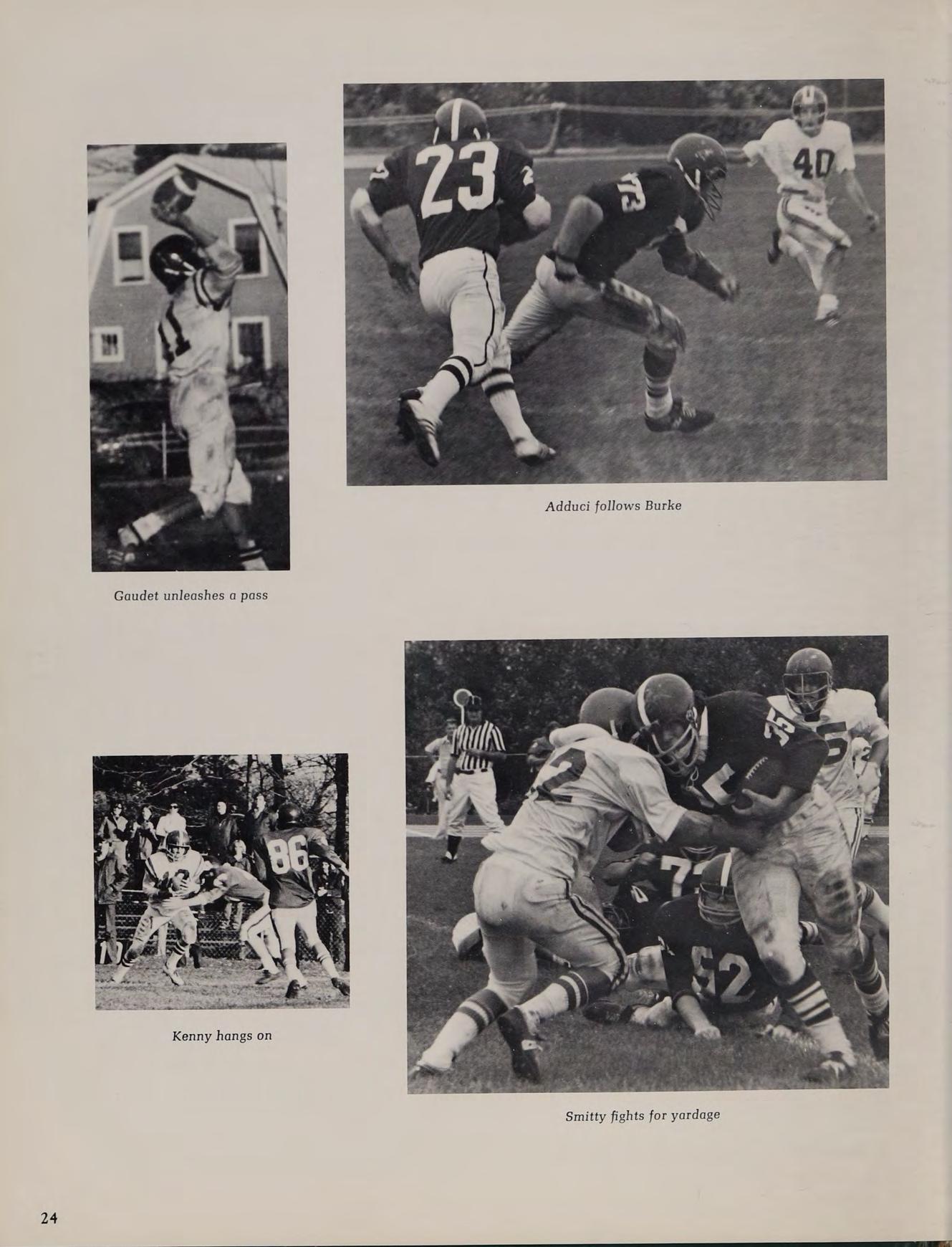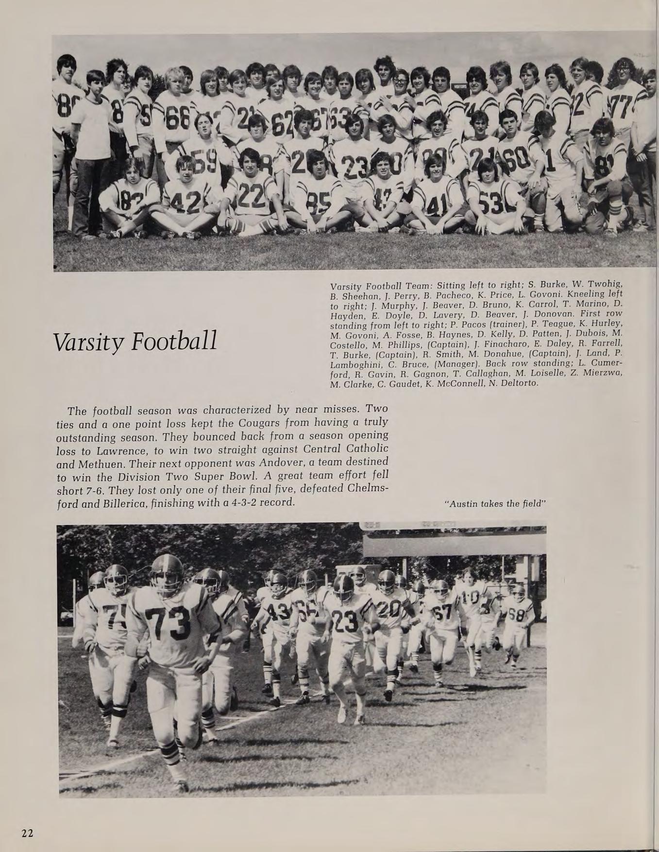 The football season was characterized by near misses. Two ties and a one point loss kept the Cougars from having a truly outstanding season. They bounced back from a season opening loss to Lawrence, to win two straight against Central Catholic and Methuen. Their next opponent was Andover, a team destined to win the Division Two Super Bowl. A great team effort fell short 7-6. They lost only one of their final five, defeated Chelmsford and Billerica, finishing with a 4-3-2 record. Ane tinitaestthenpelda