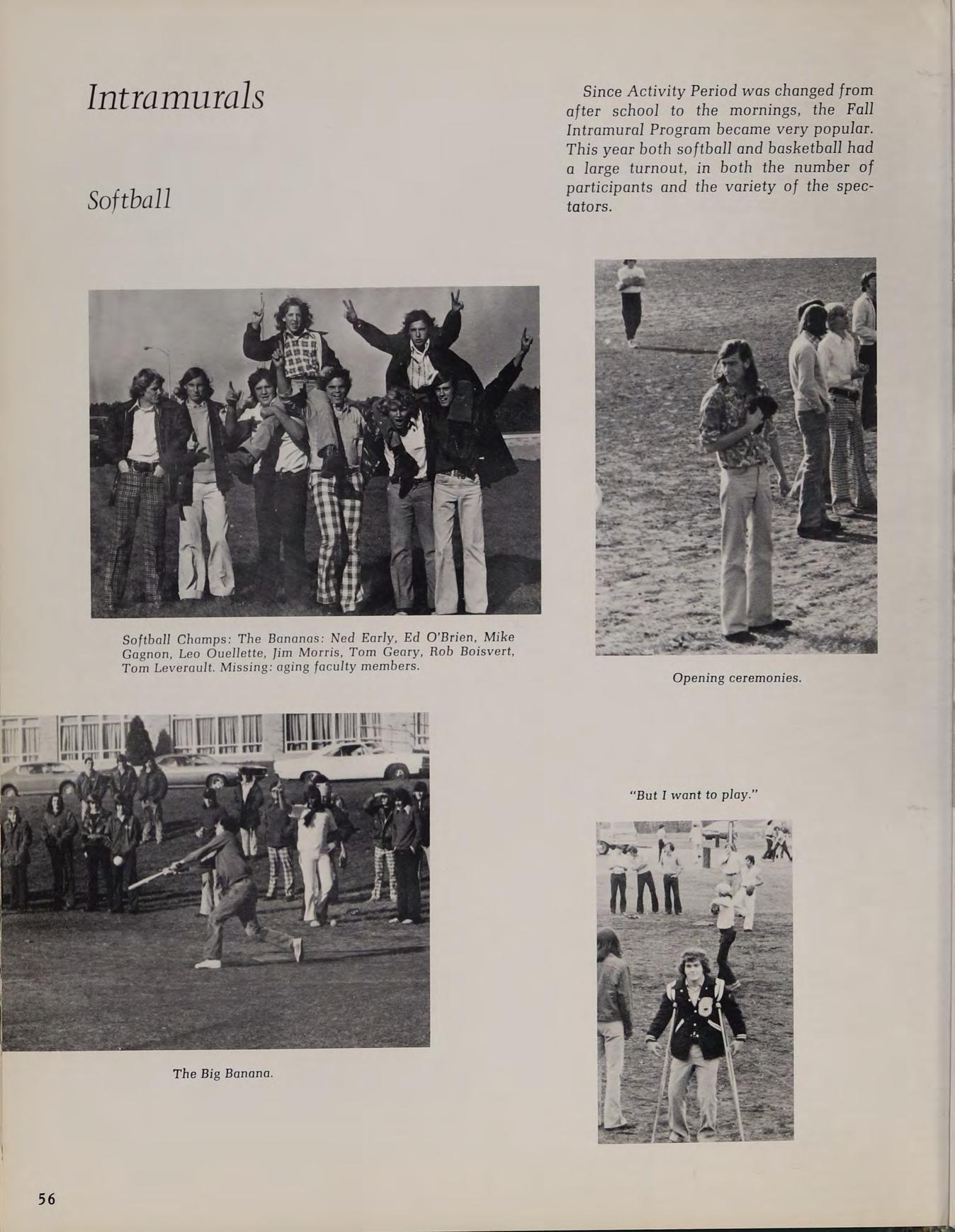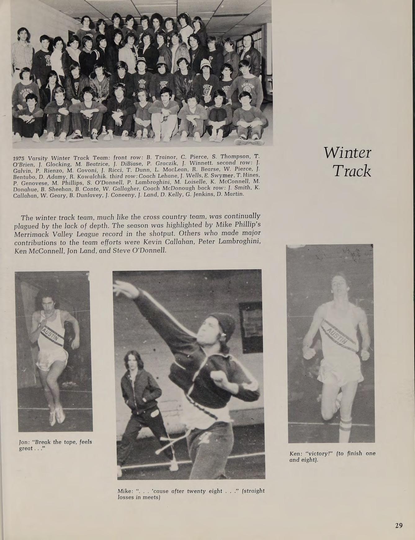The winter track team, much like the cross country team, was continually plagued by the lack of depth. The season was highlighted by Mike Phillip’s Merrimack Valley League record in the shotput. Others who made major contributions to the team efforts were Kevin Callahan, Peter Lambroghini, Ken McConnell, Jon Land, and Steve O’Donnell.