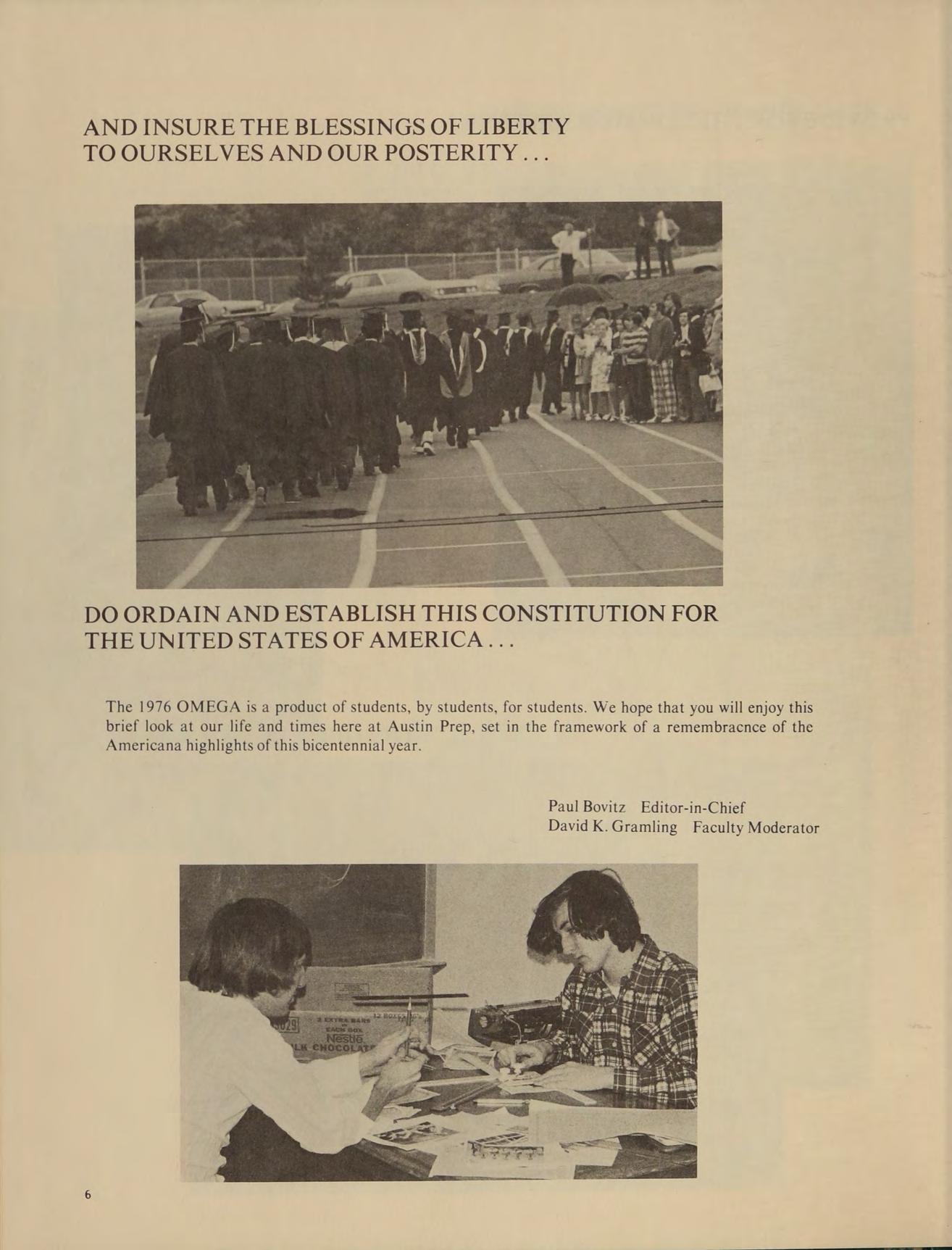 The 1976 OMEGA is a product of students, by students, for students. We hope that you will enjoy this brief look at our life and times here at Austin Prep, set in the framework of a remembracnce of the Americana highlights of this bicentennial year.