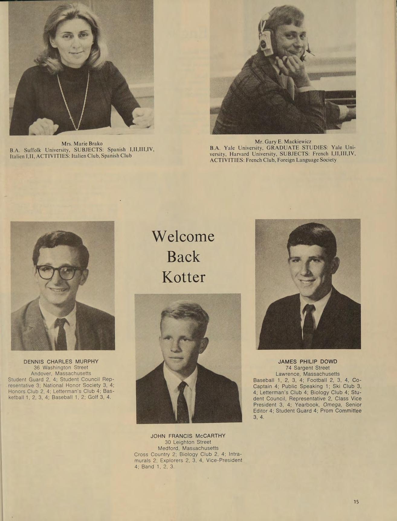 A.B. Boston College, GRADUATE STUDIES: M.ED. Boston Teachers College, SUBJECTS: American Government, French II, Ancient and Medieval History, ACTIVITIES: Current Events Club