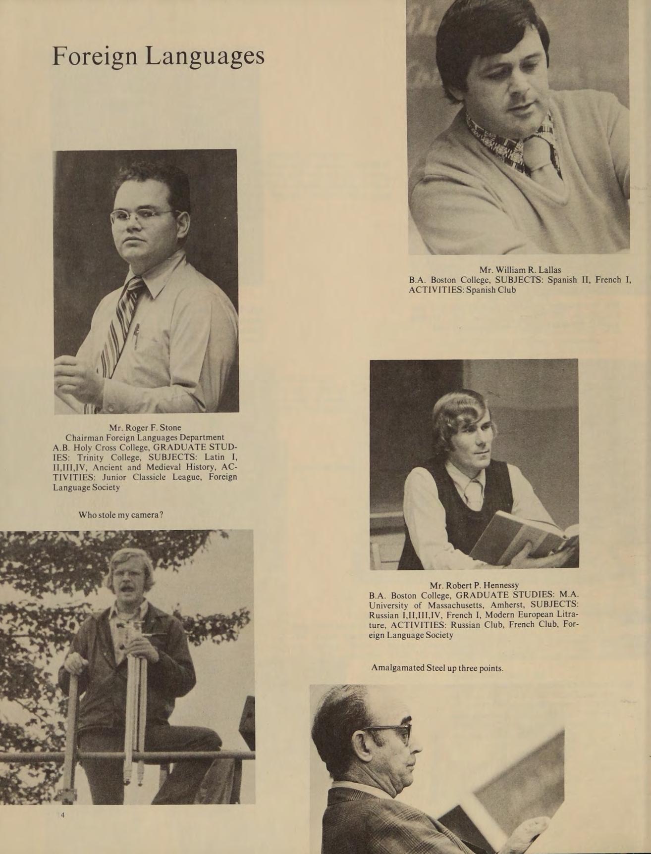 B.A. Boston College, GRADUATE STUDIES: M.A. University of Massachusetts, Amherst, SUBJECTS: Russian I,II,II1,1V, French I, Modern European Litrature, ACTIVITIES: Russian Club, French Club, Foreign Language Society