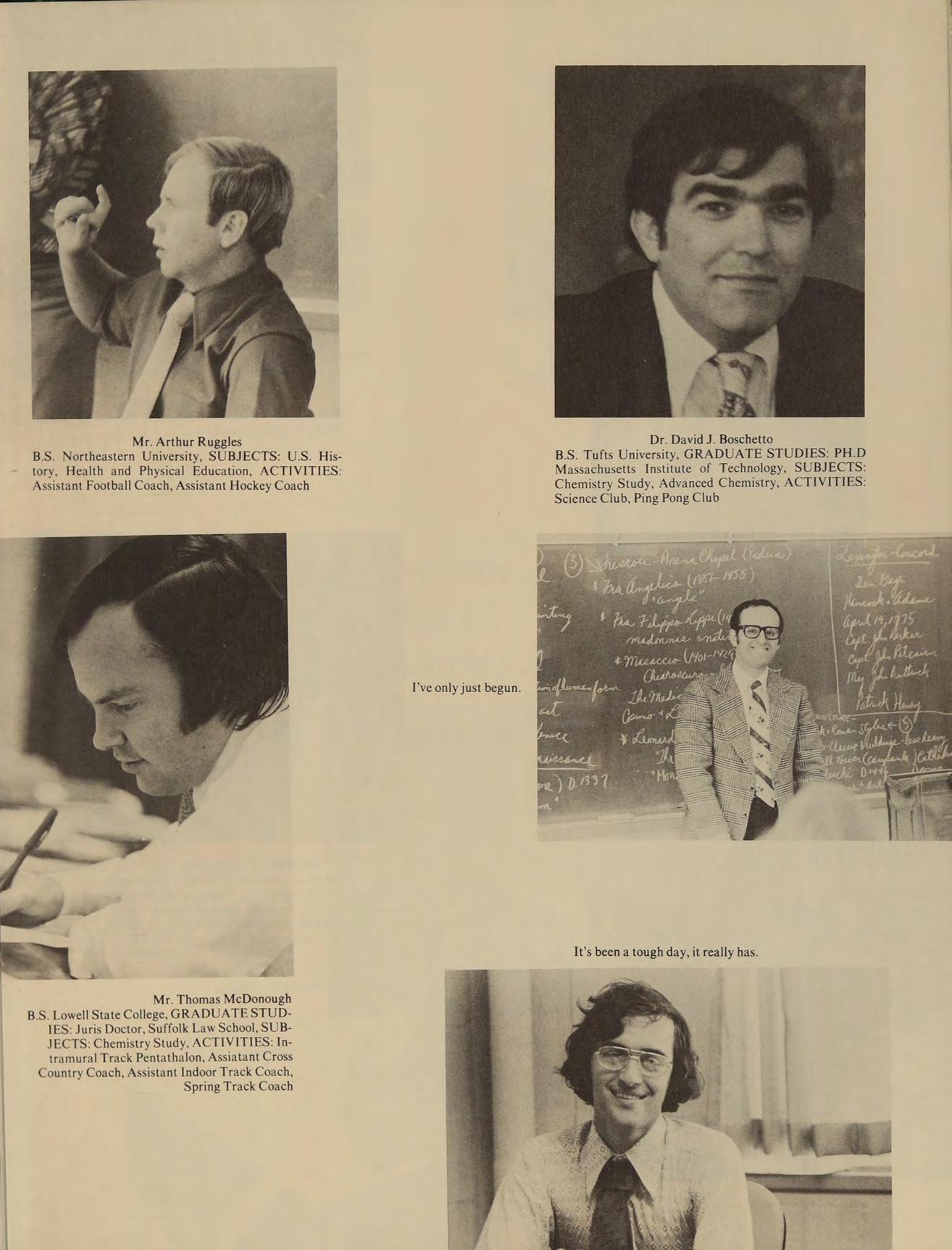 B.S. Tufts University, GRADUATE STUDIES: PH.D tory, Health and Physical Education, ACTIVITIES: Massachusetts Institute of Technology, SUBJECTS: Assistant Football Coach, Assistant Hockey Coach Chemistry Study, Advanced Chemistry, ACTIVITIES: Science Club, Ping Pong Club