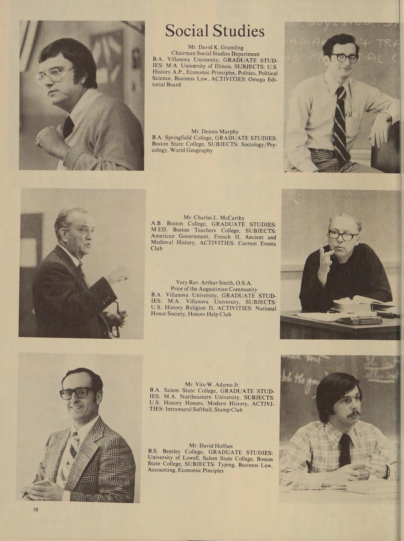 B.A. Villanova University, GRADUATE STUD- IES: M.A. University of Illinois, SUBJECTS: U.S. History A.P., Economic Principles, Politics, Political Science, Business Law, ACTIVITIES: Omega Editorial Board