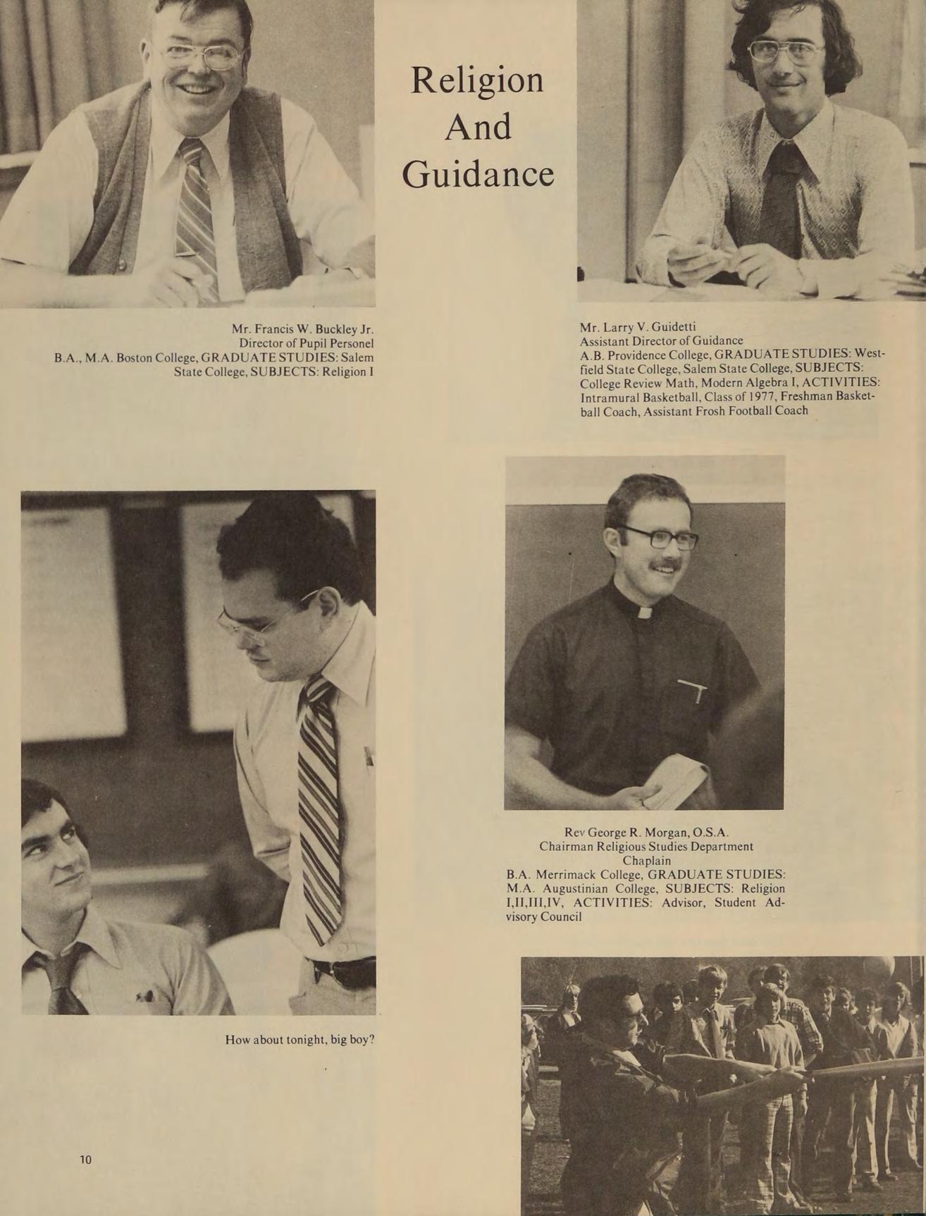 A.B. Providence College, GRADUATE STUDIES: WestState College, SUBJECTS: Religion I field State College, Salem State College, SUBJECTS: College Review Math, Modern Algebra I, ACTIVITIES: Intramural Basketball, Class of 1977, Freshman Basketball Coach, Assistant Frosh Football Coach