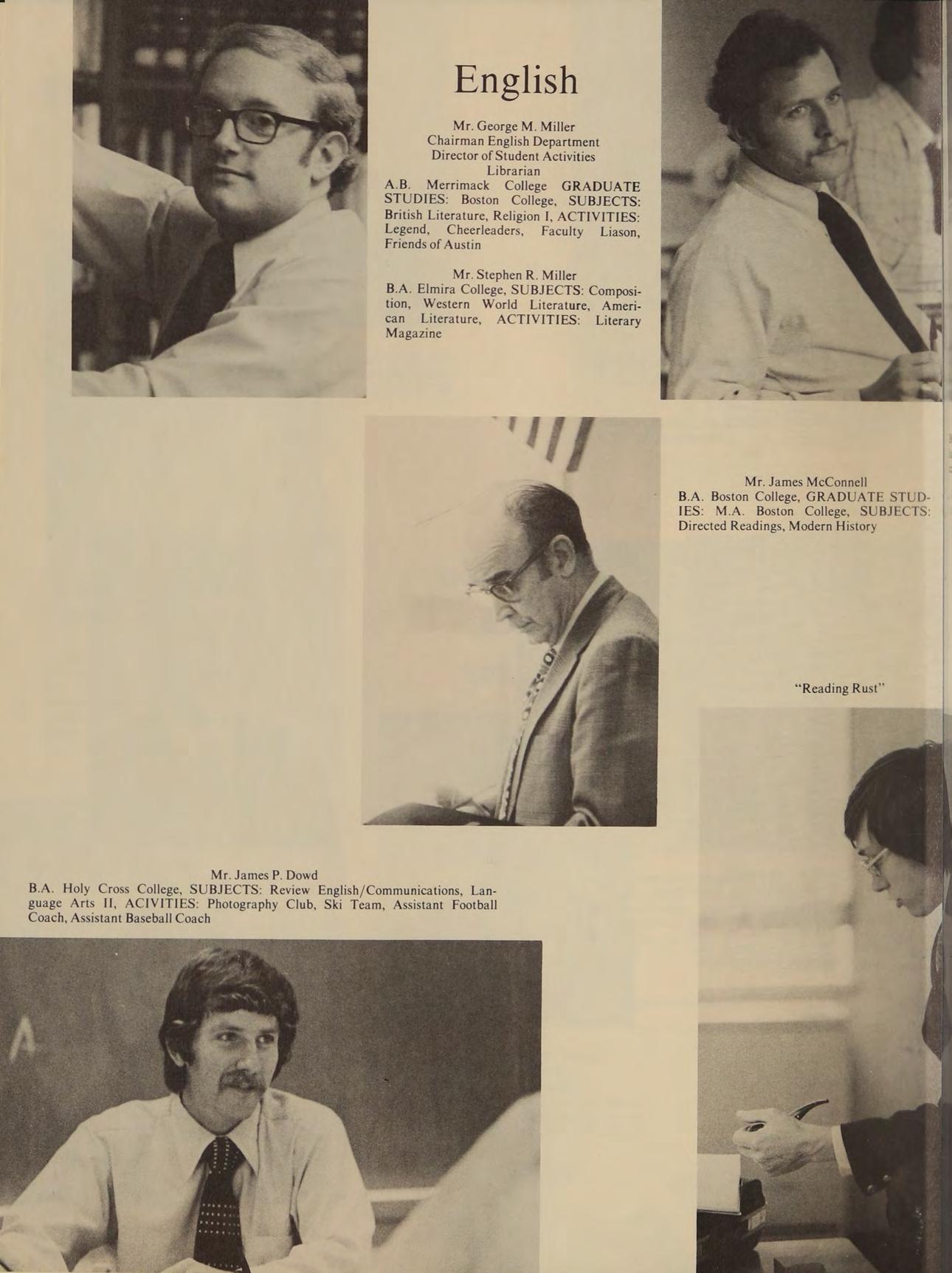 A.B. Merrimack College GRADUATE STUDIES: Boston College, SUBJECTS: British Literature, Religion I, ACTIVITIES: Legend, Cheerleaders, Faculty Liason, Friends of Austin