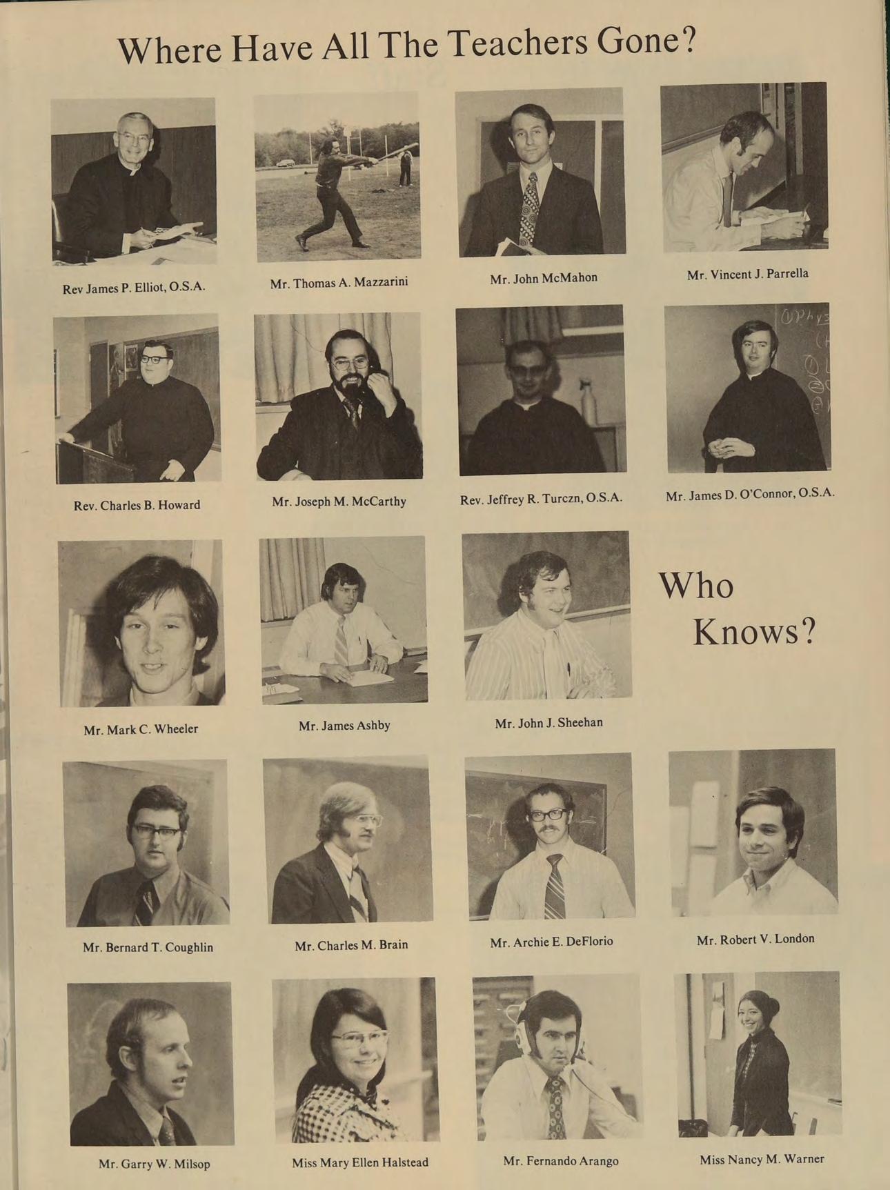 B.A. Villanova University, GRADUATE STUDIES: MSS. Villanova University, M.A. Augustinian College, SUBJECTS: Religion I, Special/Funcions, ACTIVITIES: Friends of Austin Athletic Committee, Frosh Football Coach