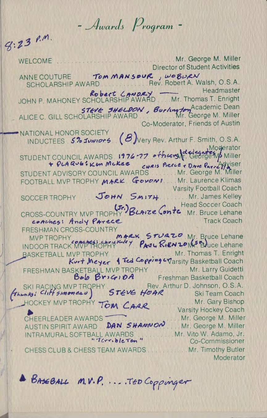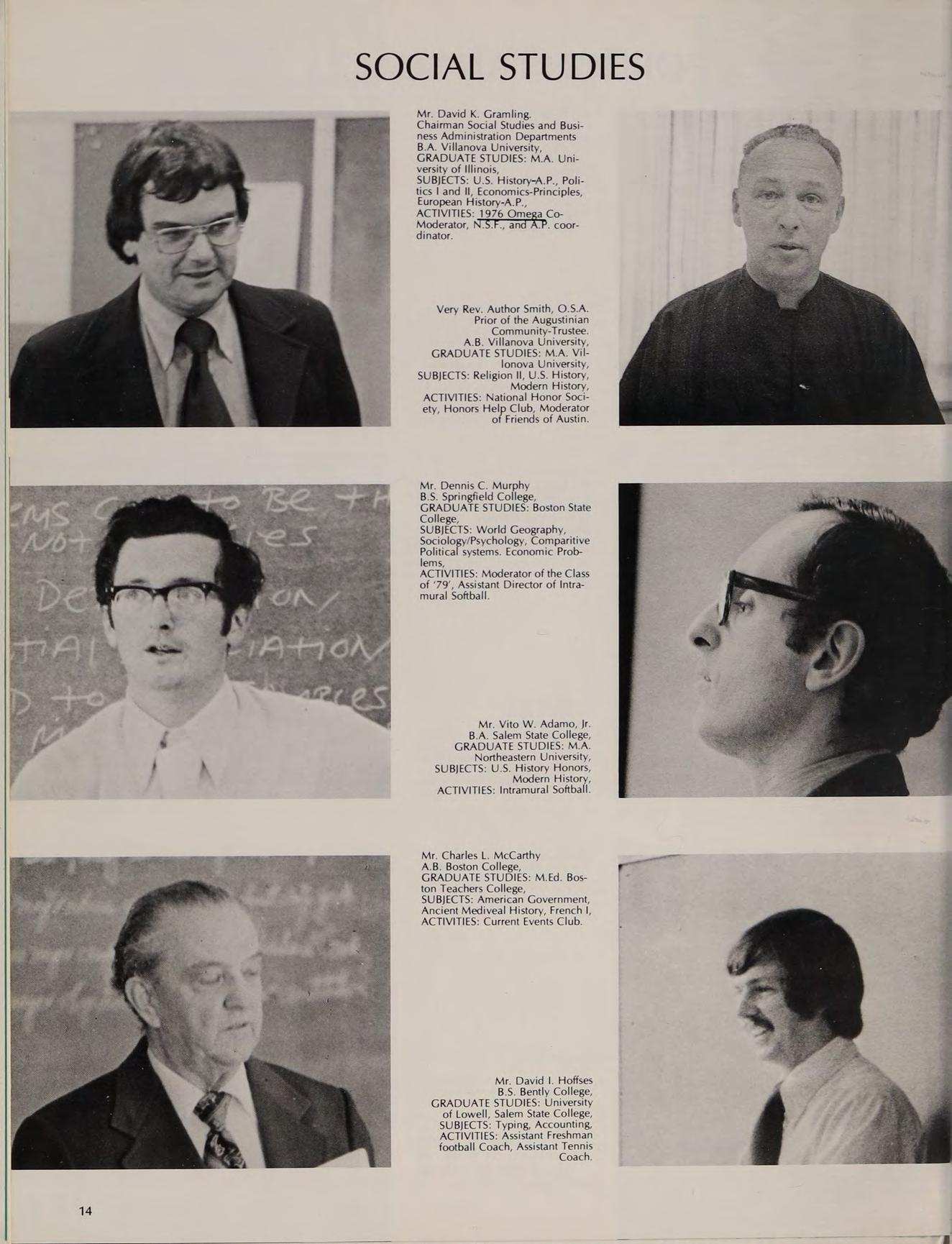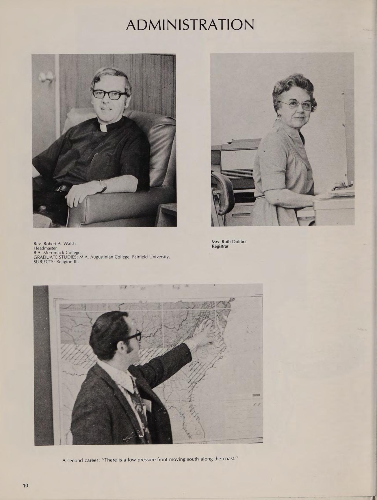Very Rev. Author Smith, O.S.A. Prior of the Augustinian Community-Trustee. A.B. Villanova University, GRADUATE STUDIES: M.A. Villonova University, SUBJECTS: Religion Il, U.S. History, Modern History, ACTIVITIES: National Honor Society, Honors oer Club, Moderator of Friends of Austin.