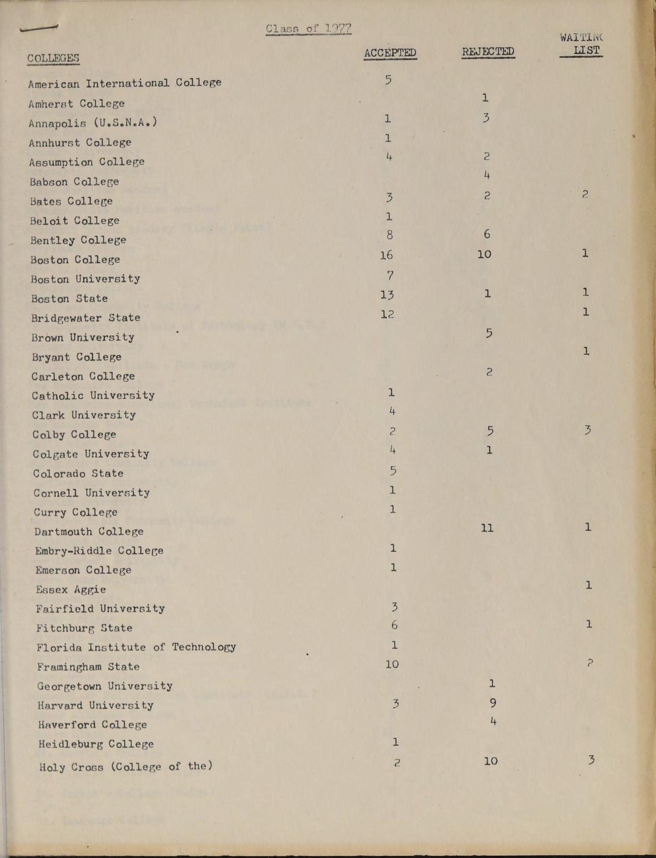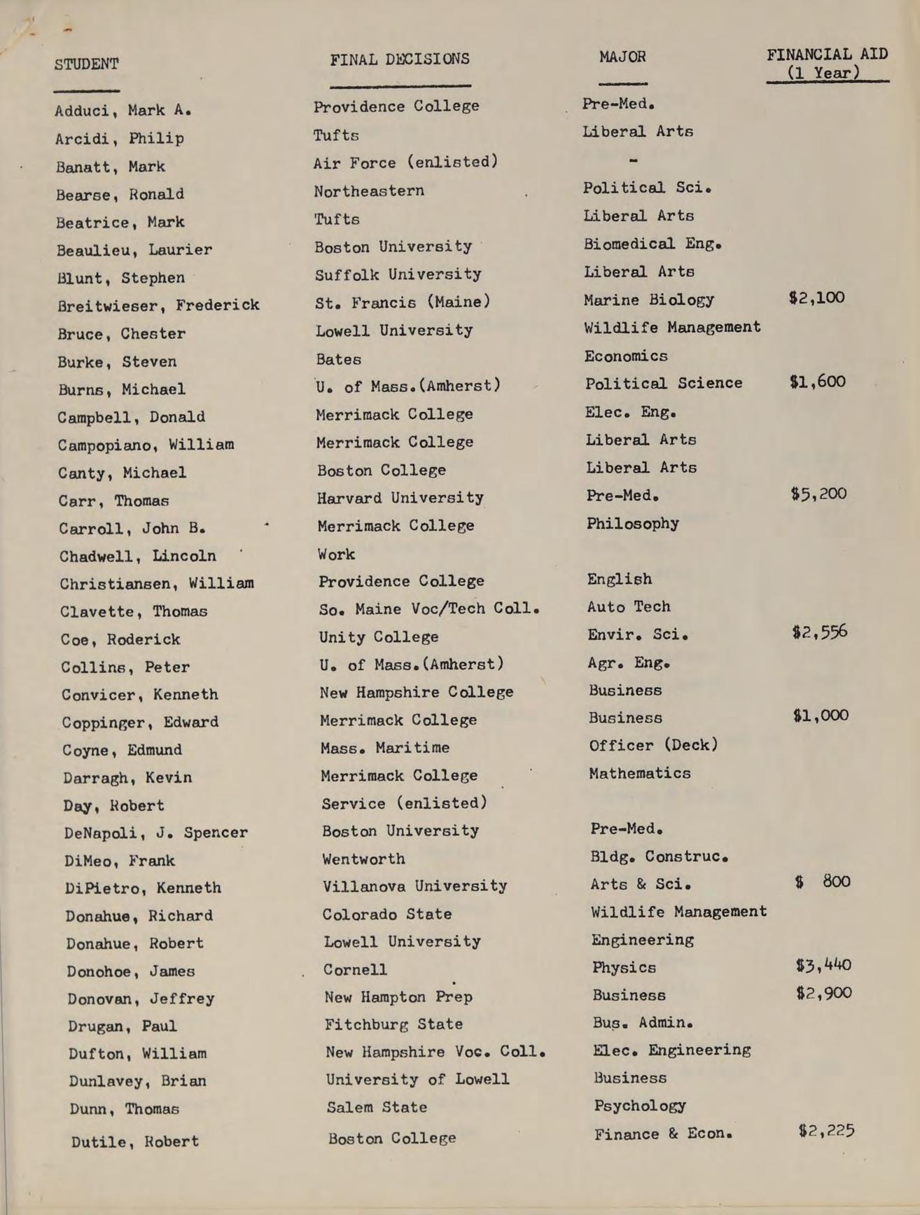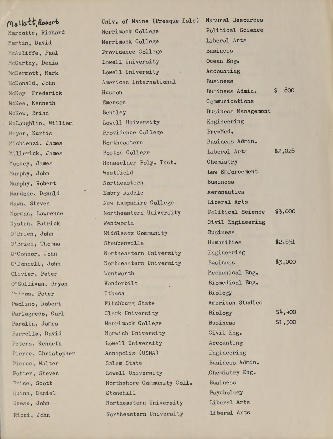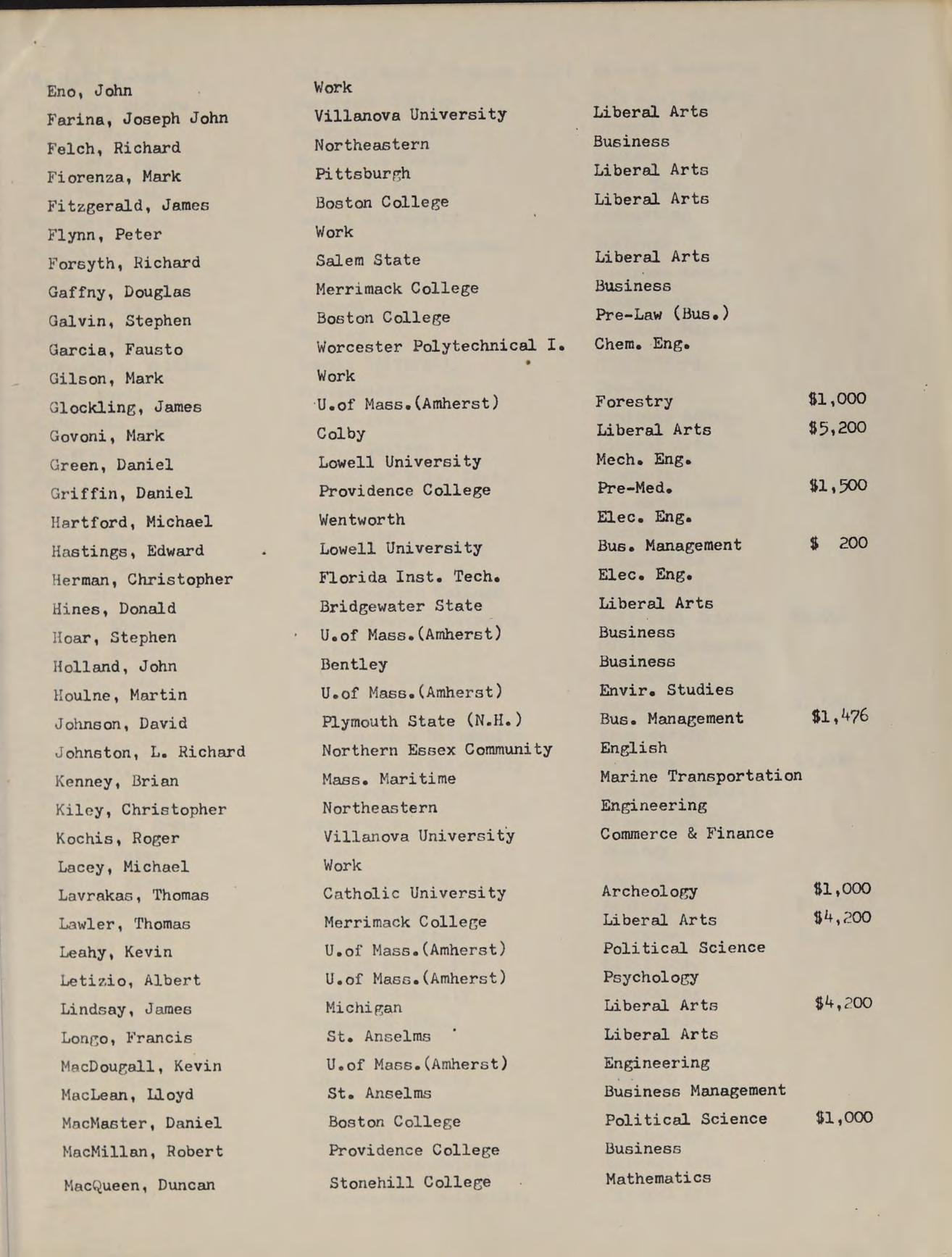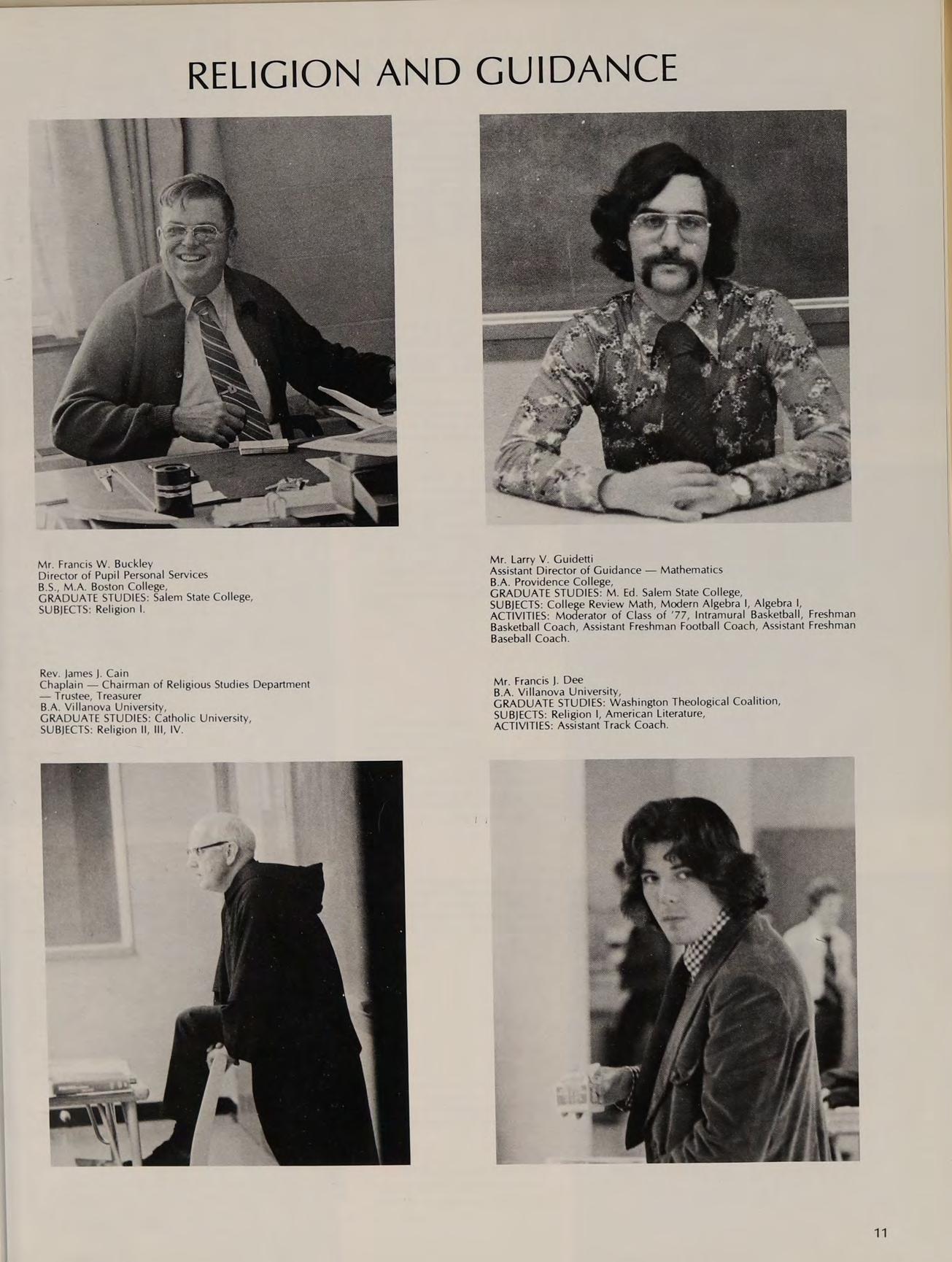 B.A. Providence College, GRADUATE STUDIES: M. Ed. Salem State College, SUBJECTS: College Review Math, Modern Algebra |, Algebra |, ACTIVITIES: Moderator of Class of ‘77, Intramural Basketball, Freshman Basketball Coach, Assistant Freshman Football Coach, Assistant Freshman Baseball Coach.
